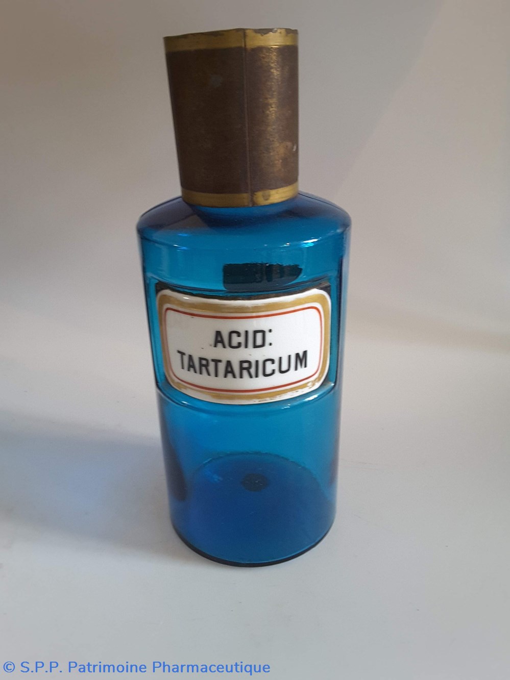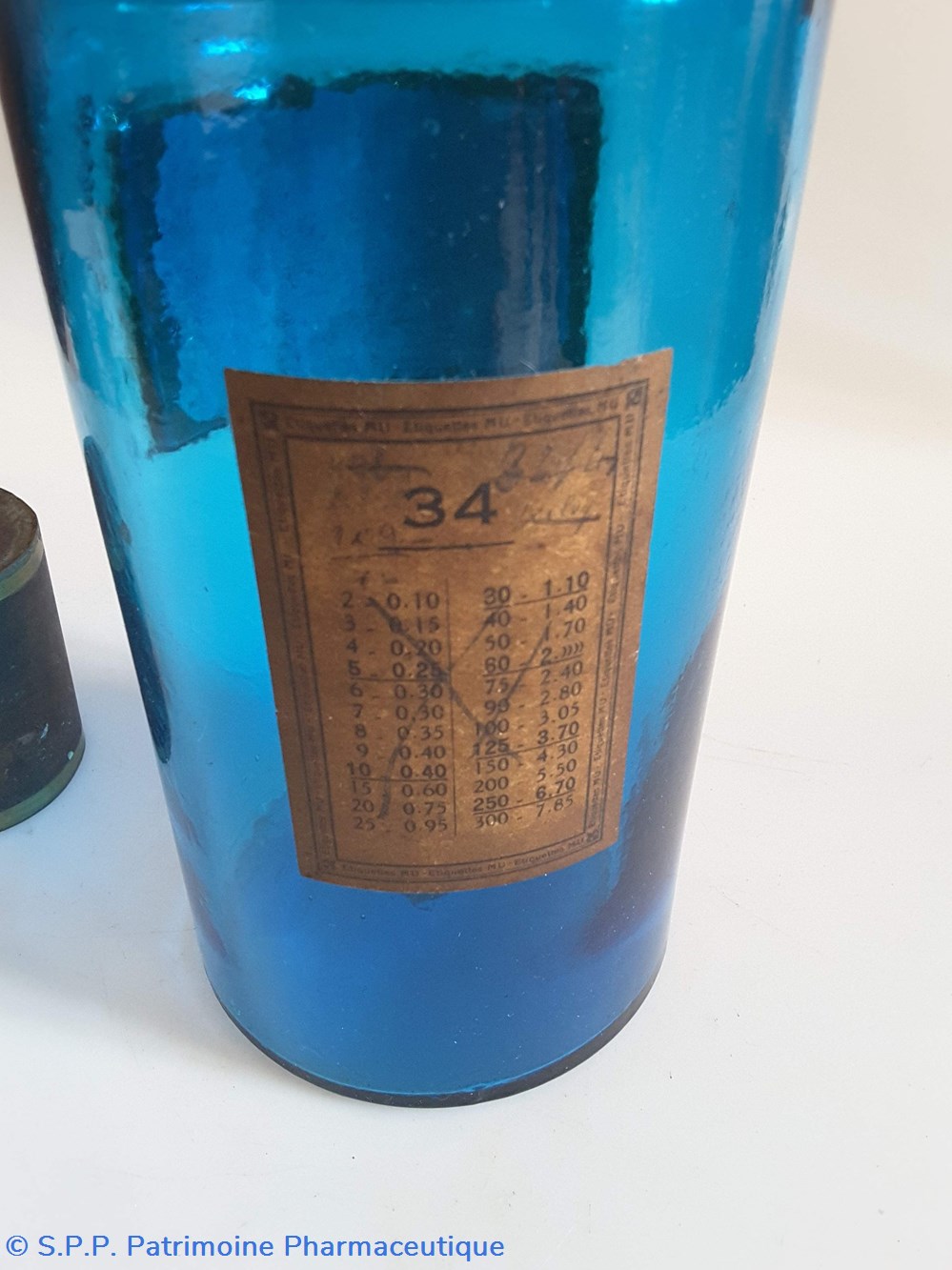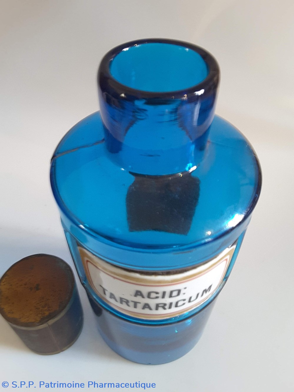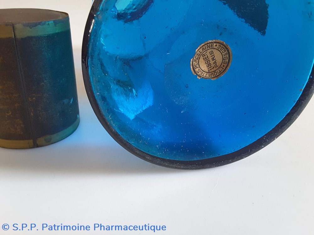 Pot bleu en verre surmonté d'un couvecle en tôle Etiquette en porcelaine avec contour rouge et or