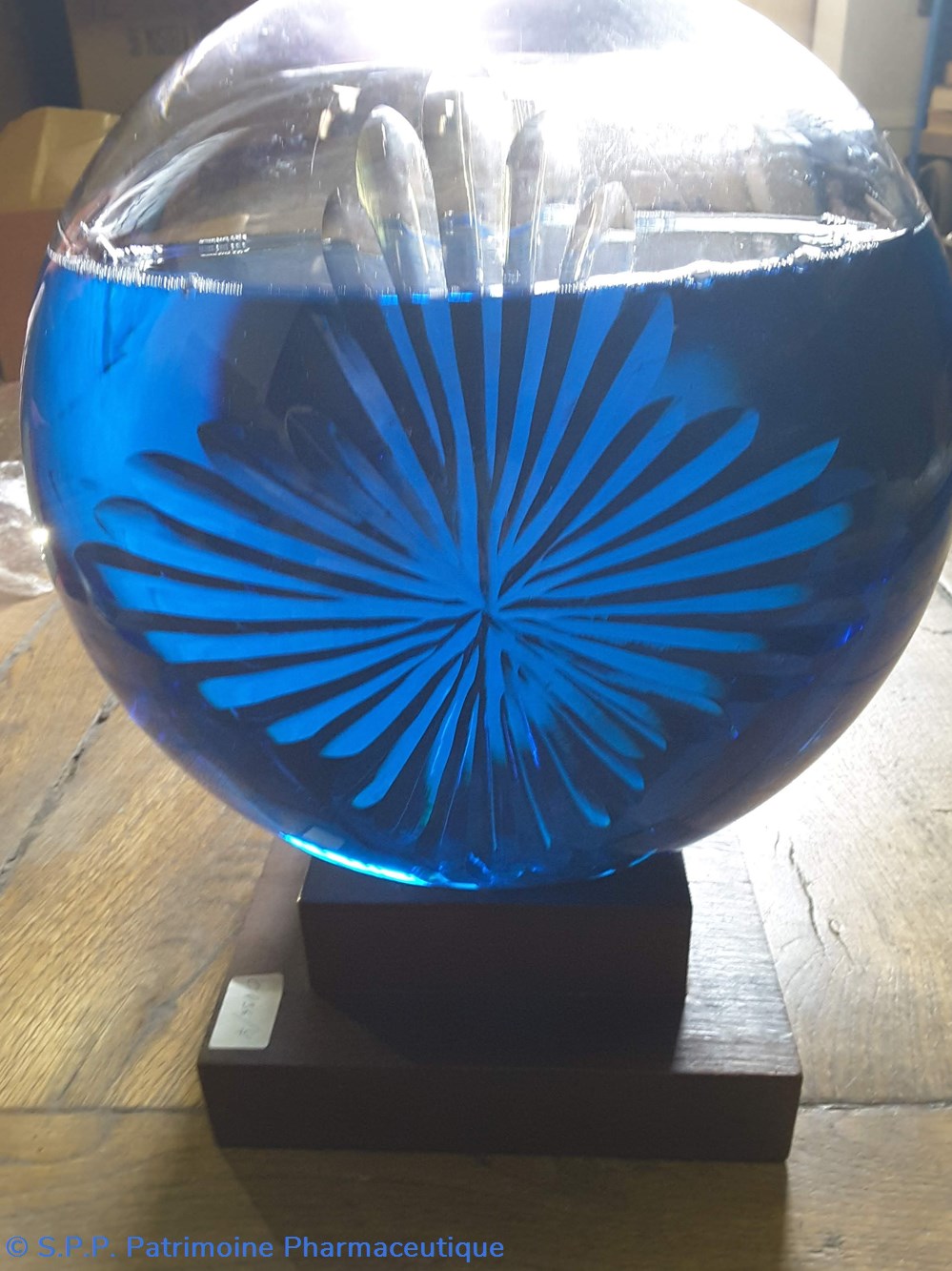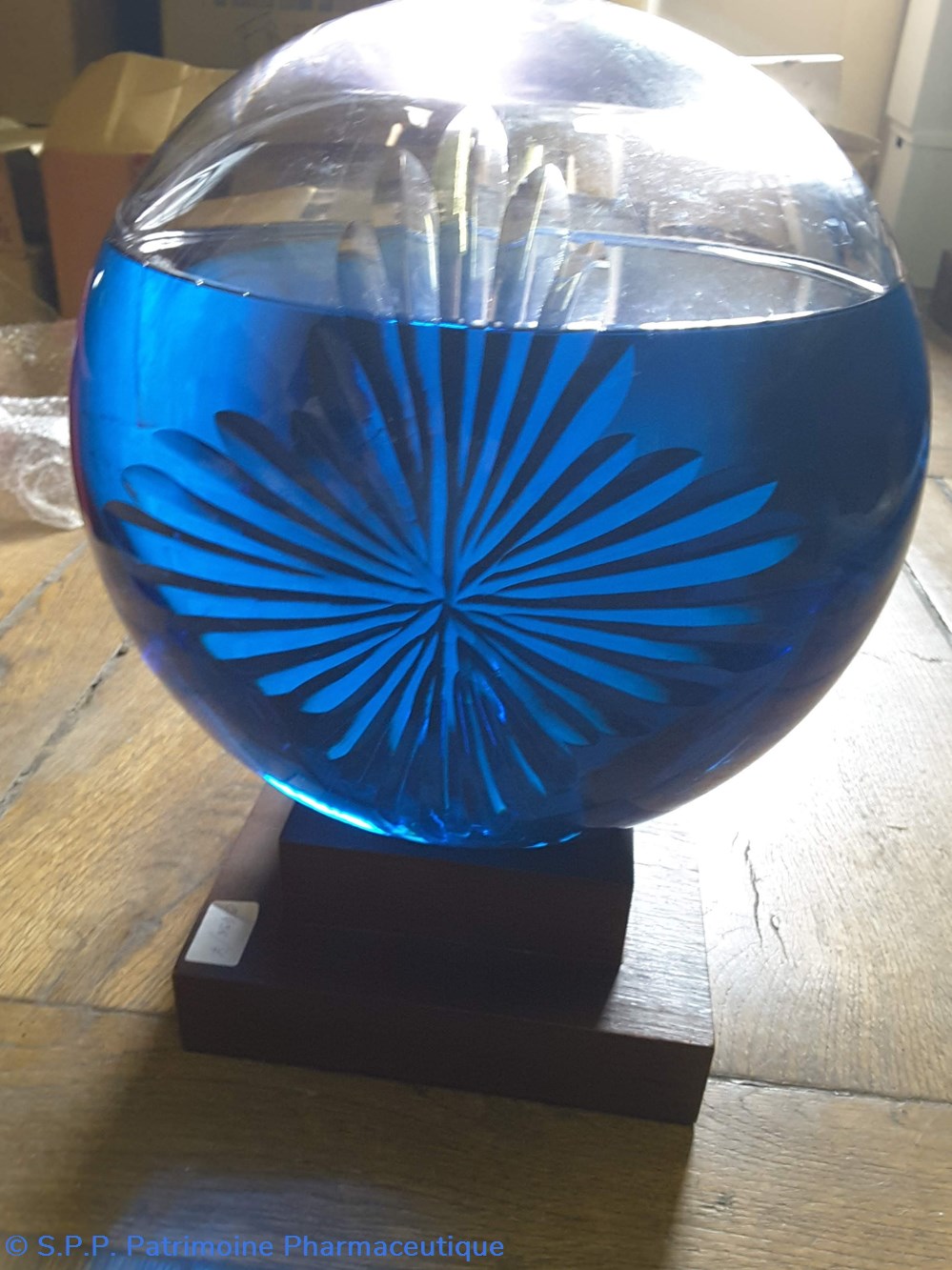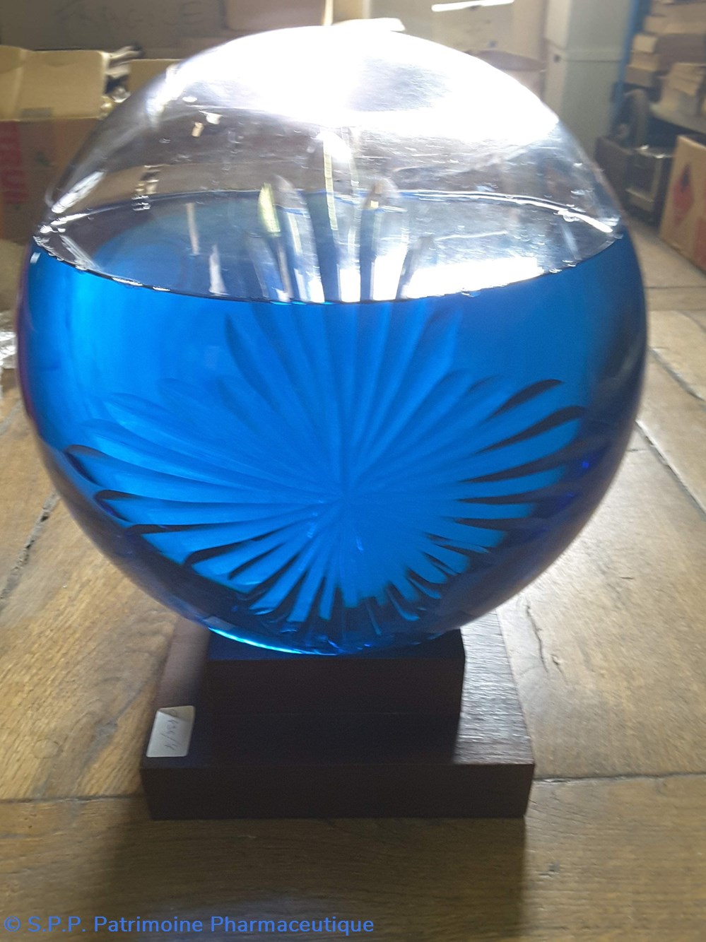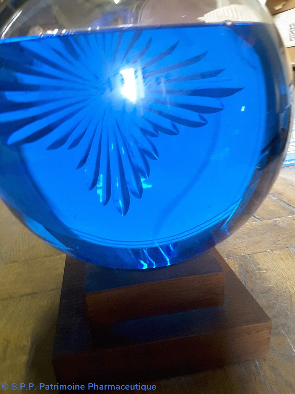 Pot bleu en verre surmonté d'un couvecle en tôle Etiquette en porcelaine avec contour rouge et or