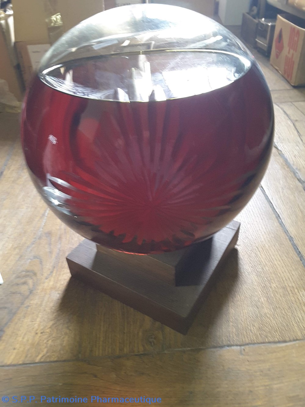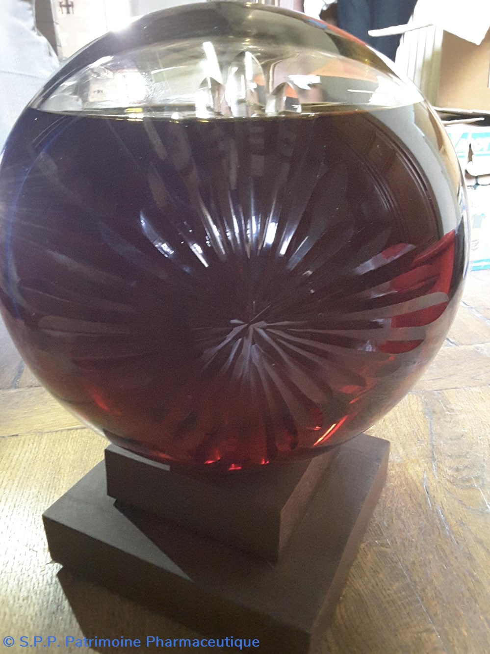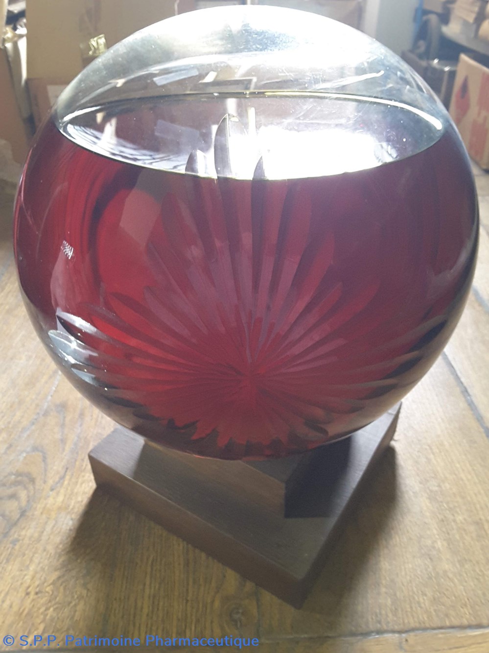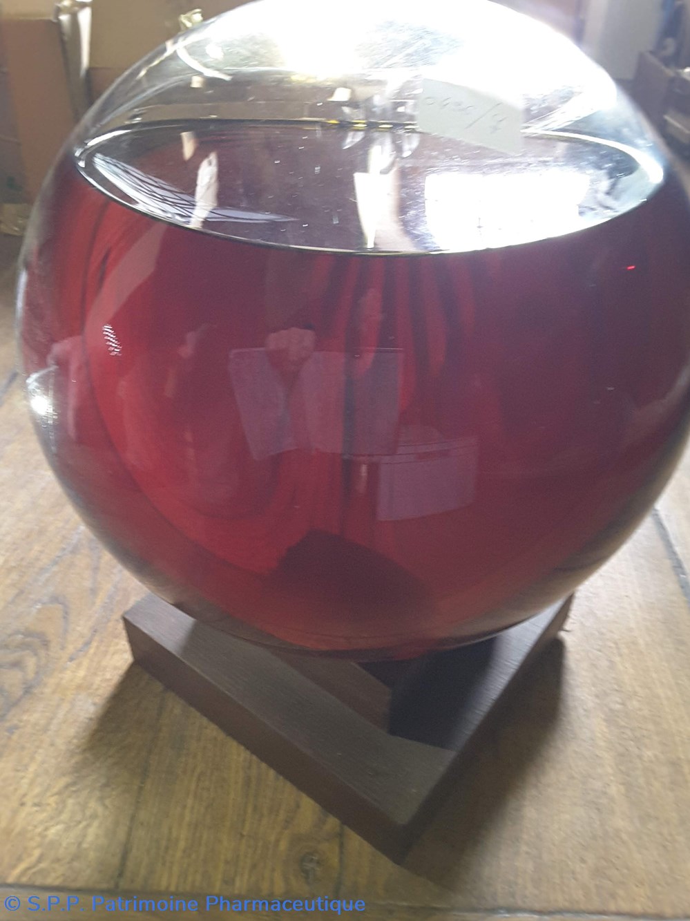 Pot bleu en verre surmonté d'un couvecle en tôle Etiquette en porcelaine avec contour rouge et or