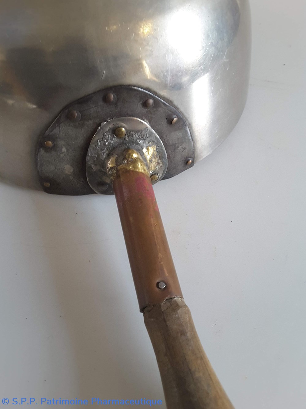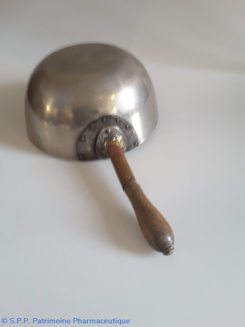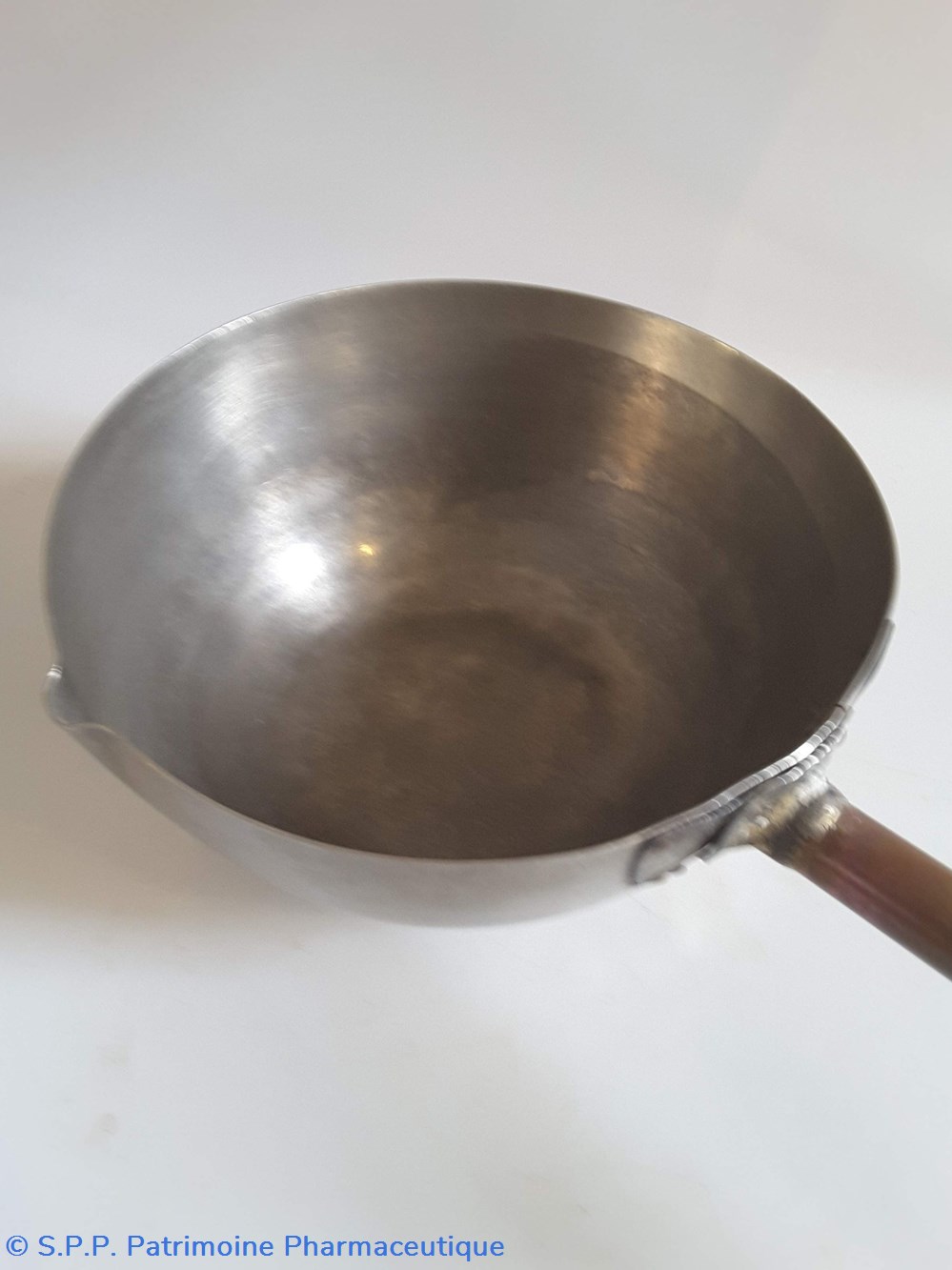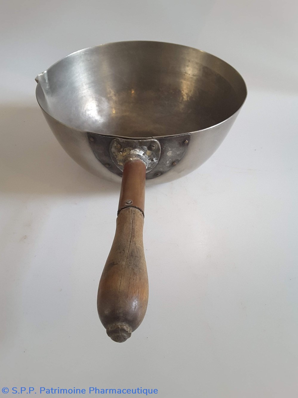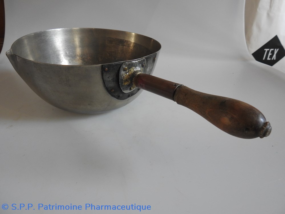 Récipient hémi-sphérique en étain avec un manche en bois avec versoir.