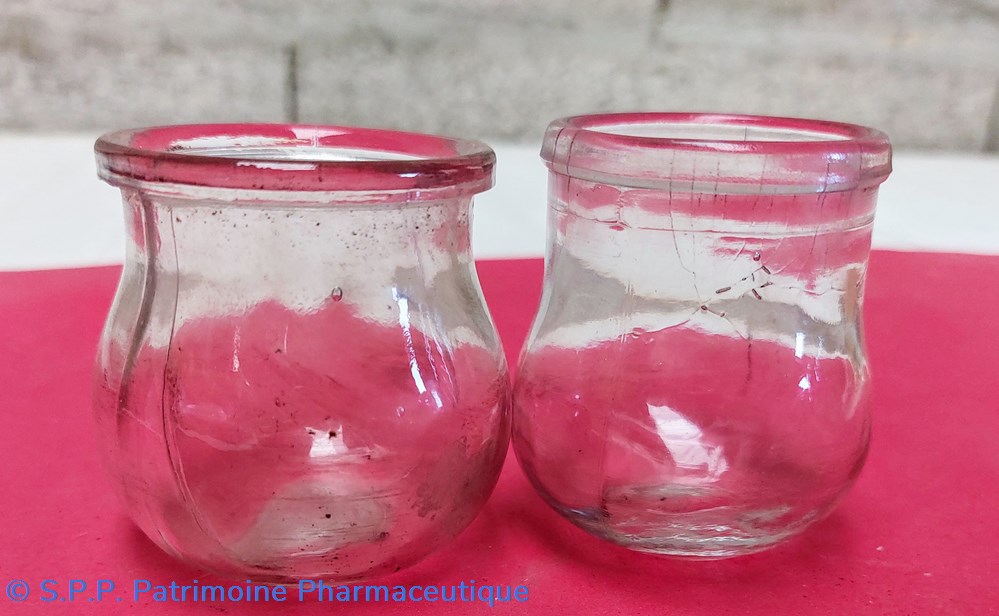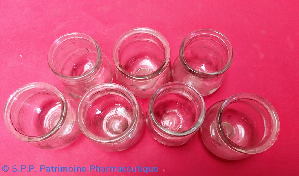 7 ventouses en forme de cloche de verre ou pot à yaourt. Hauteur 4,5 cm Diamètre de l'ouverture 4 cm. Fond plat.