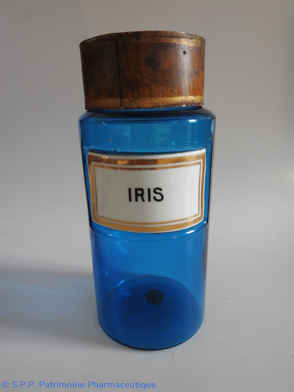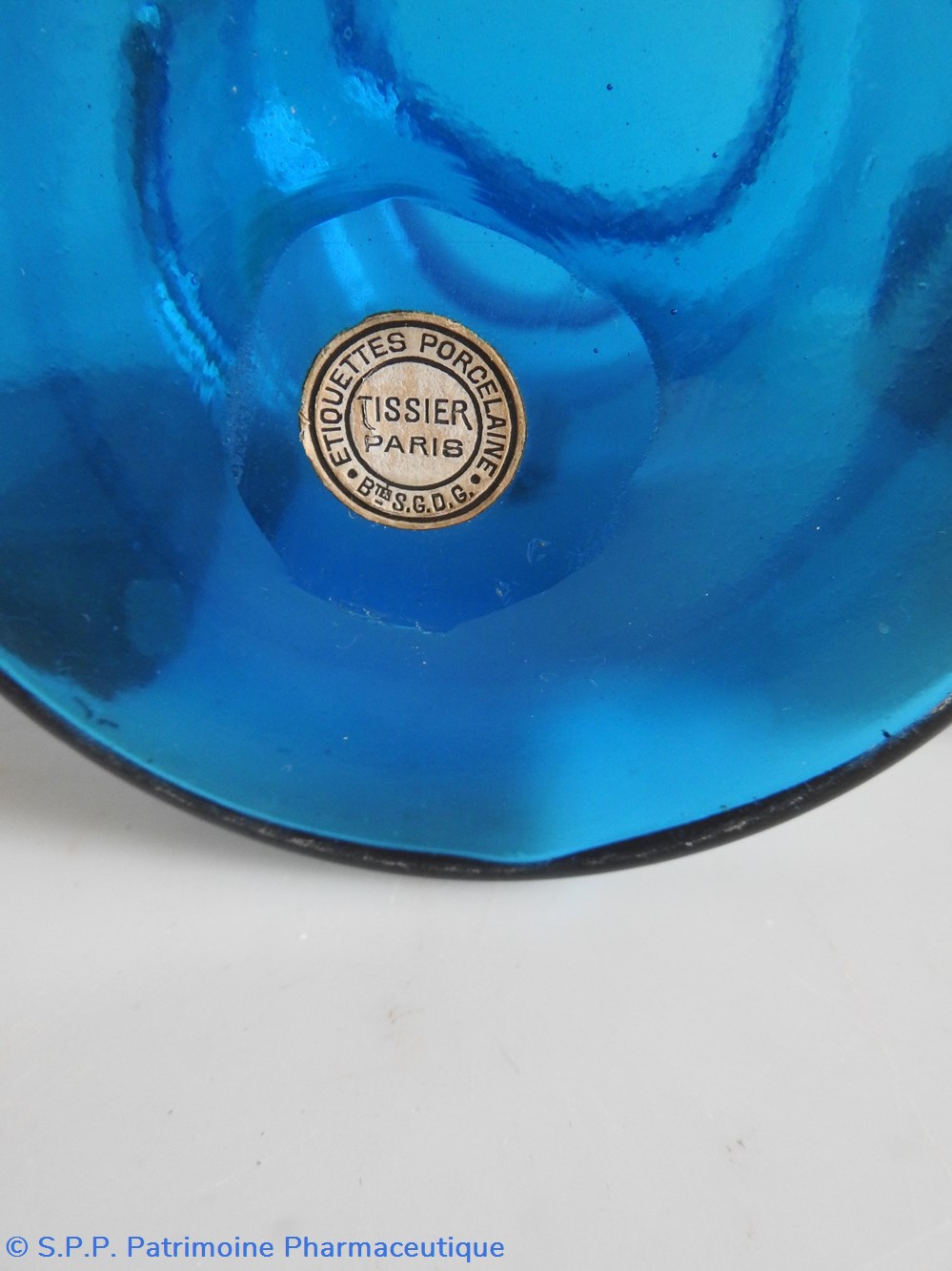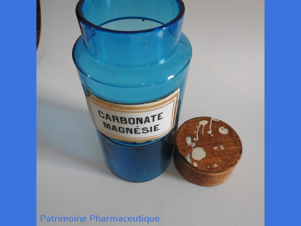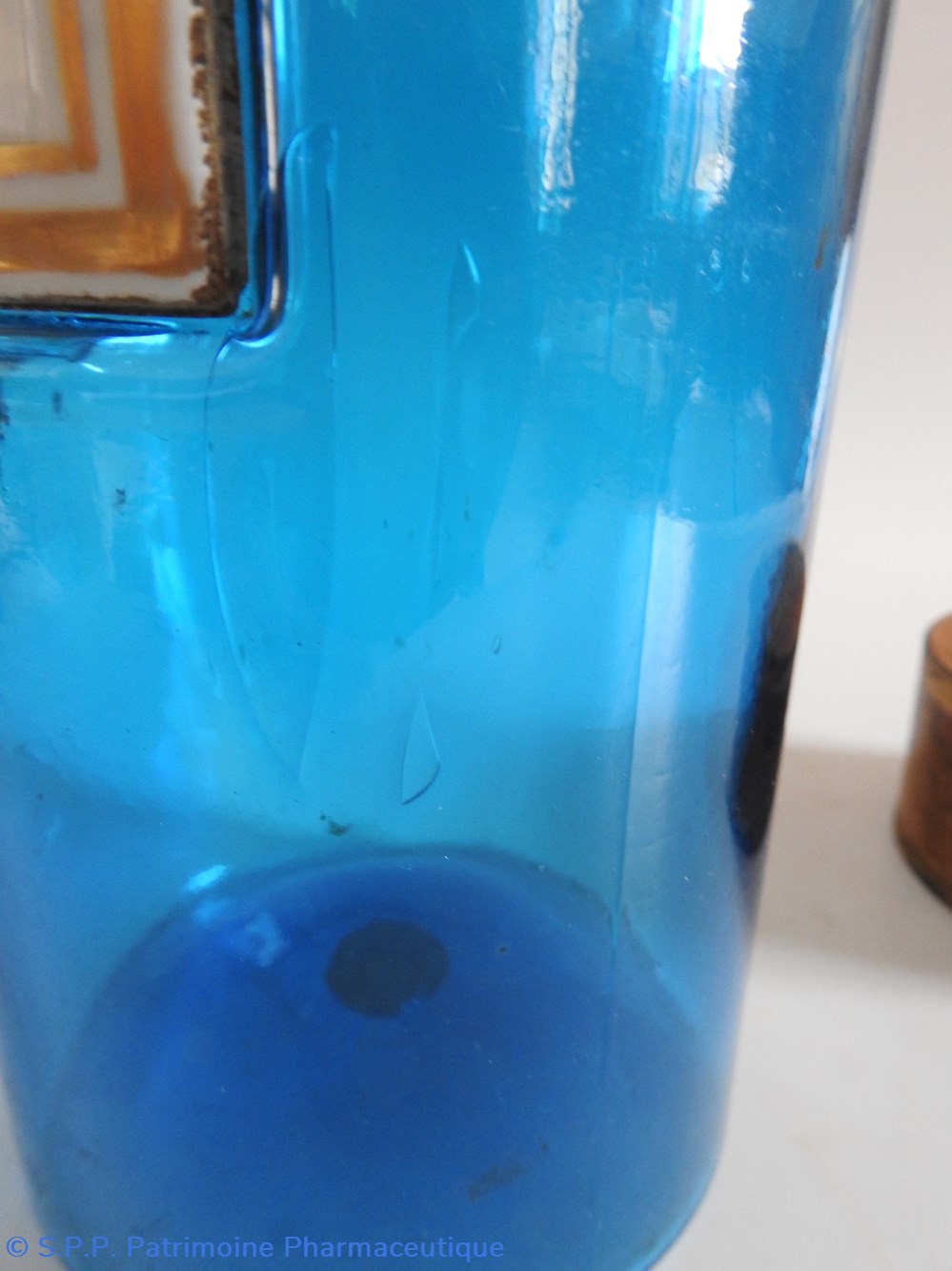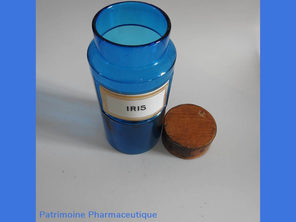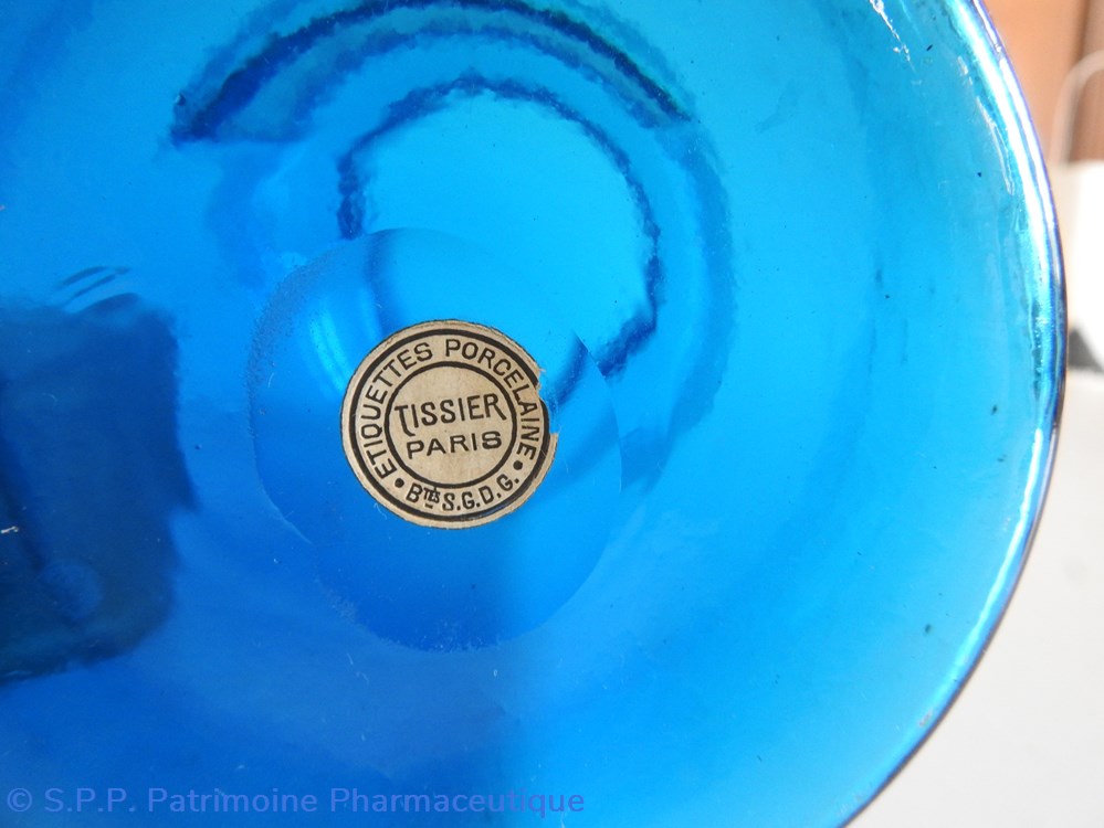 Petit flacon de pharmacie en verre de couleur bleue. Le goulot est recouvert d'un couvercle en tôle de couleur ocre clair