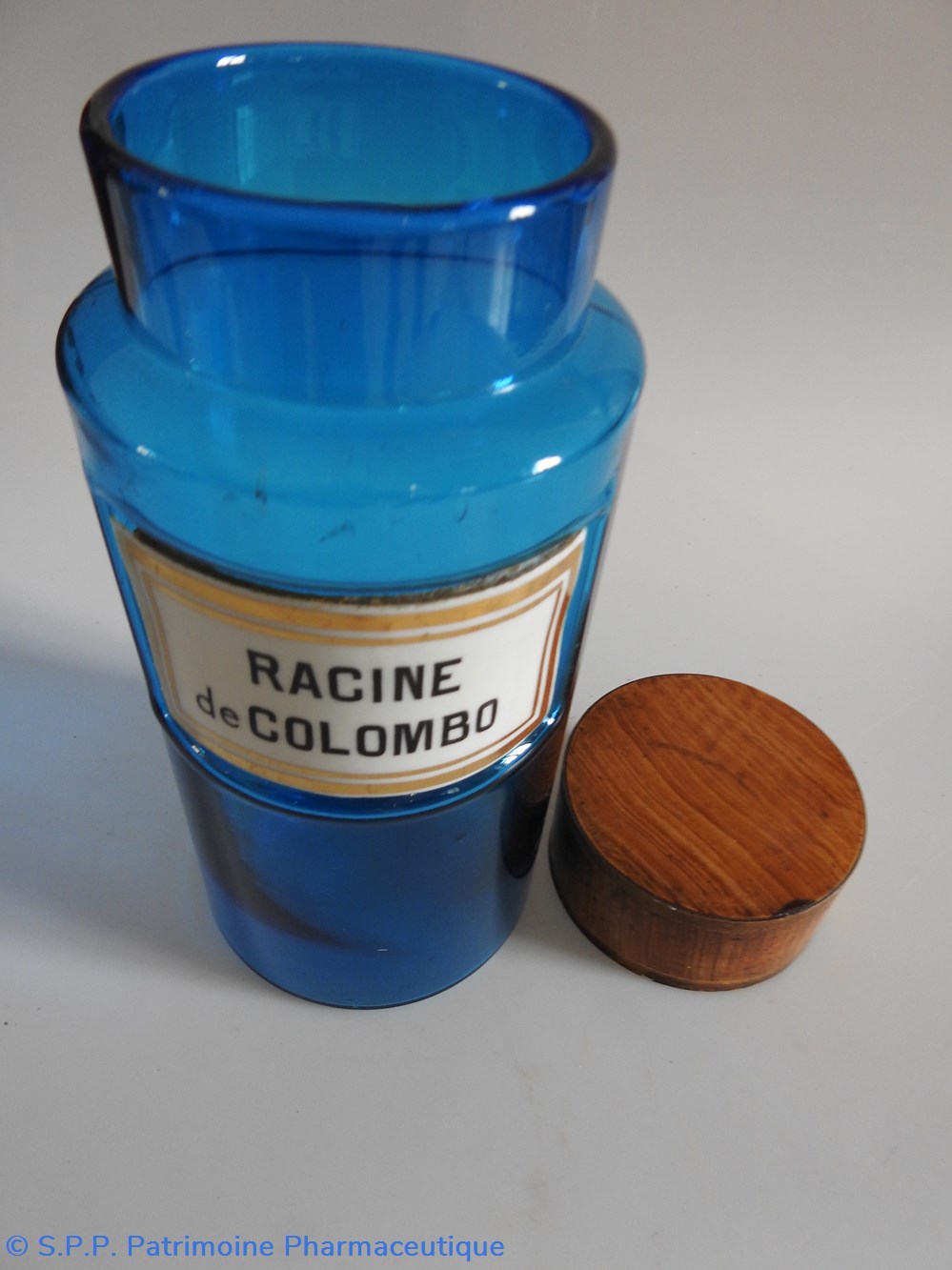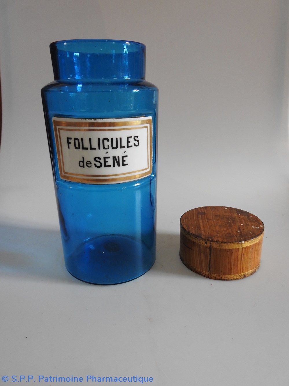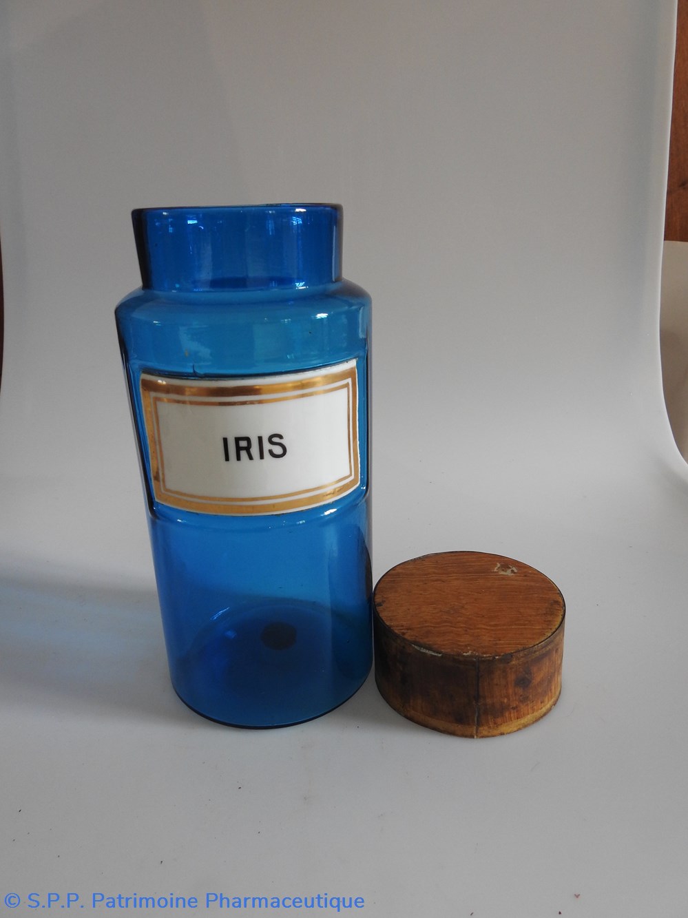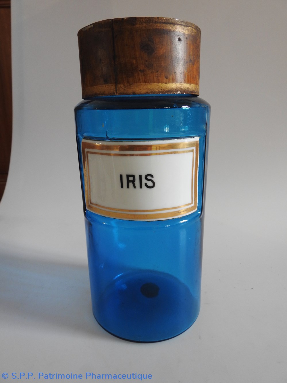Petit flacon de pharmacie en verre de couleur bleue. Le goulot est recouvert d'un couvercle en tôle de couleur ocre clair