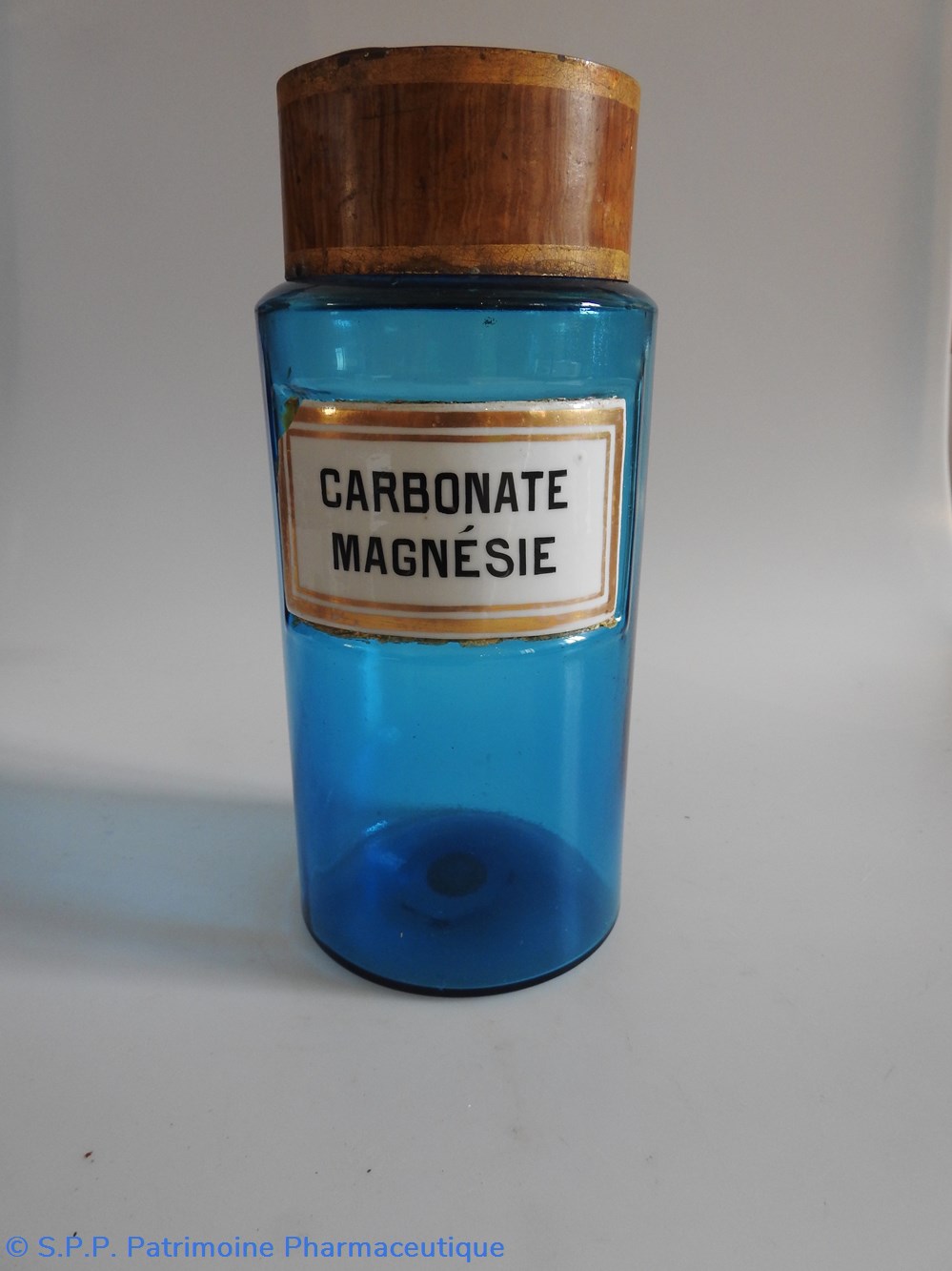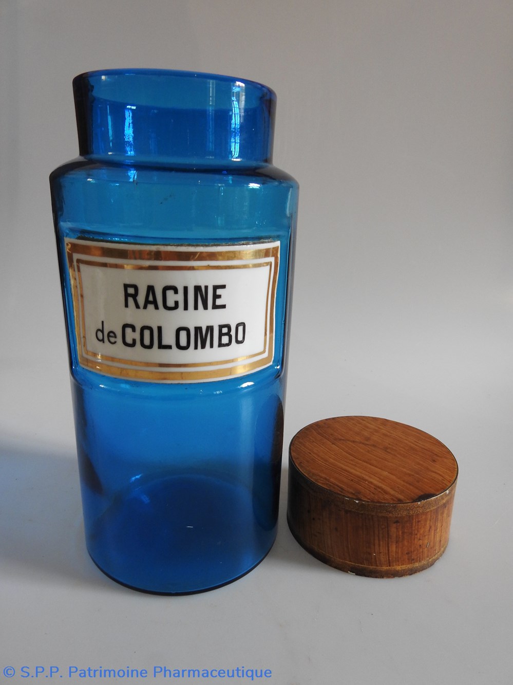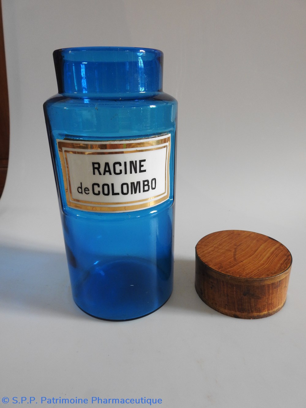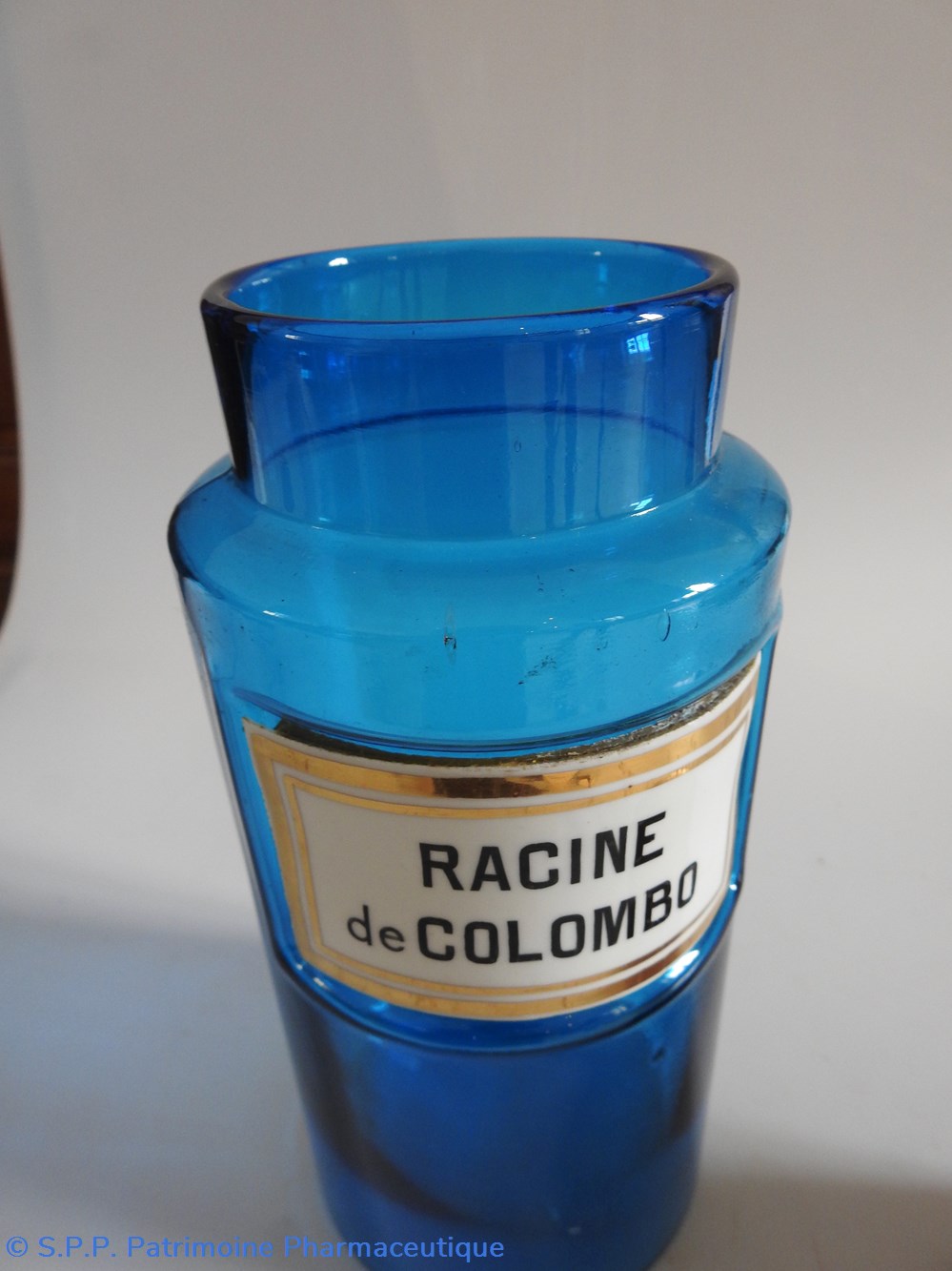 Petit flacon de pharmacie en verre de couleur bleue. Le goulot est recouvert d'un couvercle en tôle de couleur ocre clair