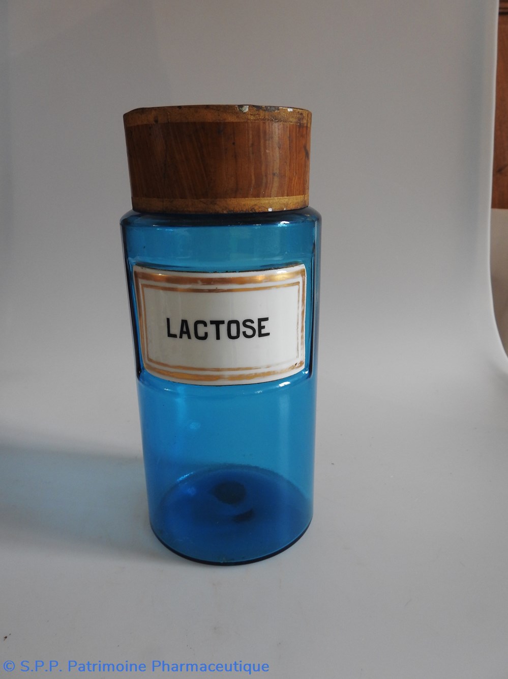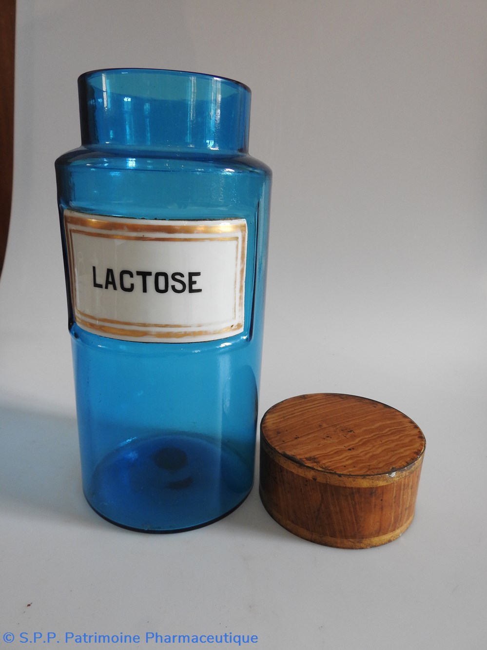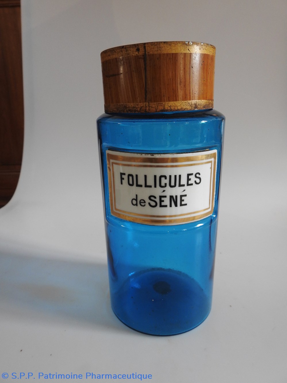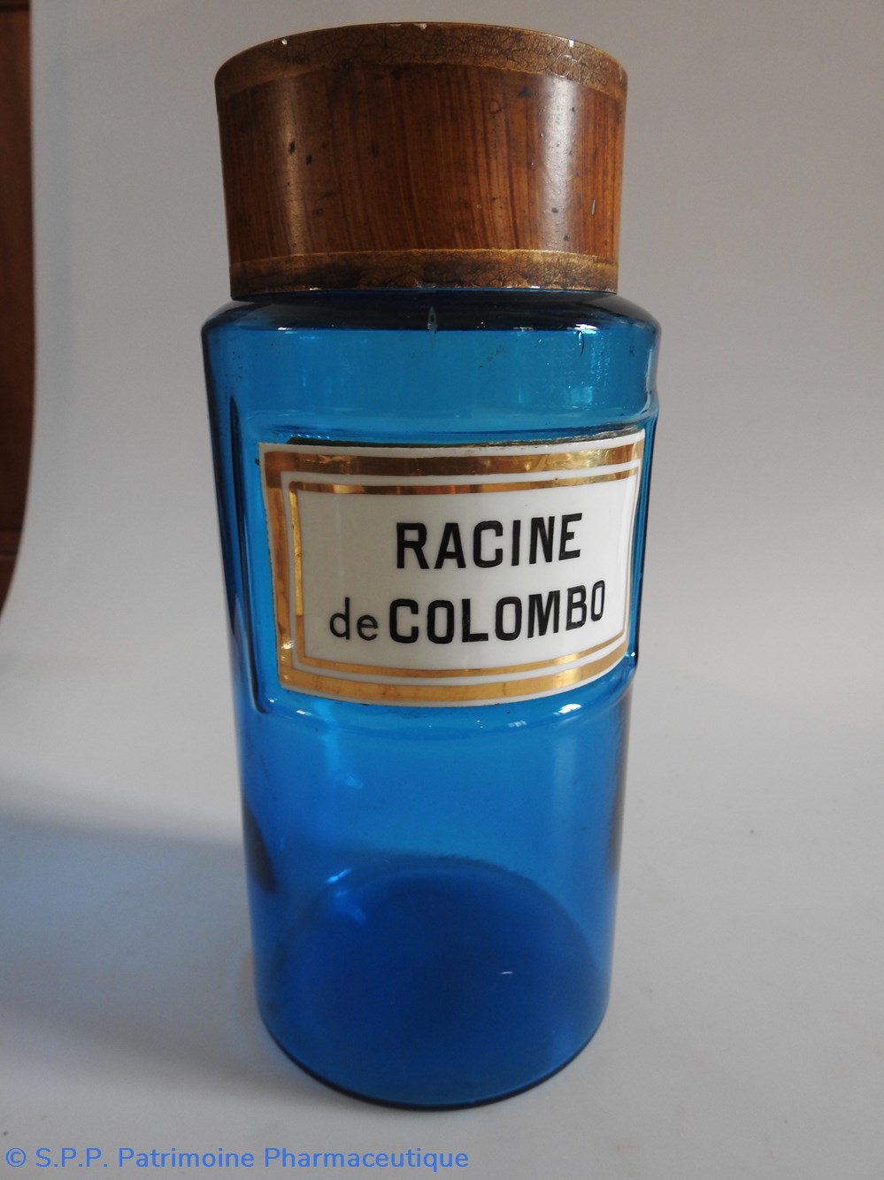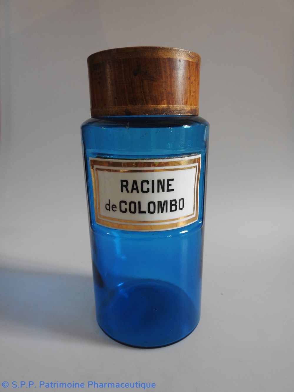 Petit flacon de pharmacie en verre de couleur bleue. Le goulot est recouvert d'un couvercle en tôle de couleur ocre clair