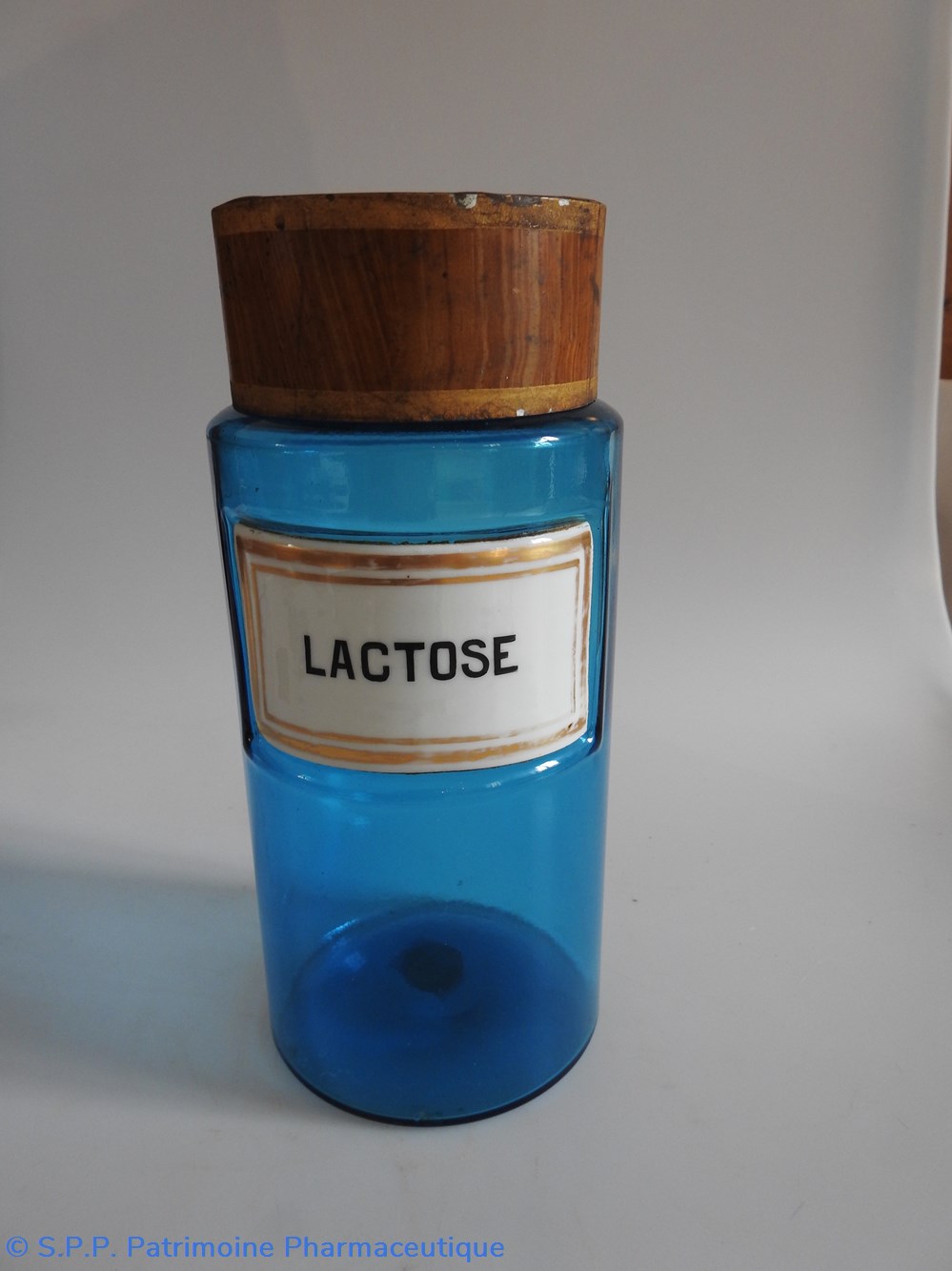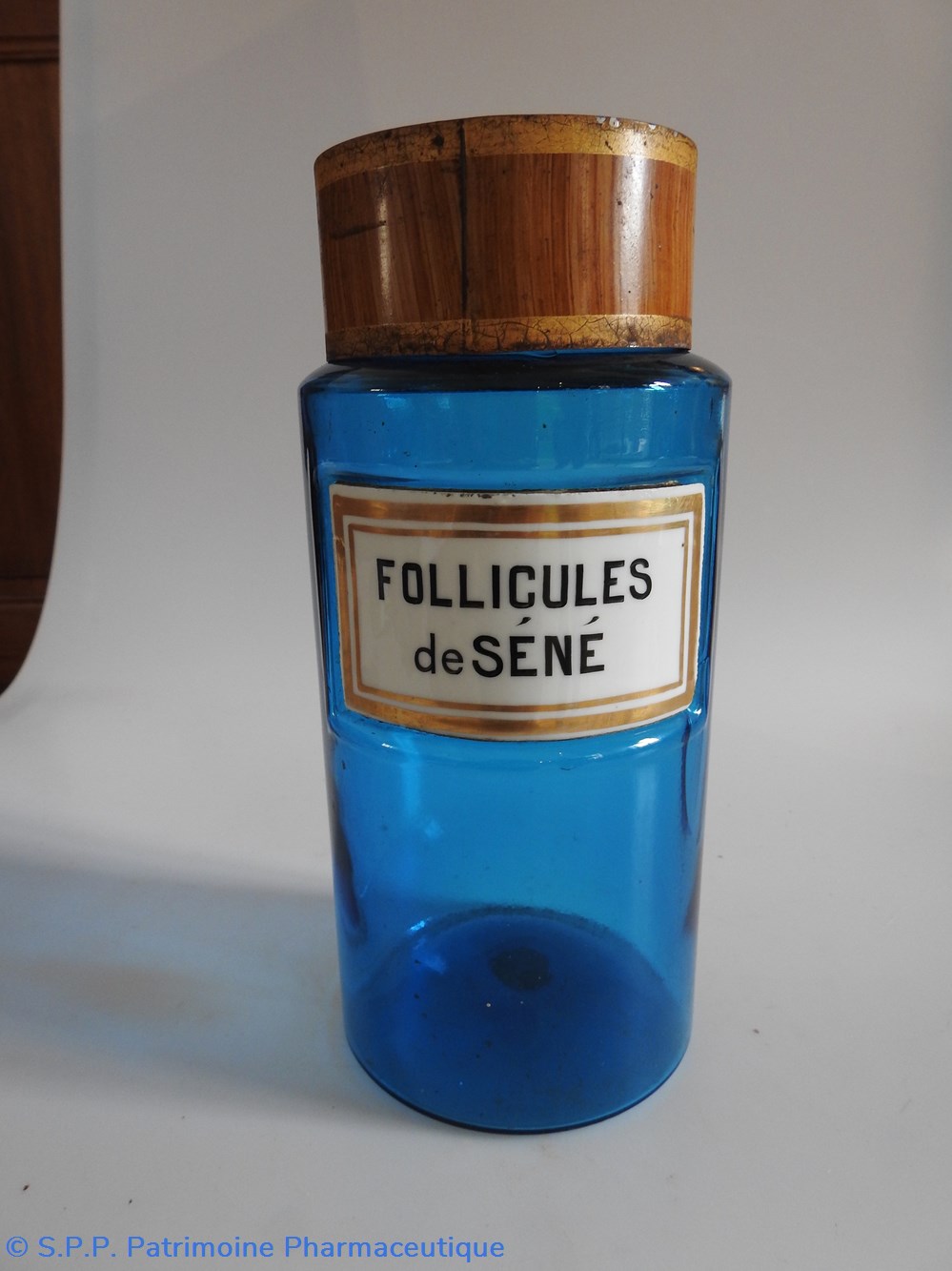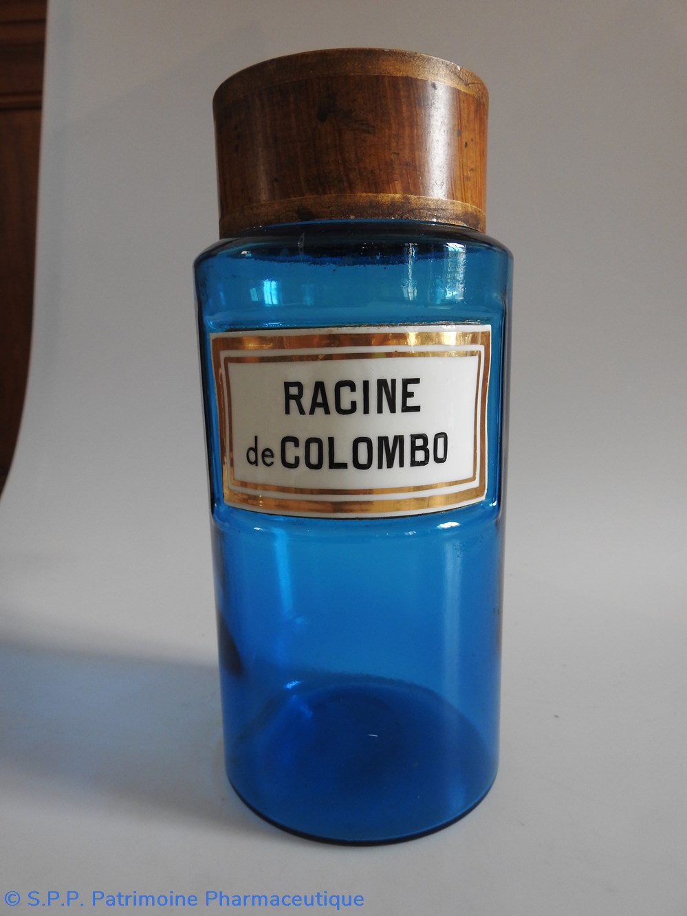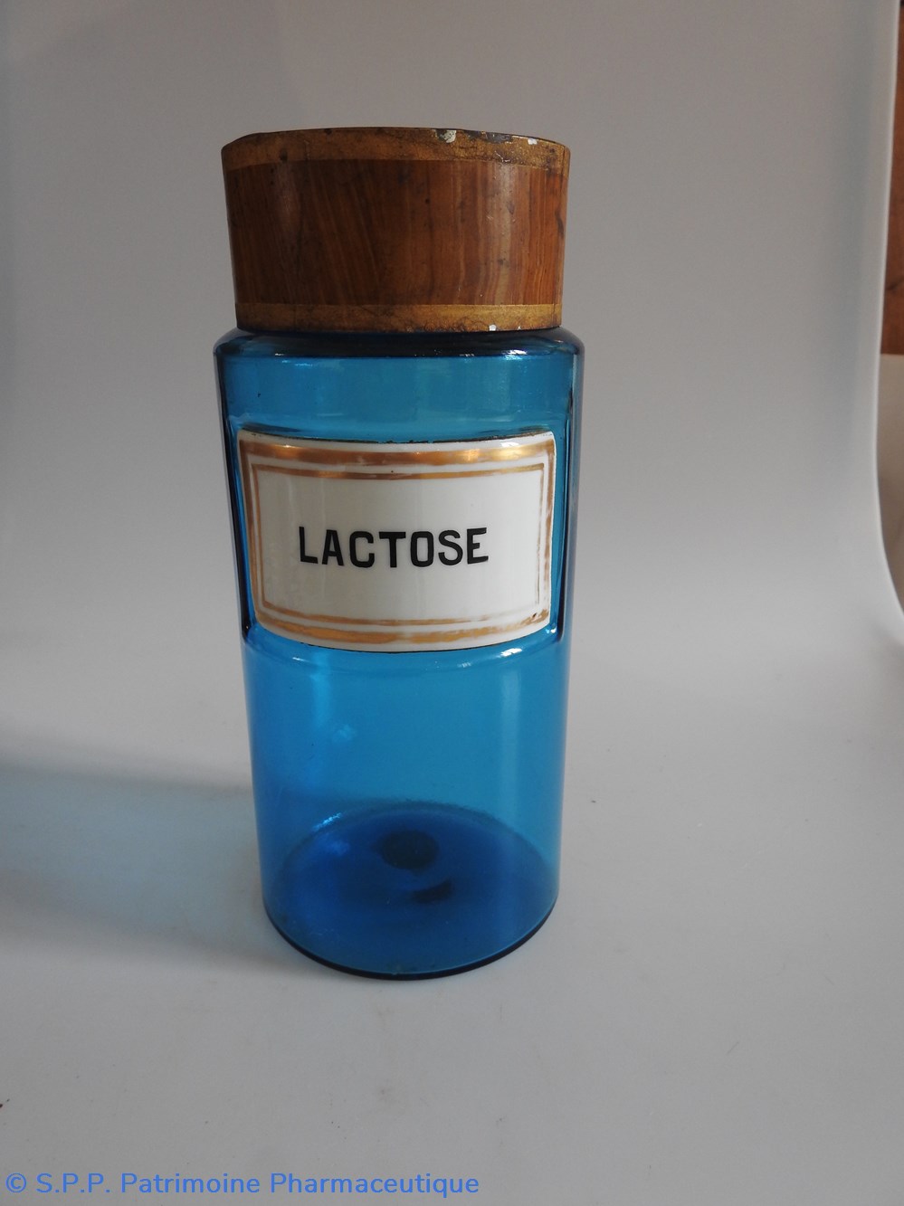 Petit flacon de pharmacie en verre de couleur bleue. Le goulot est recouvert d'un couvercle en tôle de couleur ocre clair