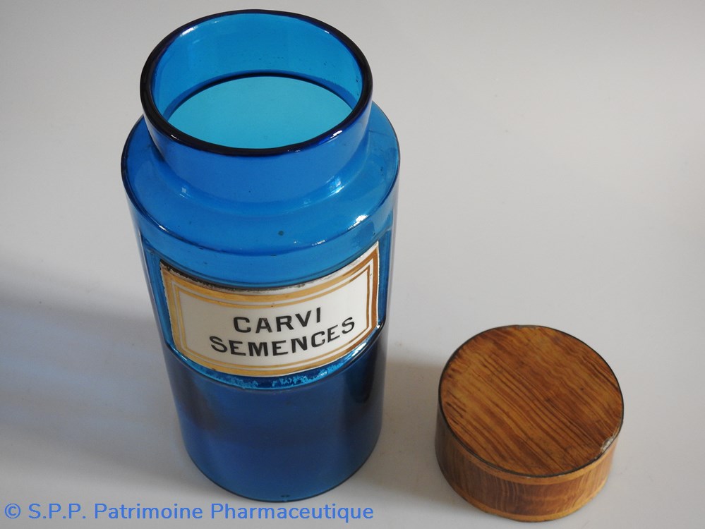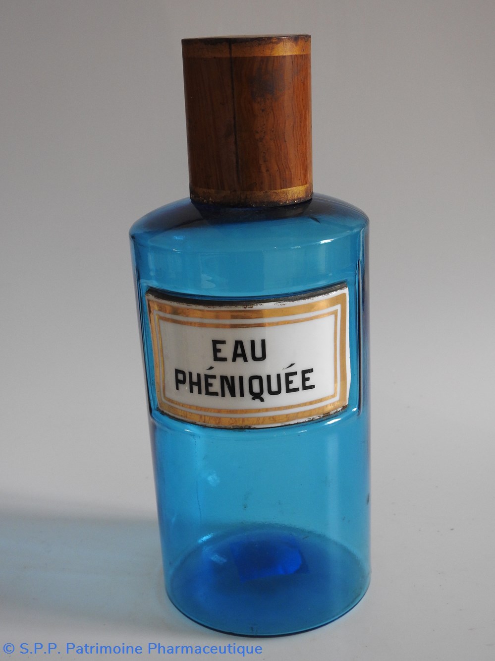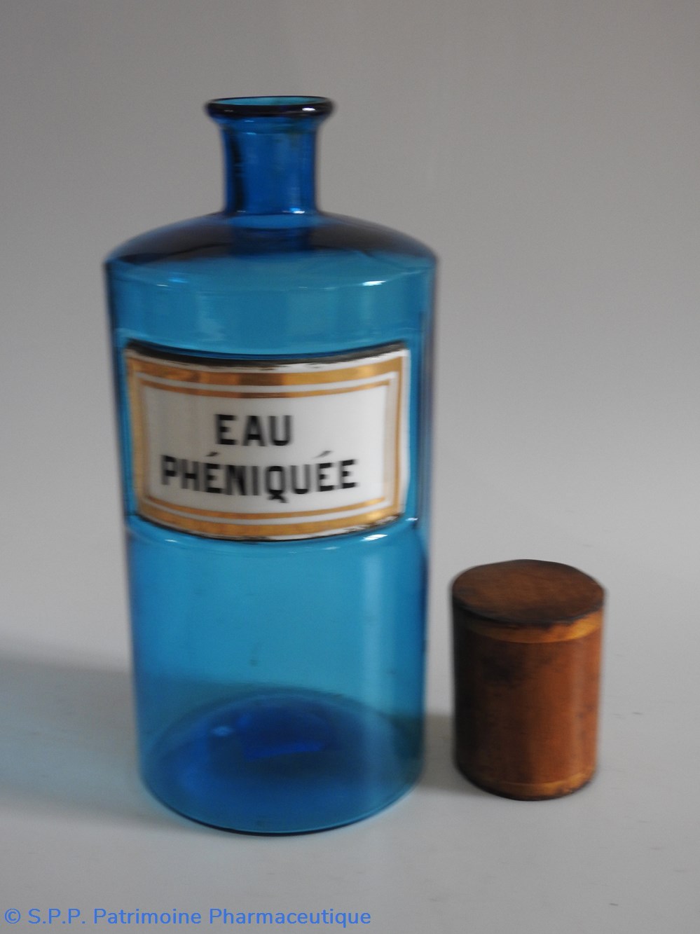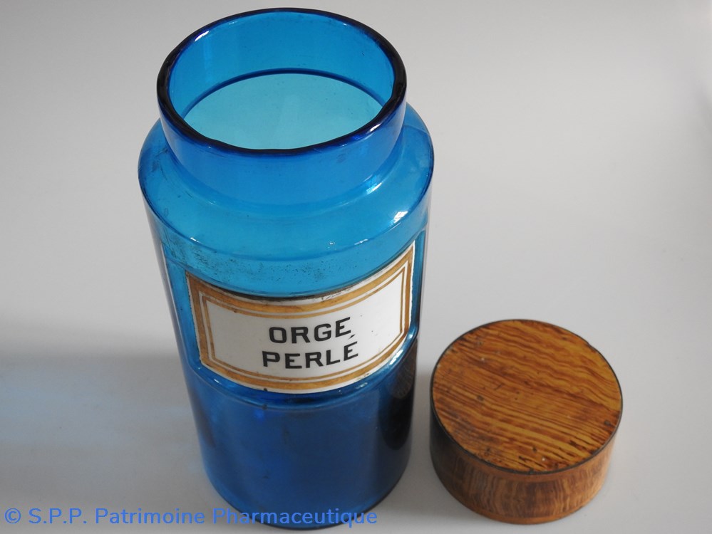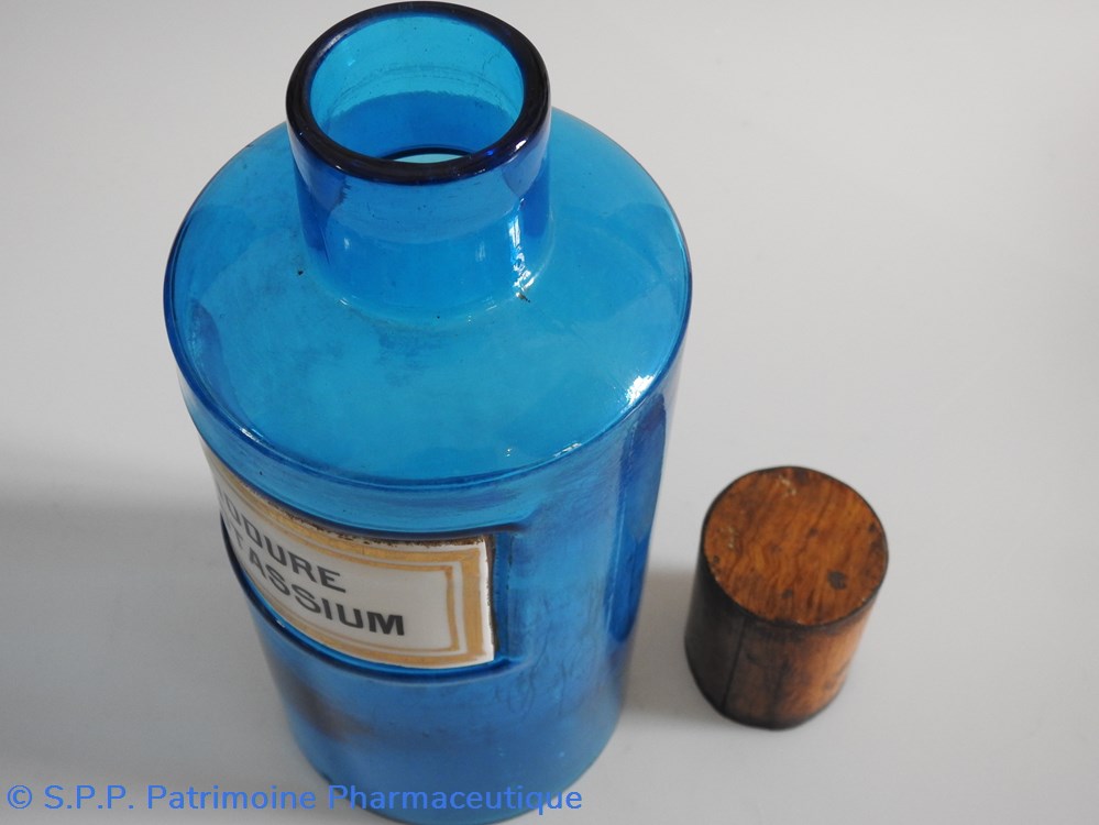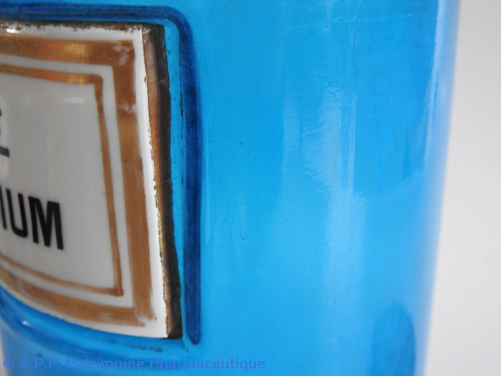Flacon de pharmacie en verre de couleur bleue avec une étiquette émaillée blanche avec bordures dorées. Nom écrit en lettres majuscules noires. Goulot étroit surmonté d'un couvecle en tôle de couleur ocre clair.