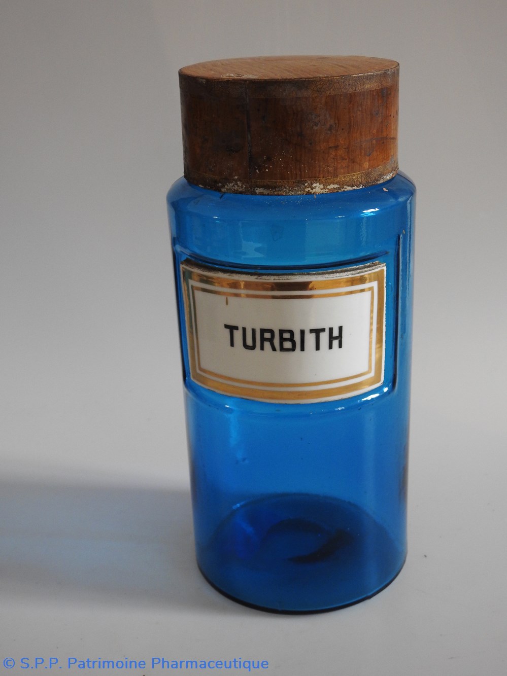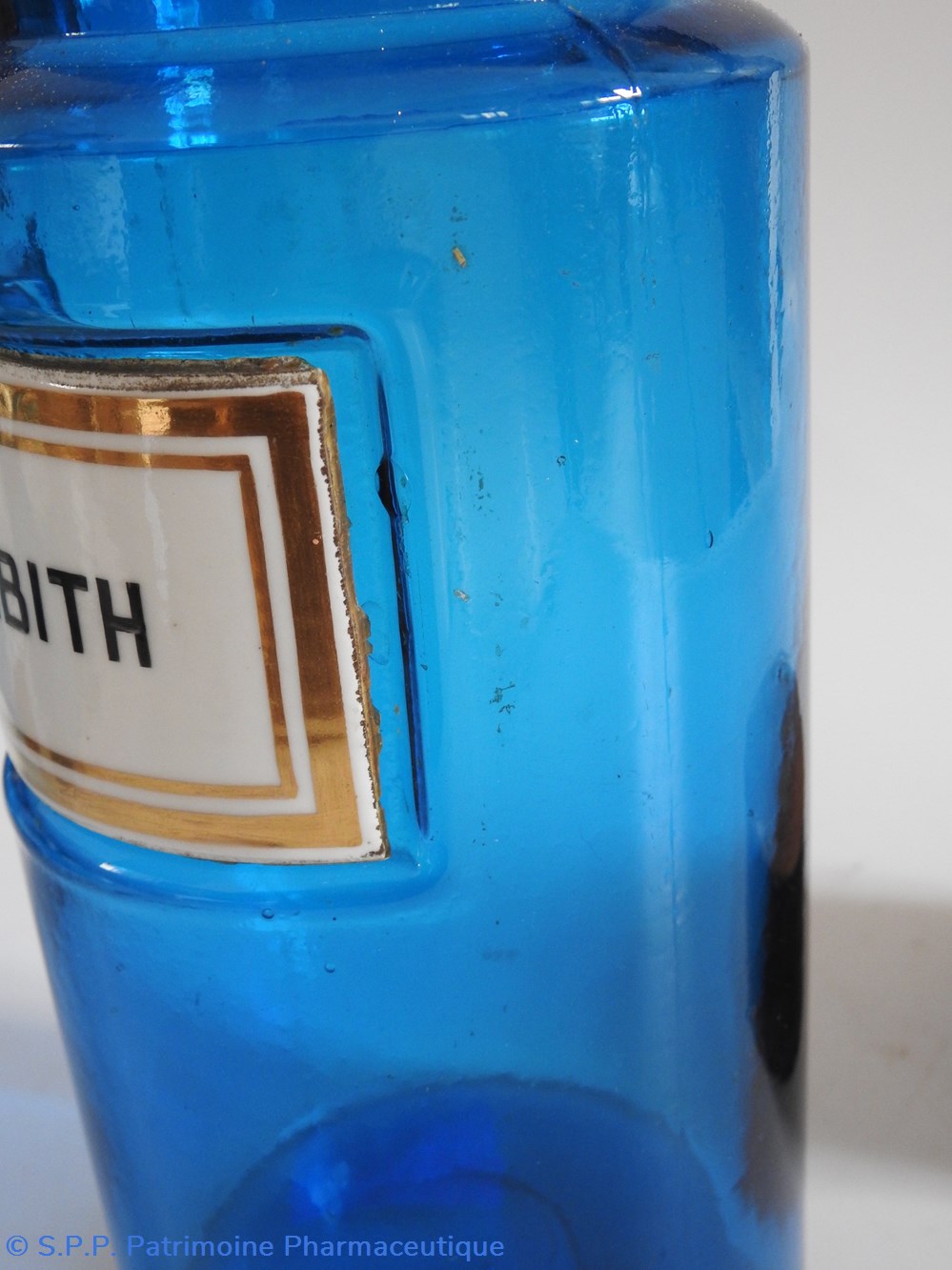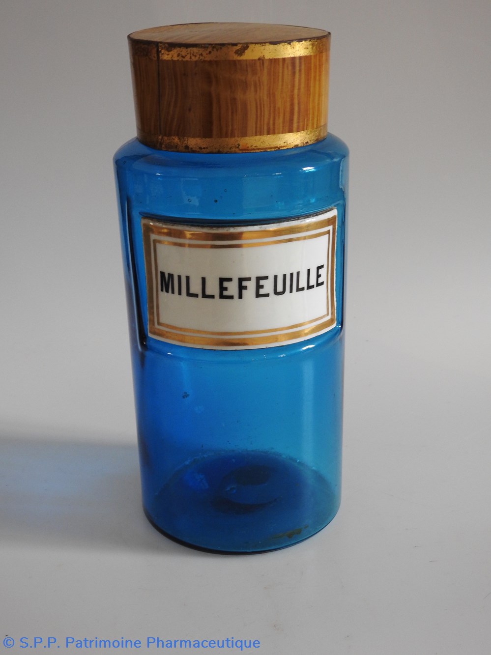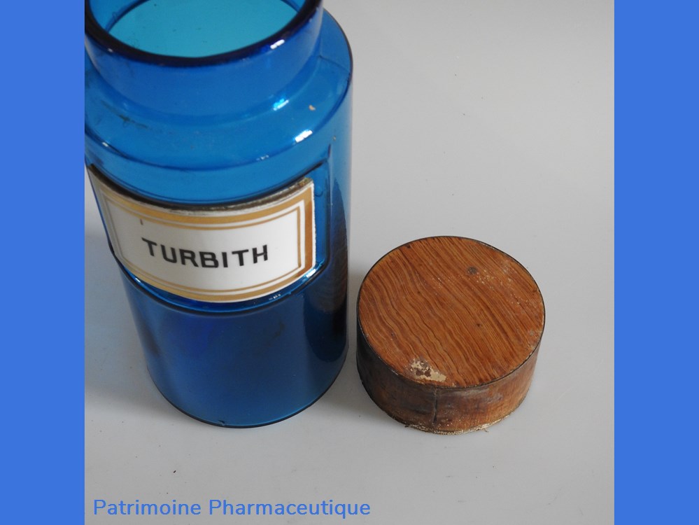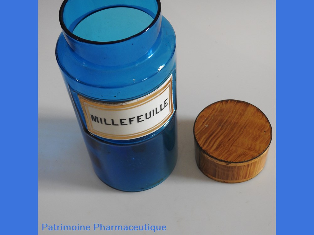Flacon de pharmacie en verre de couleur bleue avec une étiquette émaillée blanche avec bordures dorées. Nom écrit en lettres majuscules noires. Goulot étroit surmonté d'un couvecle en tôle de couleur ocre clair.