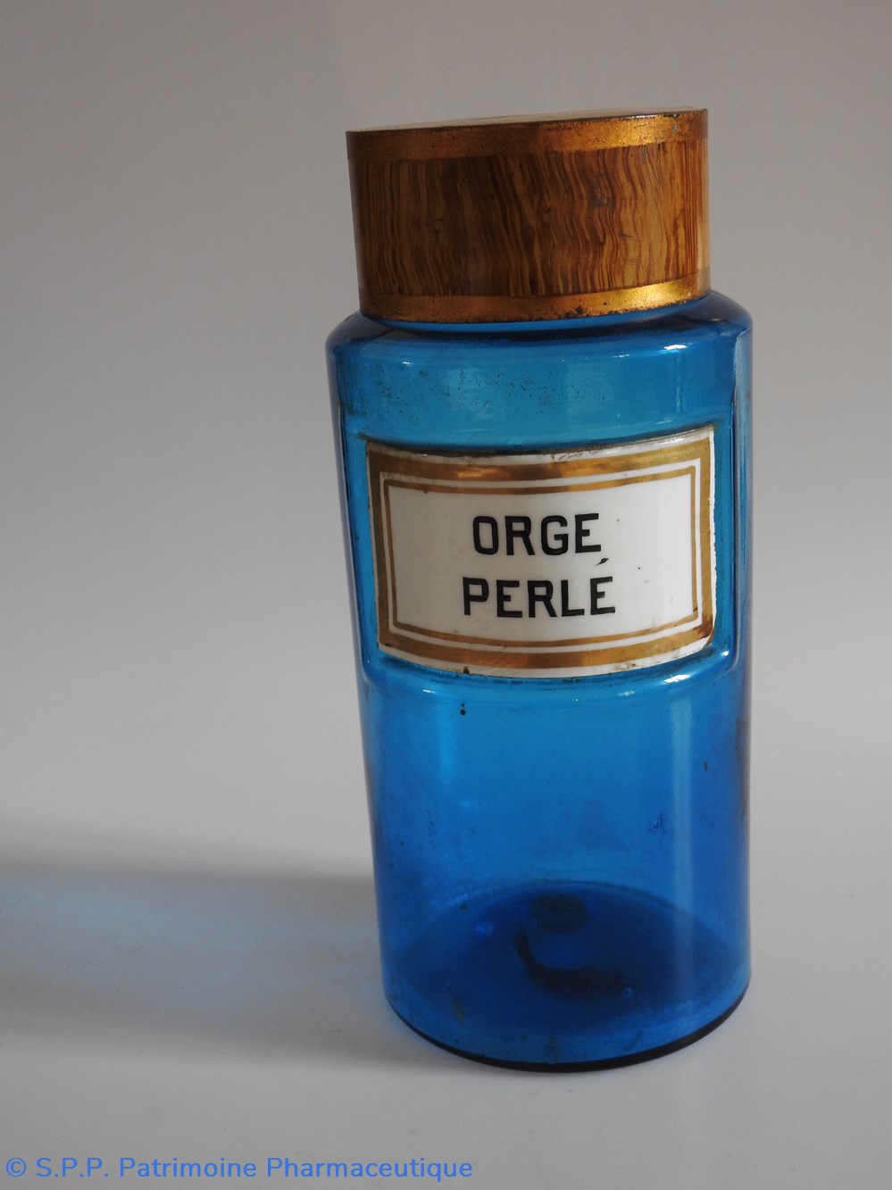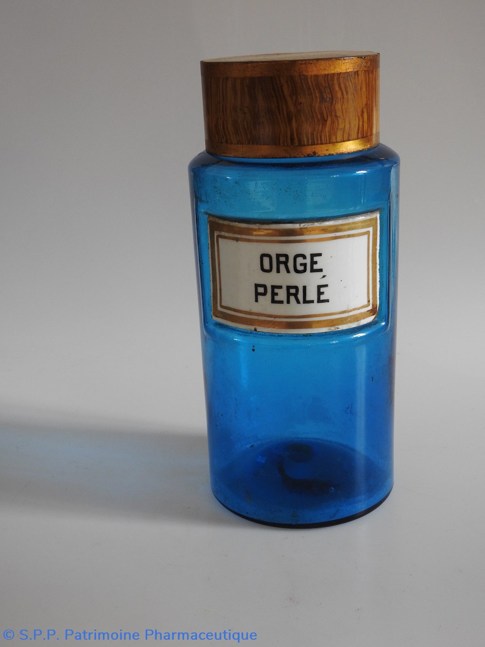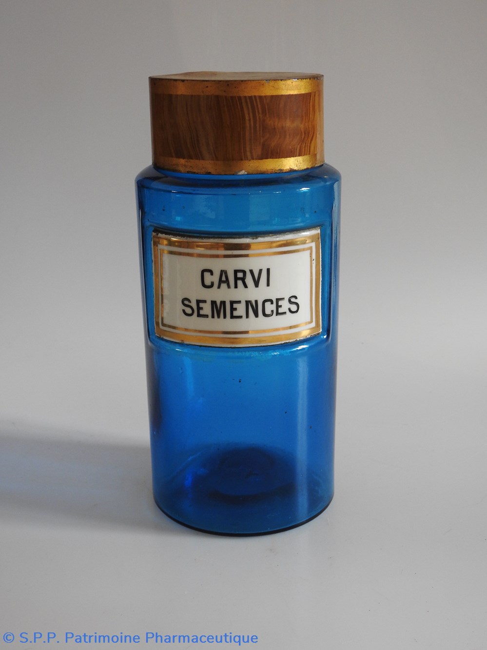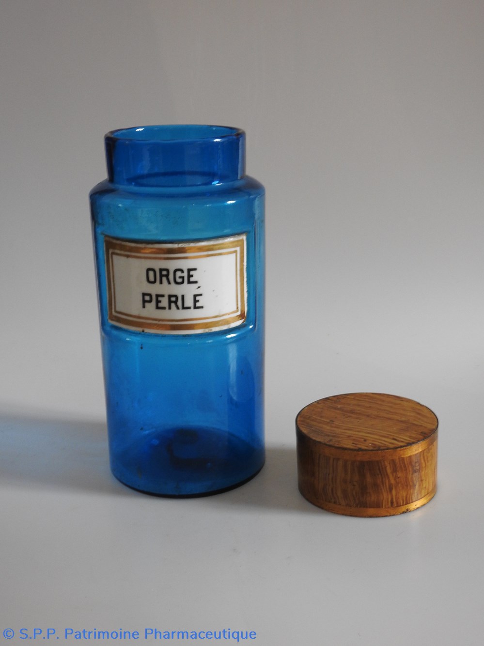 Flacon de pharmacie en verre de couleur bleue avec une étiquette émaillée blanche avec bordures dorées. Nom écrit en lettres majuscules noires. Goulot étroit surmonté d'un couvecle en tôle de couleur ocre clair.