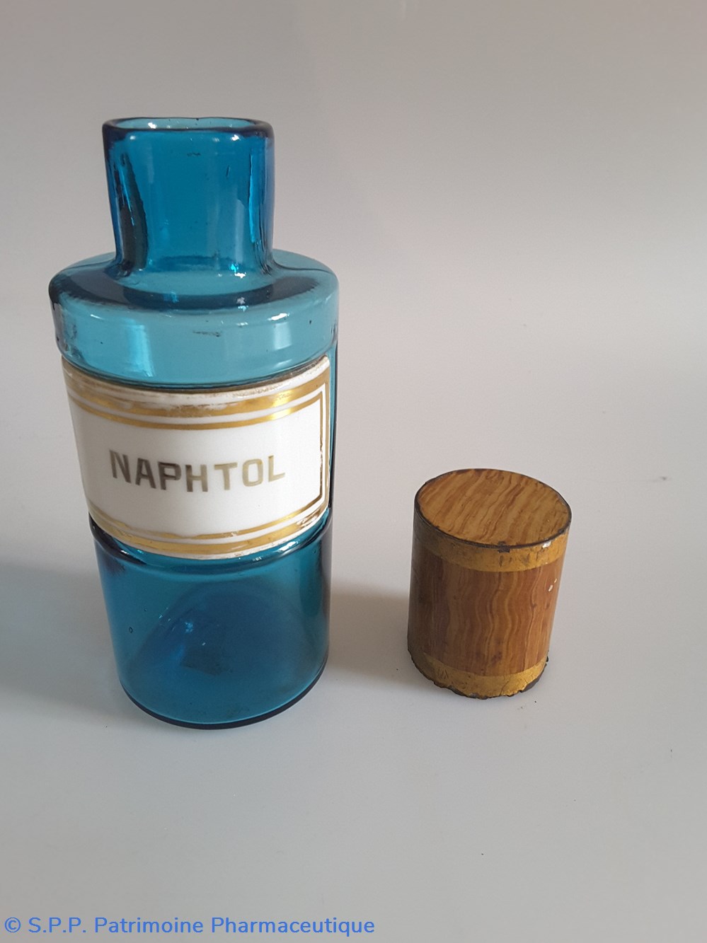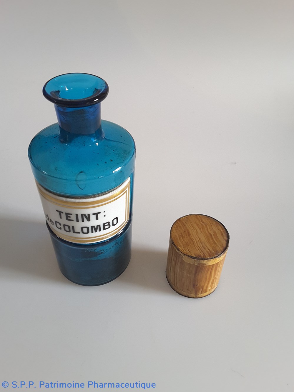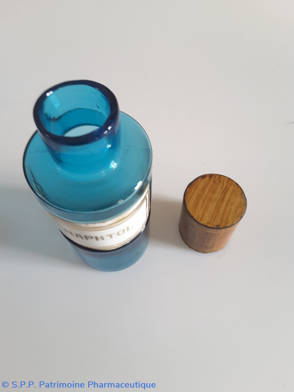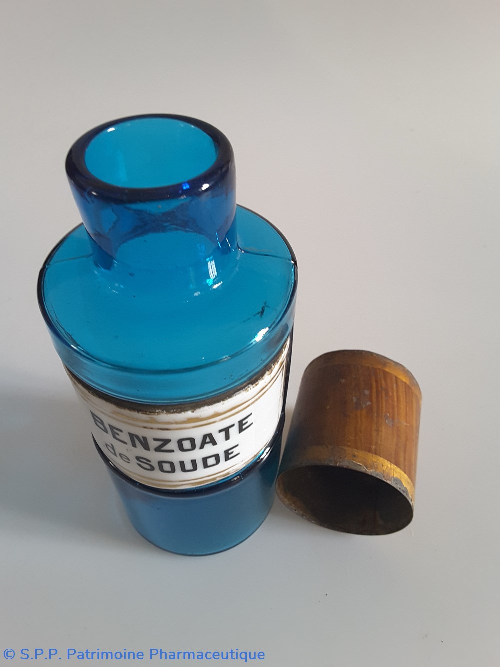 Petit flacon de pharmacie en verre de couleur bleue. Le goulot est recouvert d'un couvercle en tôle de couleur ocre clair