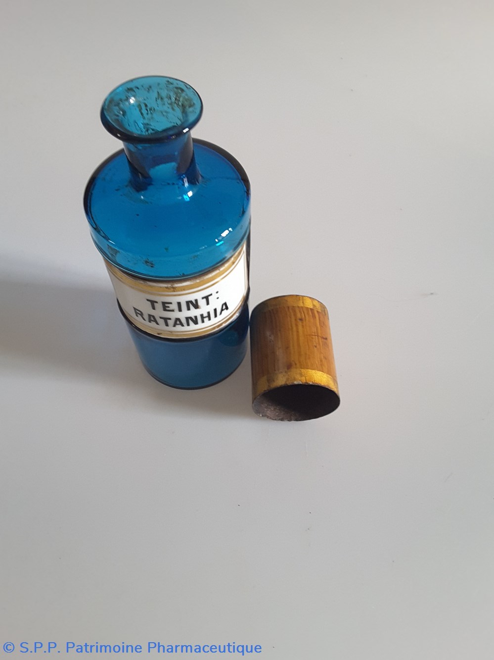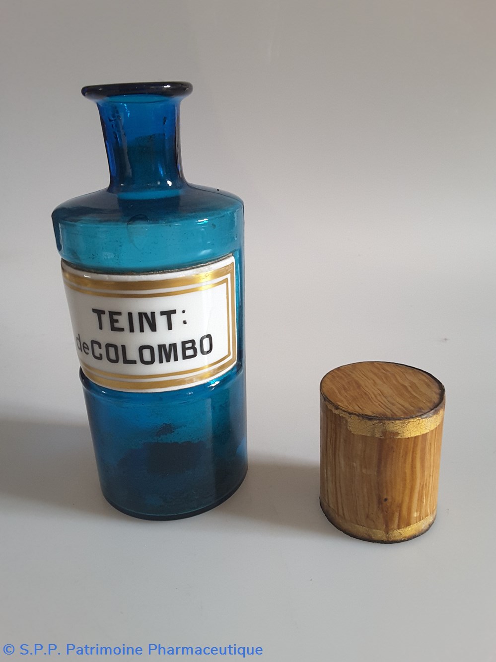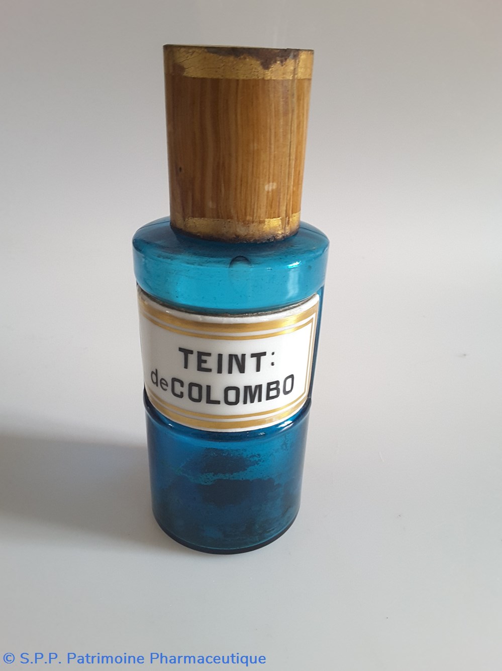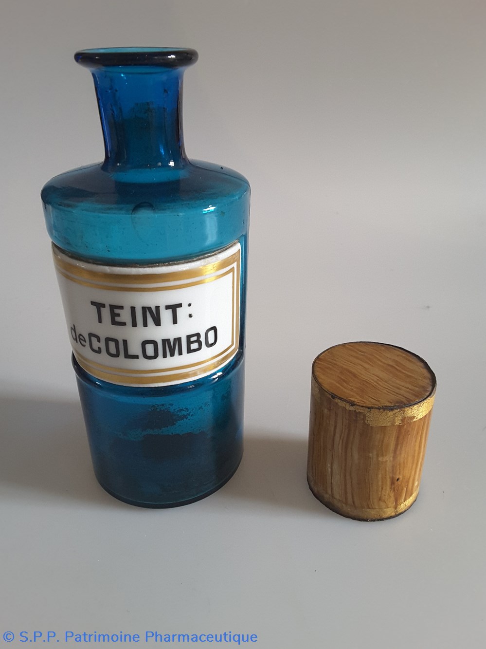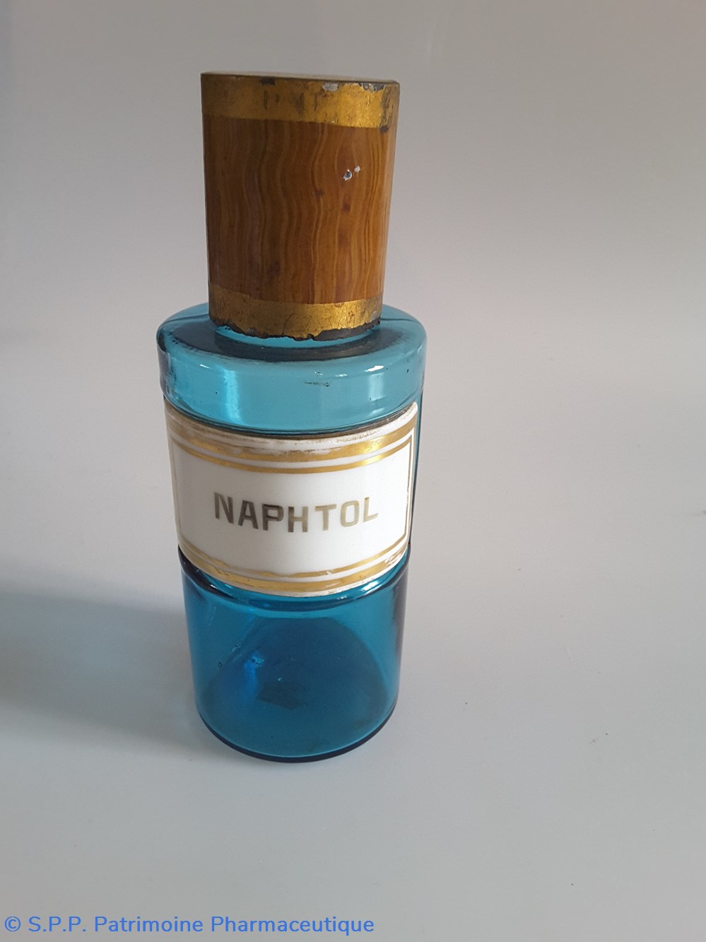 Petit flacon de pharmacie en verre de couleur bleue. Le goulot est recouvert d'un couvercle en tôle de couleur ocre clair