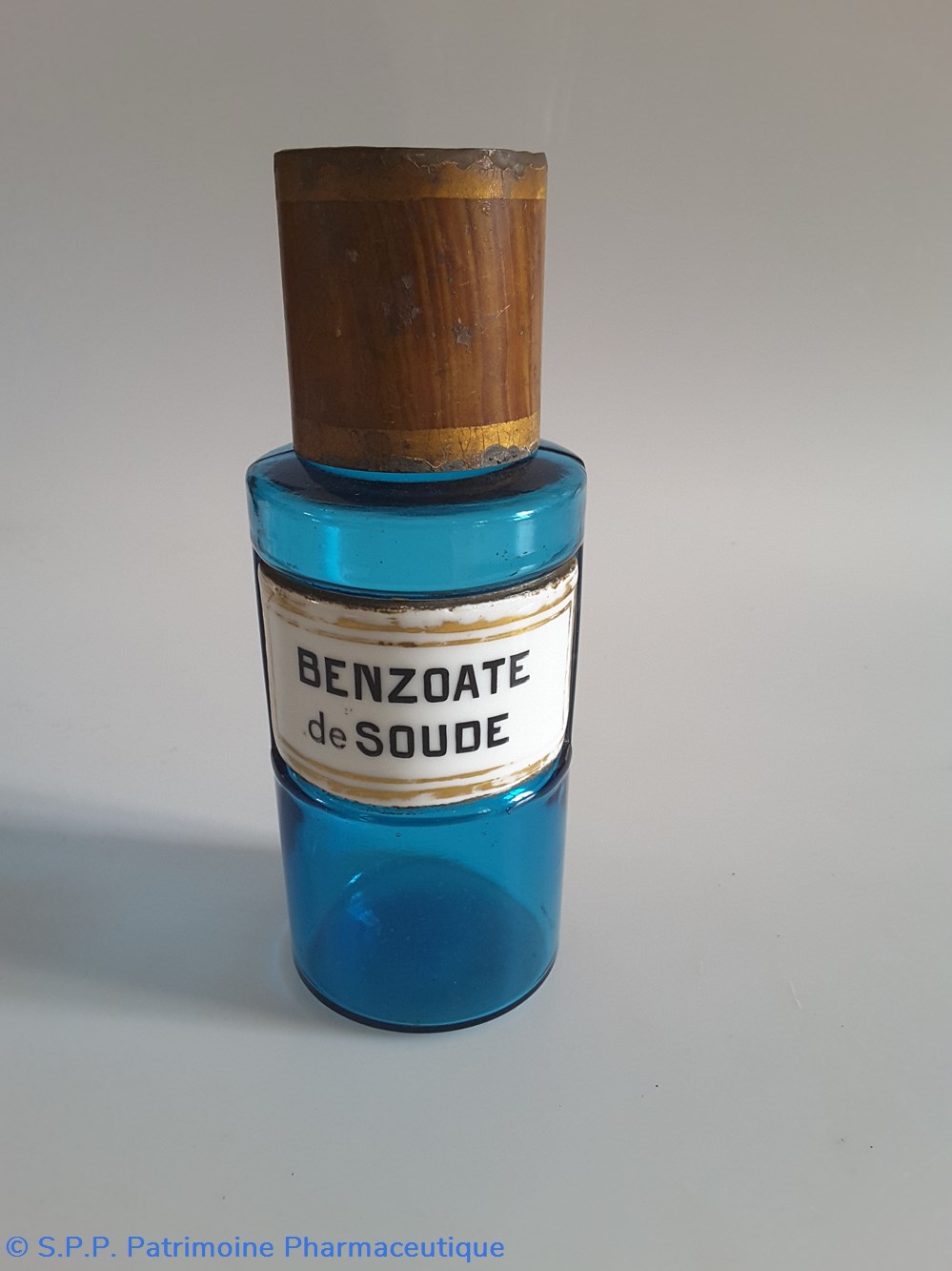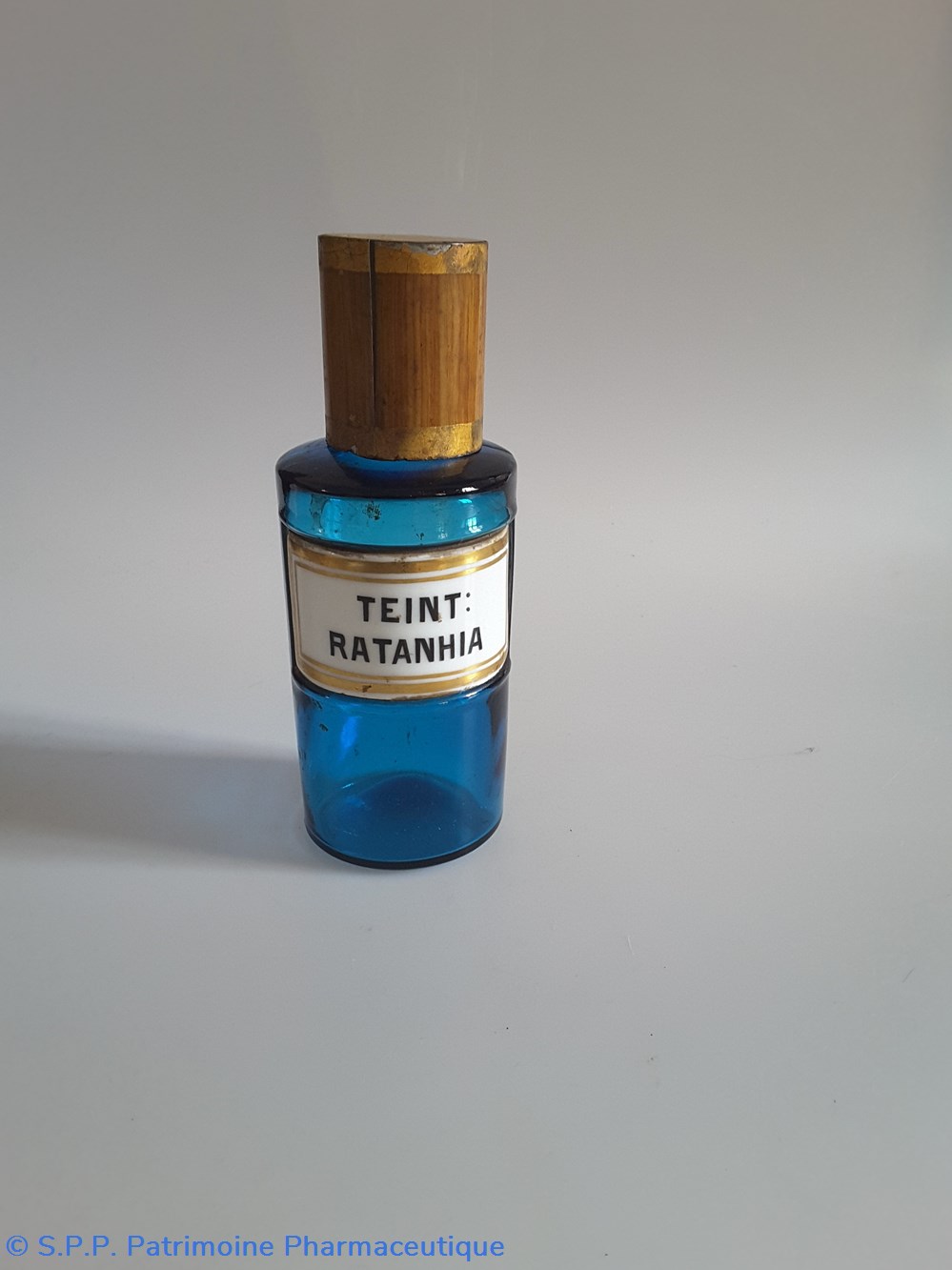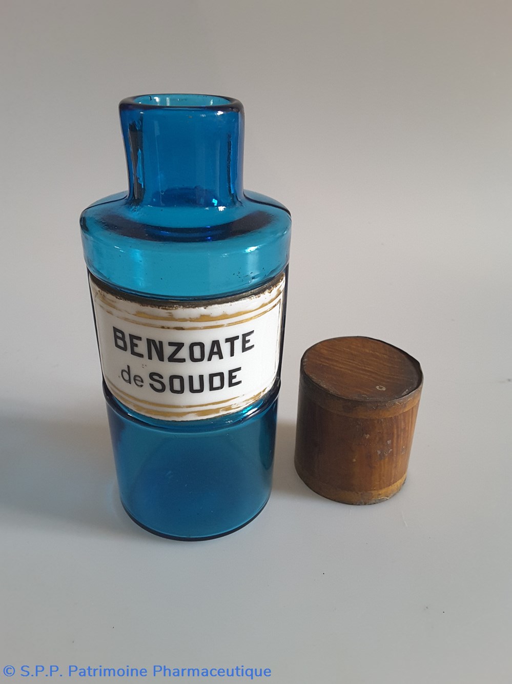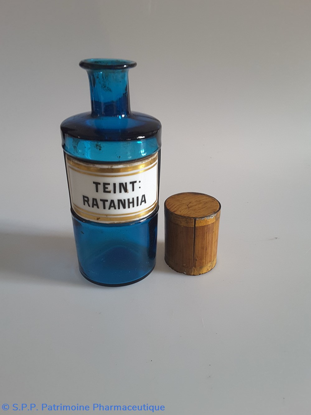 Petit flacon de pharmacie en verre de couleur bleue. Le goulot est recouvert d'un couvercle en tôle de couleur ocre clair