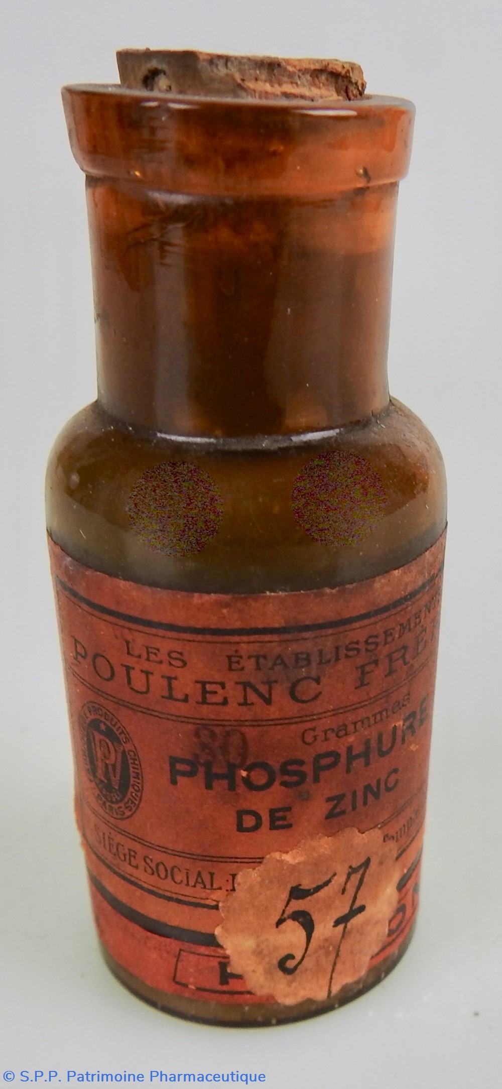 Petit flacon en verre ambré, fermé par un bouchon en liège. Etiquette rouge imprimée en lettres noires, portant le nom du produit : PHOSPURE DE ZINC le nom du fabricant : Les Etablissements POULENC Frères et une étiquette sur le pourtour indiquant : POISON. . Un étiquette ronde est collée devant avec le chiffre 57 manuscrit. Le flacon contient encore de la substance. Le cul du flacon porte le chiffre 24