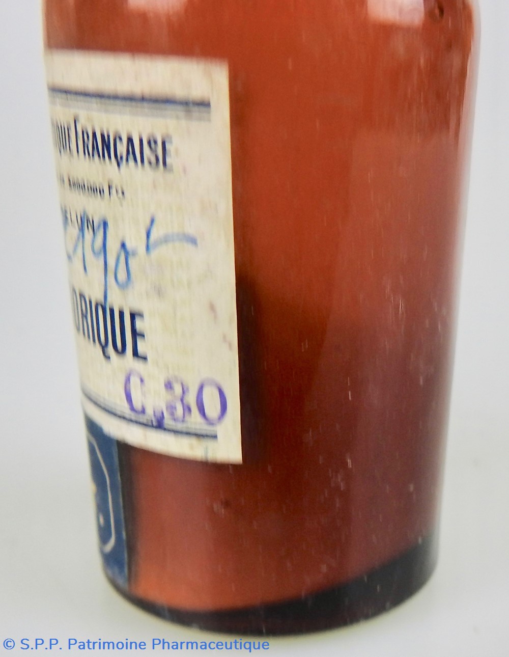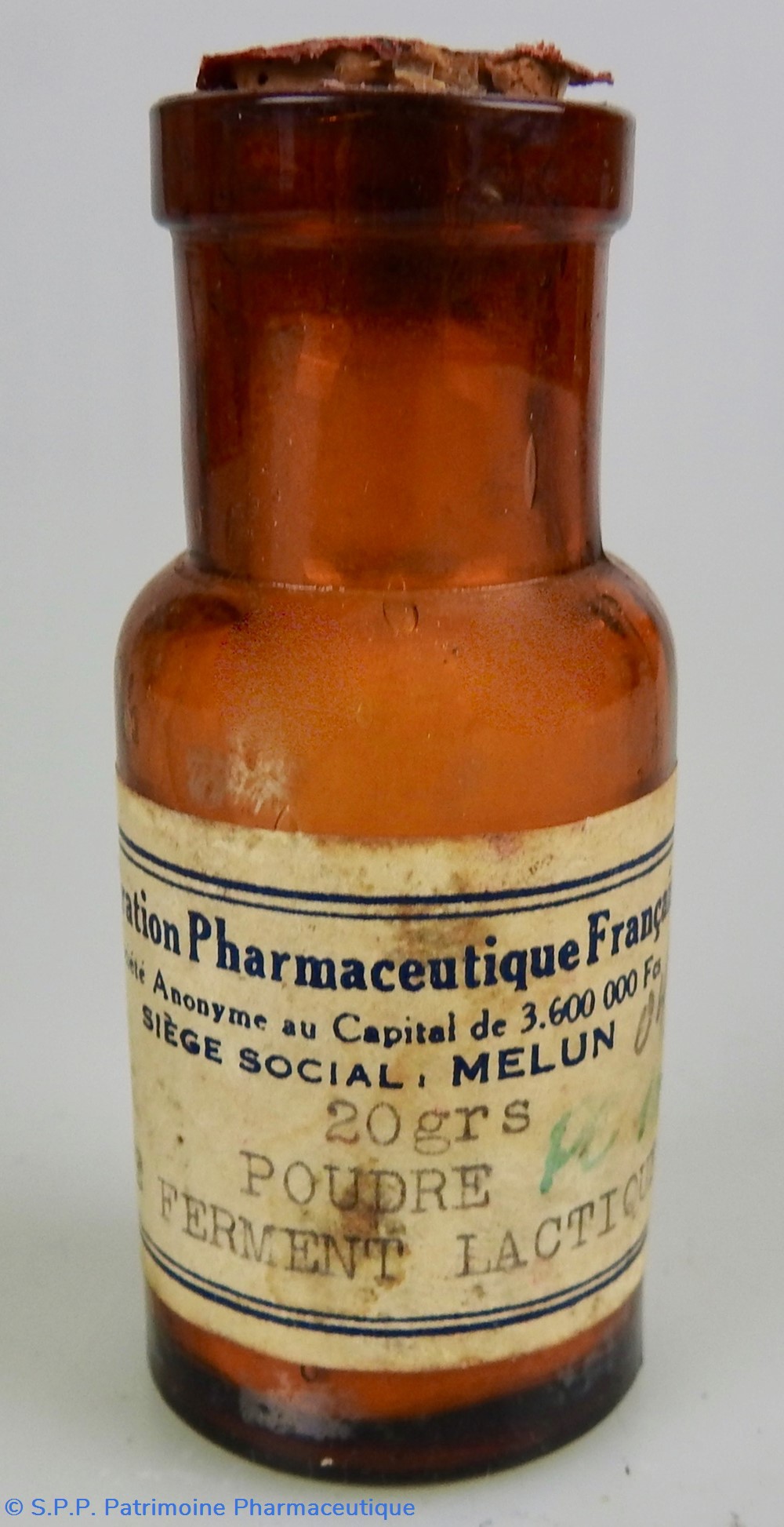 Petit flacon en verre ambré fermé par un bouchon en liège, sur lequel est apposé une étiquette reproduisant le logo du fabricant. Un eétquette de couleur grise mentionne le nom du produit : POUDRE DE FERMENT LACTIQUE.Le nom du fabricant se retrouve au au haut de l'étiquette : Coopération Pharmaceutique Française, avec le siège social à Melun. Le dessous du flacon est marqué 30 dans le verre lui-même. Une indication de poids est rajoutée sur l'étiquette : 20 Gr. Sur le côté de l'étiquette une date est indiquée JUIN 1939. Le flacon contient encore aux 2/3 une poudre blanche.