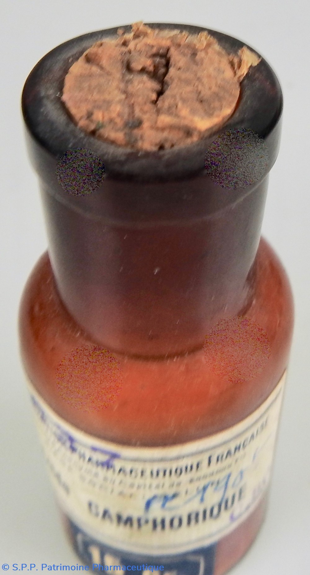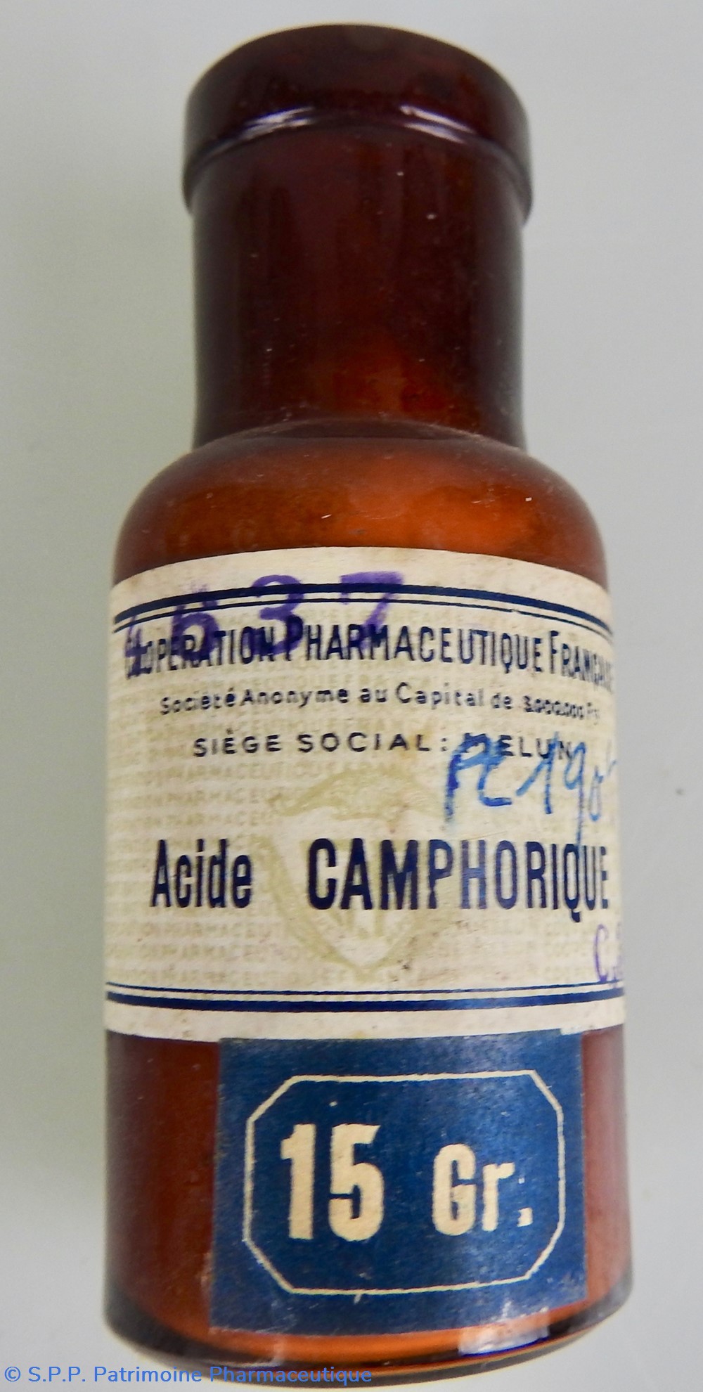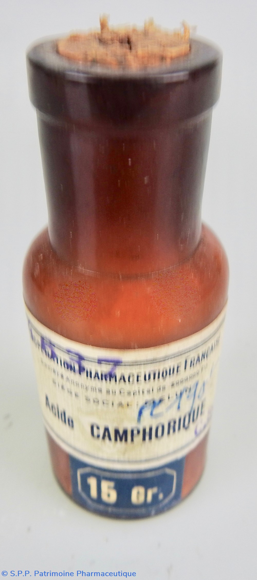 Petit flacon en verre ambré fermé par un bouchon en liège. Un étiquette de couleur grise mentionne le nom du produit : Acide CAMPHORIQUE.Le nom du fabricant se retrouve au haut de l'étiquette : Coopération Pharmaceutique Française, avec le siège social à Melun. Le dessous du flacon est marqué 30 dans le verre lui-même. Une indication de poids est rajoutée sur une étiquette bleue 15 Gr. Le flacon contient encore aux 2/3 une poudre colorée.