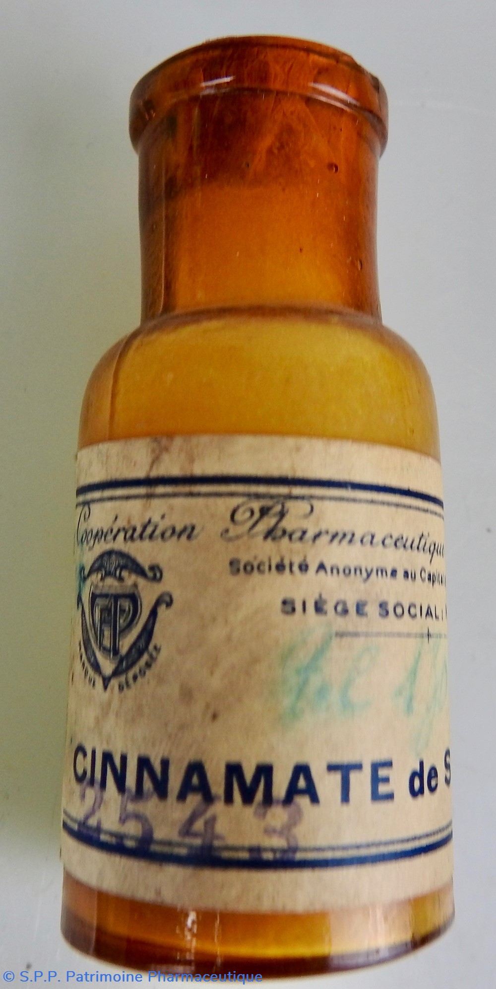 Petit flacon en verre ambré fermé par un bouchon en liège, sur lequel est apposé une étiquette reproduisant le logo du fabricant. Un eétquette de couleur grise mentionne le nom du produit : CINNAMATE de SOUDELe nom du fabricant se retrouve au au haut de l'étiquette : Coopération Pharmaceutique Française, avec le siège social à Melun. Le dessous du flacon est marqué 24 dans le verre lui-même. Une indication de poids est rajoutée sur une étiquette bleue : 10 Gr.. Le flacon contient encore aux 2/3 une poudre blanche.