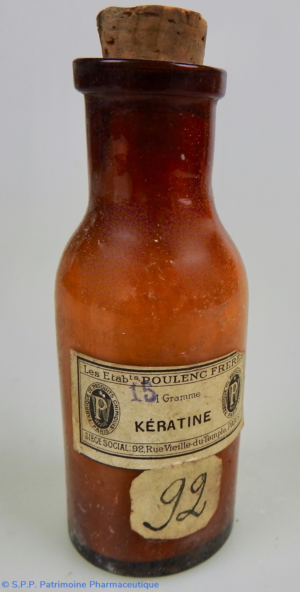 Petit flacon en verre ambré fermé par un bouchon en liège. Un eétquette de couleur grise mentionne le nom du produit : KERATINE.Le nom du fabricant se retrouve au au haut de l'étiquette : Les Etablissements POULENC Frères. Le dessous du flacon est marqué 45 dans le verre lui-même. Une indication de poids est rajoutée sur l'étiquette : 15 Gr. Le flacon contient encore aux 1/3 une poudre blanche.Un étiquette ronde porte un chiffre manuscrit : 92.