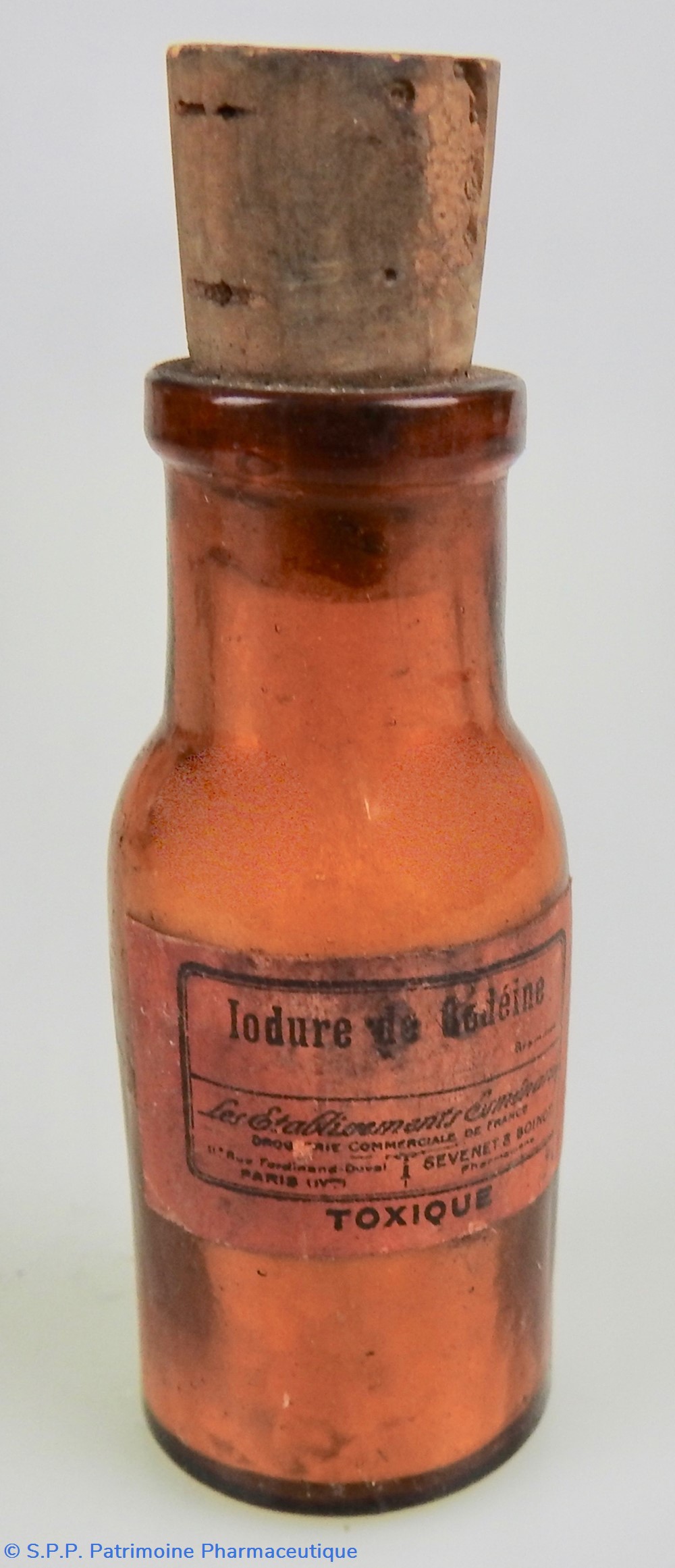Petit flacon en verre ambré fermé par un bouchon en liège. Sur le flacon se trouve une étiquette rouge avec écriture noire indiquant le nom du produit : IODURE DE CODEINE, le nom du fabricant : Les établissement ESMENARD à Paris. L'étiquette porte la mention : TOXIQUE. .De la poudre est encore présente dans le flacon. Le chiffre 15 est inscrit sur le fond du flacon.