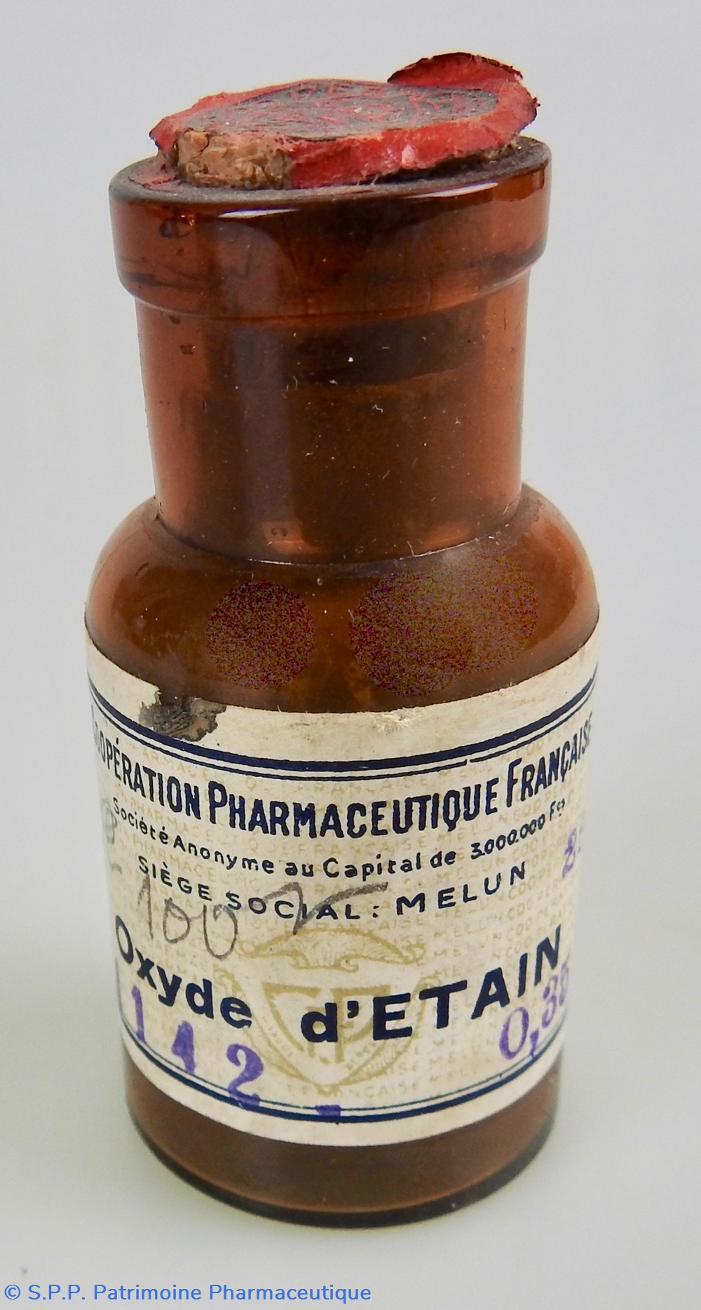 Petit flacon en verre ambré fermé par un bouchon de liège. sUr celui-ci est collé le logo du fabricant rouge et noir. Etiquette frontale avec le nom du produit : Oxyde d'étain et le nom du fabricant : Coopération Pharmaceutique Française. Le cul du flacon porte le chiffre 15/ La contenance initiale de 20 Gr se trouve sur une étiquette bleue à l'arrière du flacon.. Le flacon contient encore une poudre foncée.