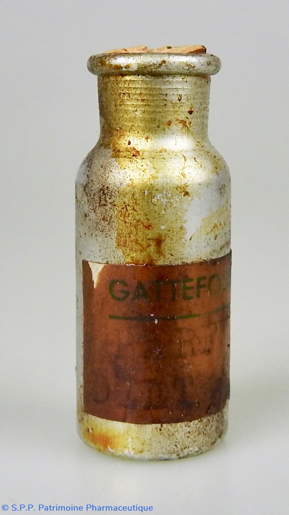 Très petite fiole en aluminium fermée par un bouchon en liège BCEV c en forme de petit bidon. Etiquette illisible sauf sur la partie supérieure : GATTEFOSSE S.F.P.A. Traces marrons sur la fiole et l'Etiquette