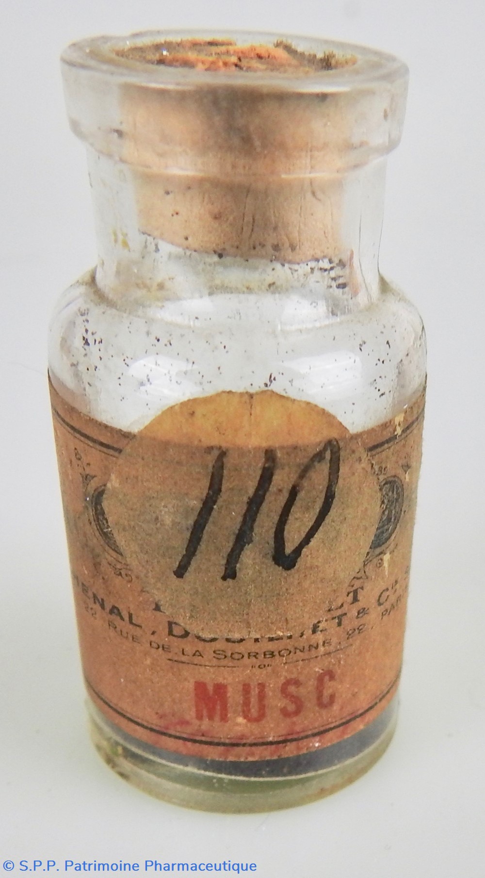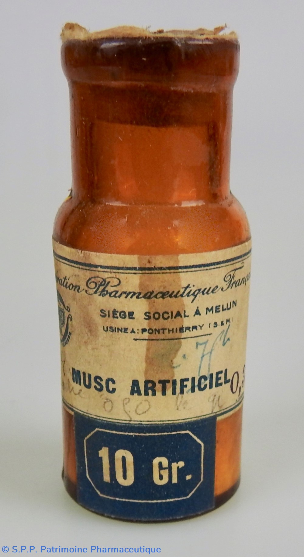 Petit flacon en verre ambré fermé par un bouchon de liège. Etiquette mentionnant le nom du produit : MUSC ARTIFICIEL, le fabricant : Coopération Pharmaceutique Française, le prix de vente manuscrit : 0,30 ou 0,50 le Gr. Un étiquette bleue indique le poids initial : 10 Gr.Au cul du flacon une étiquette ronde indique également le nom du produit : MUSC. Le flacon contient une fine poudre blanche cristallisée.