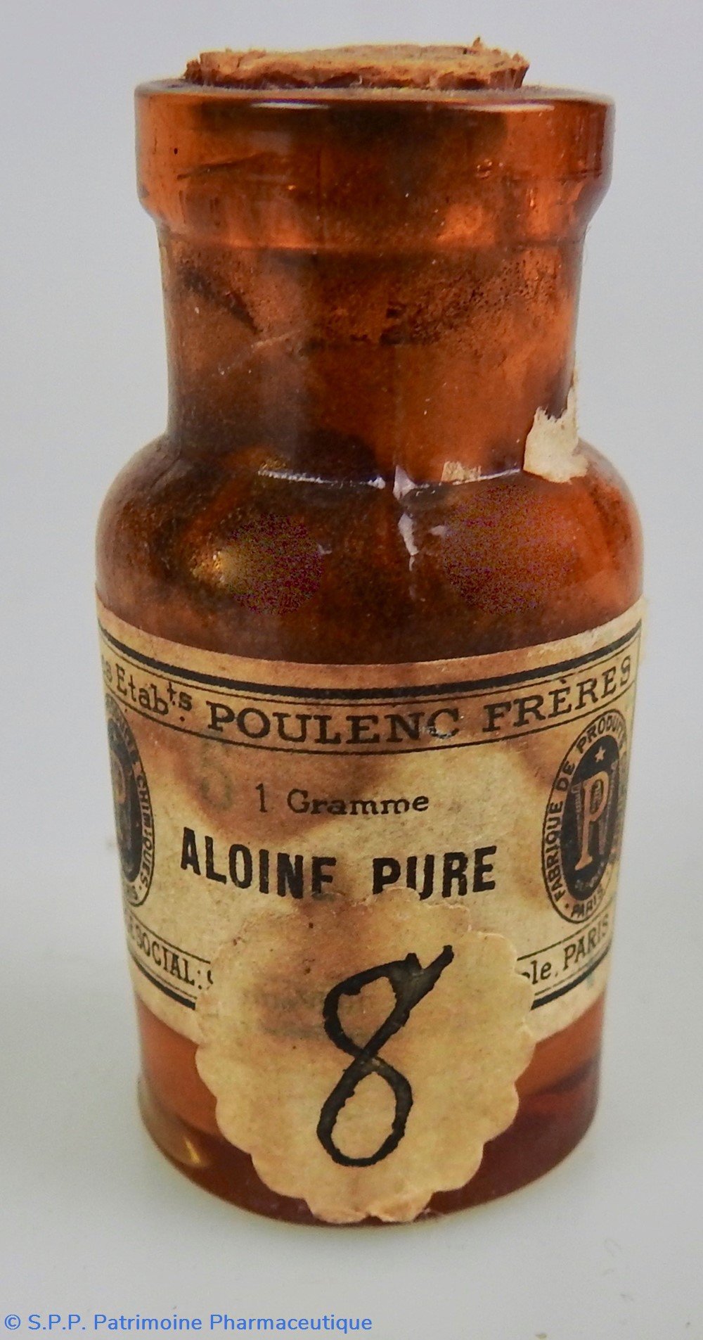 Petit flacon en verre ambré fermé par un bouchon en liège. Frontalement une étiquette indiquant le nom du produit : ALOÏNE PURE, le nom du fabricant: Etablissements Poulenc Frères et le logo du fabricant.Un étiquette manuscrite portant le chiffre 8 est collée sur l'étiquette principale . A l'arrière une petite étiquette collée indique de façon manuscrite : Vendu 240f le Kg. Le flacon contient encore de la poudre.
