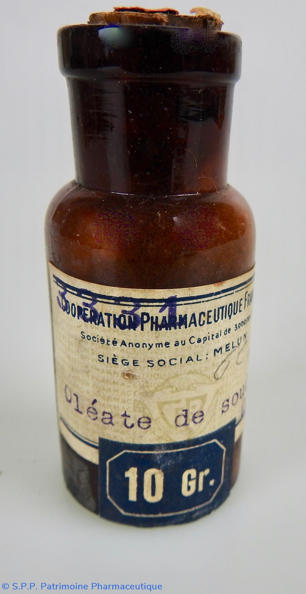 Petit flacon de verre ambré fermé par un bouchon de liège . Etiquette frontale indiquant le nom du produit : Oléate de Soude, ainsi que le nom du fabricant : Coopération Pharmaceutique Française; Un numéro est imprimé sur la partie supérieure gauche de l'étiquette 3331. Sur la partie inférieure droite de l'étiquette est indiqué 0,25. Le cul du flacon porte le numéro 24. Une petite étiquette bleue indique le poids initial du produit : 10 Gr