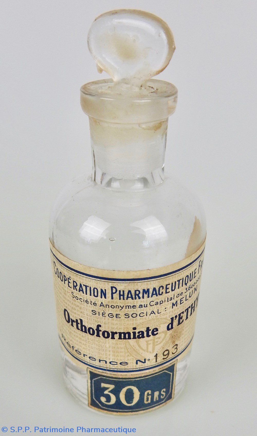 Flacon en verre transparent fermé à l'émeri par un bouchon de verre dont le béton de préhension est en forme d'éventail. Il est impossible de l'ouvrir, mais le flacon contient encore du liquide sur une hauteur de 8 mm. Bon état général? mention sur le cul du flacon : 45. Un étiquette grise mentionne le contenu du flacon ainsi sue son fabricant : Coopération Pharmaceutique Française à Melun. Référence : N° 193. Le poids d'origine du contenant est indiqué sur une étiquette bleue : 30 Grs