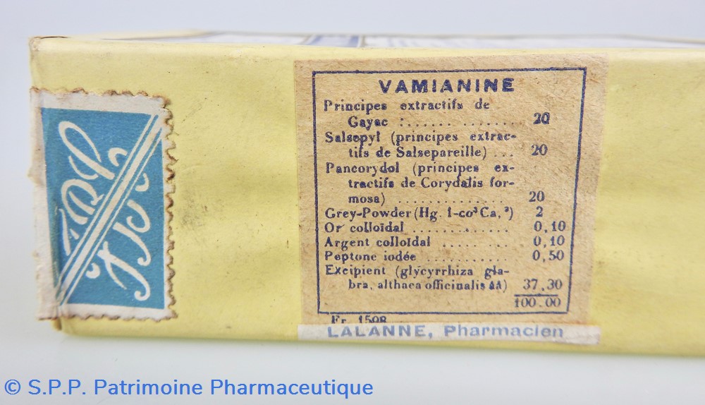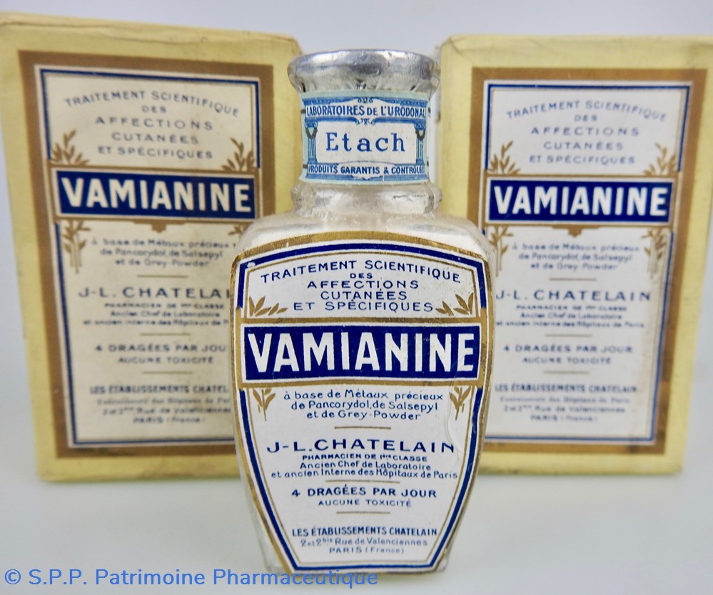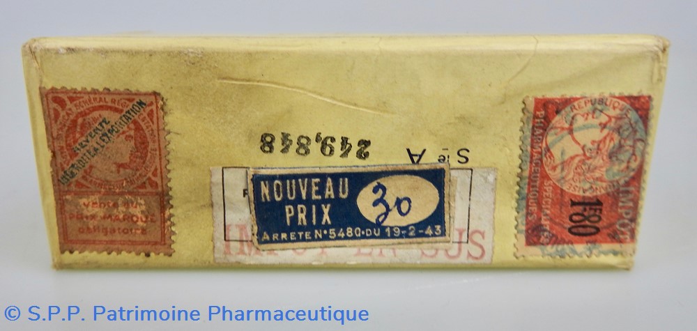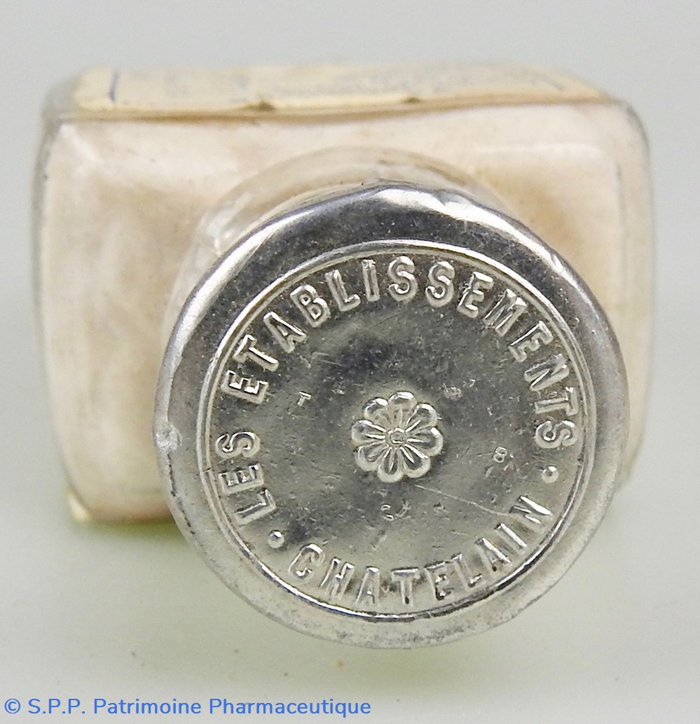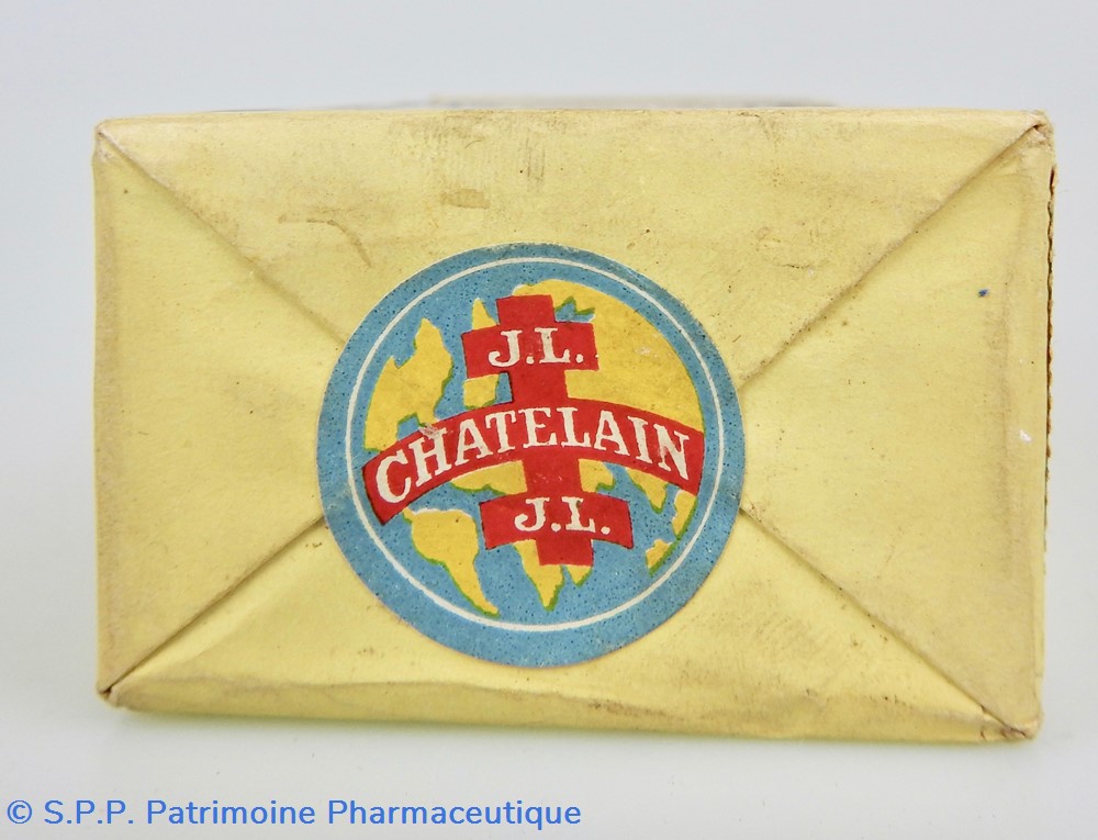 Matériaux : L'emballage est en carton, recouvert d'un papier transparent genre cellophane jaune pâle, dont les extrémités sont scellées par des pastilles adhésives portant la mention J.L. Châtelain. A l'intérieur se trouve un flacon en verre fermé par un bouchon en aluminium portant la mention : Les Etablissements Chatelain. Sur la face latérale gauche On peut lire la composition du médicament sur laquelle est collée un étiquette portant la mention : Pharmacien Lalanne et une autre étiquette portant les lettre FBC. La face latérale droite quant à elle Un timbre fiscal au montant de 1F80. Un timbre portant la mention : revente interdite à l'exportation et un timbre portant la mention : Nouveau Prix 30 francs. Egalement Cie A 249,848
