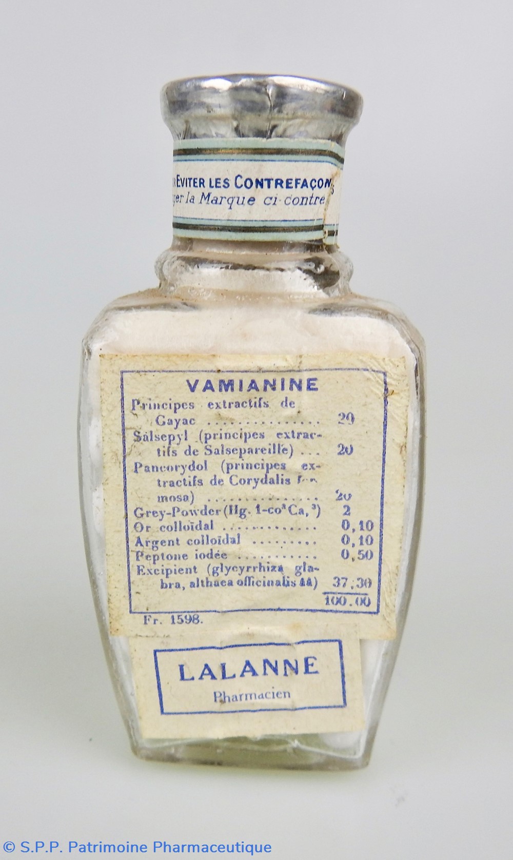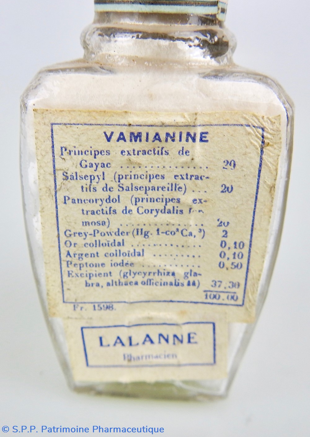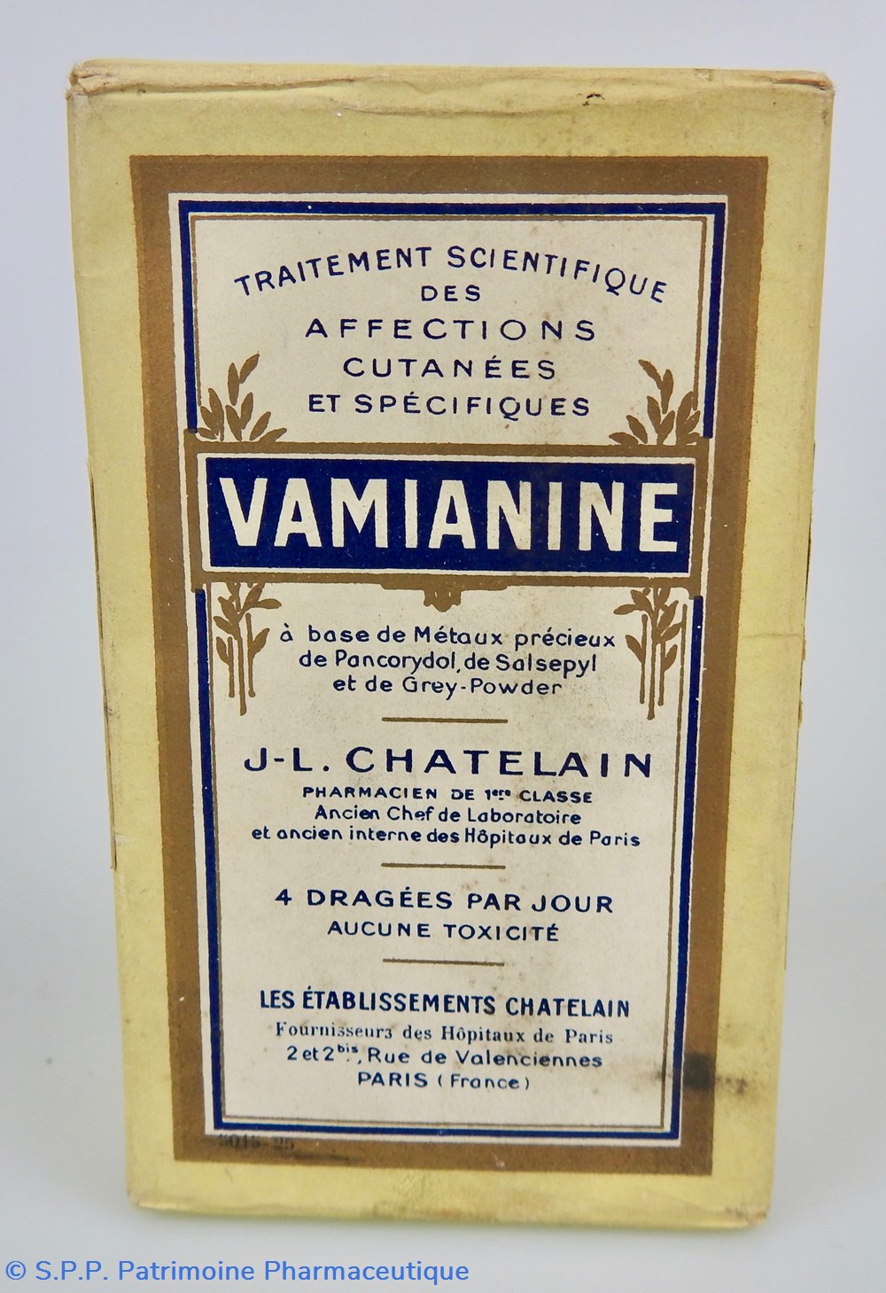 Matériaux : L'emballage est en carton, recouvert d'un papier transparent genre cellophane jaune pâle, dont les extrémités sont scellées par des pastilles adhésives portant la mention J.L. Châtelain. A l'intérieur se trouve un flacon en verre fermé par un bouchon en aluminium portant la mention : Les Etablissements Chatelain. Sur la face latérale gauche On peut lire la composition du médicament sur laquelle est collée un étiquette portant la mention : Pharmacien Lalanne et une autre étiquette portant les lettre FBC. La face latérale droite quant à elle Un timbre fiscal au montant de 1F80. Un timbre portant la mention : revente interdite à l'exportation et un timbre portant la mention : Nouveau Prix 30 francs. Egalement Cie A 249,848