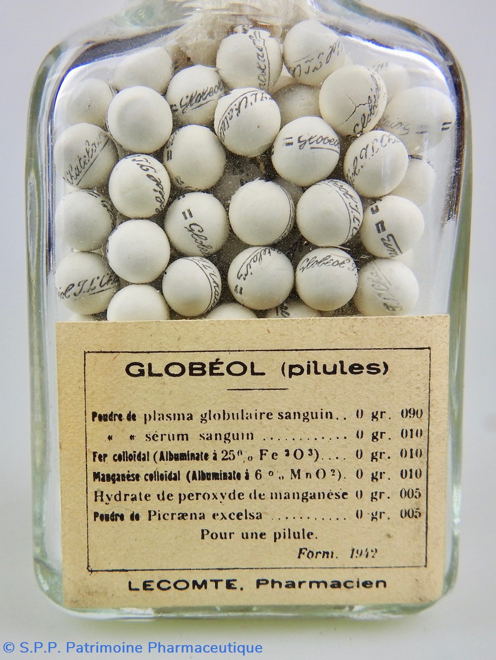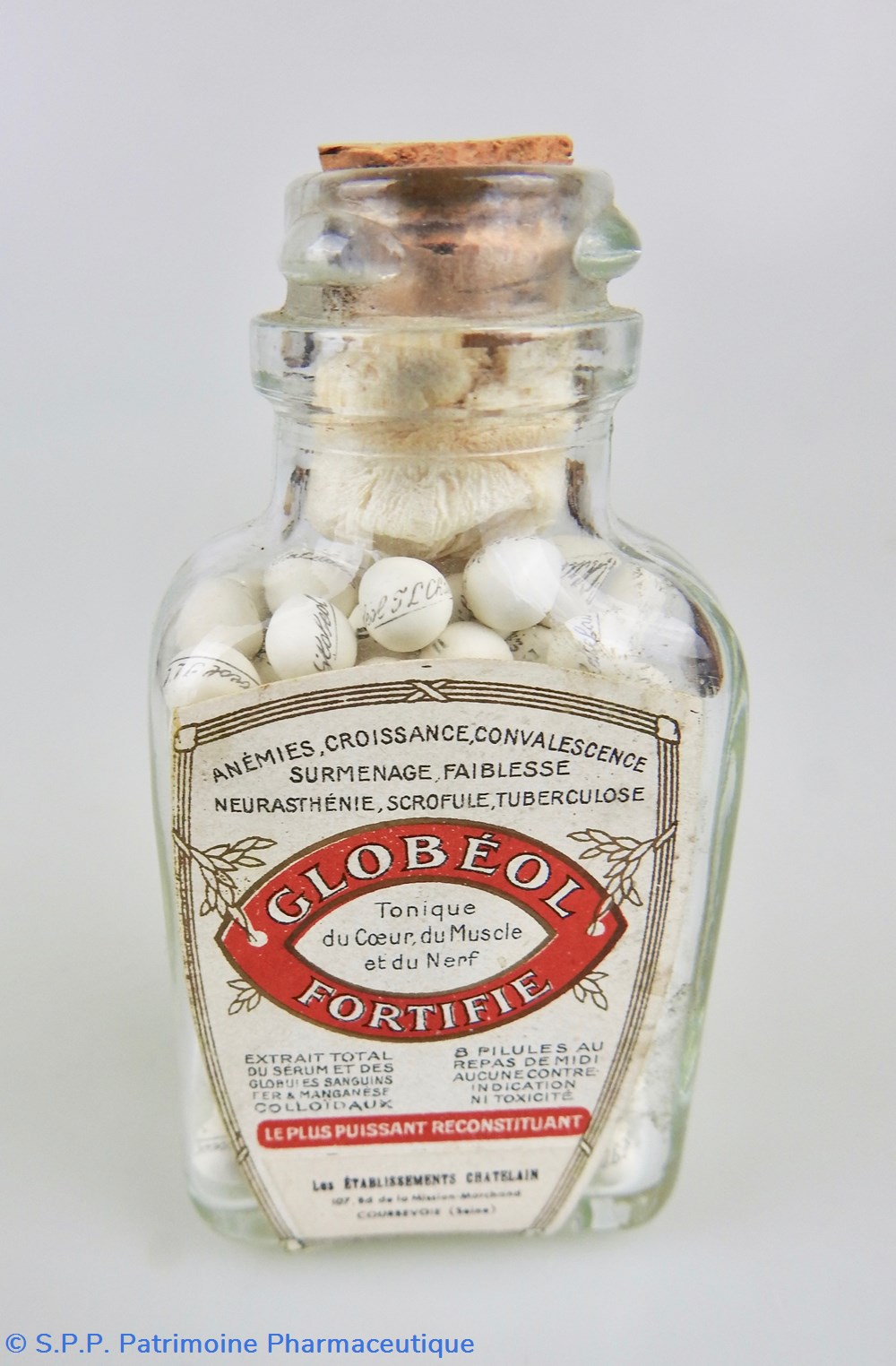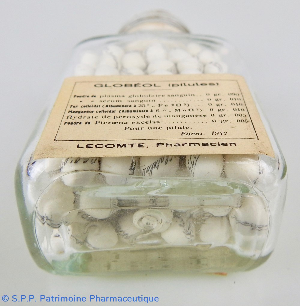 Flacon en verre transparent de forme parallélépipédique surmonté d'un goulot fermé par un bouchon de liège. Le cul du flacon porte le numéro 2 gravé dans la matière. Ce flacon contient des petites pilules blanches qui portent chacune l'inscription "Globéol Chatelain". Le flacon est complètement rempli et un tampon d'ouate isole les pilules du bouchon en liège. La face antérieure est garnie d'une étiquette portant le nom du médicament, le usages thérapeutiques, la posologie, une partie des composants et le nom et l'adresse du fabricant. Au verso une étiquette indique la formule du médicament et le nom du pharmacien : Lecomte. Bon état général.