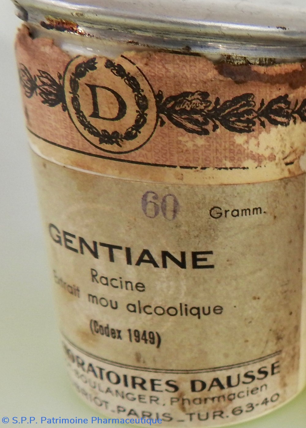 Une étiquette centrale indique la qualité du contenant GENTIANE Racine extrait mou alcoolique (Codex 1949)ainqi que le nom et les coordonnées du fabricant / Laboratoires Dausse à Paris. Le poids du contenant à l'origine est également marqué : 60 grammes.Le haut du pote est entouré d'une étiquette circulaire avec le "Logo" de Dausse. Cette étiquette est fortement endommagée. Sur le cul du pot existe également une étiquette circulaire mentionnant Gentiane alcoolique le poids 60 et le chiffre 357. Le pot est légèrement écorné sur sa base inférieure gauche.