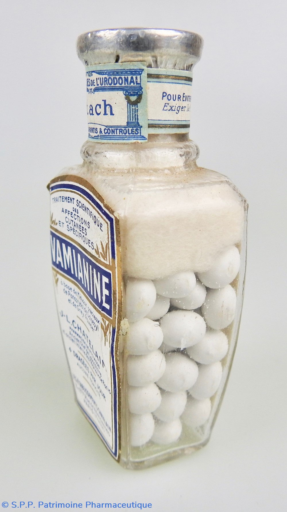 Flacon en verre blanc de forme légèrement évasée avec un goulot fermé par un bouchon serti en aluminium et portant la mention "Etablissement Chatelain" au pourtour avec une fleur au centre. Le flacon n'a jamais été ouvert.Il contient des dragées oblongues blanches de petite taille.. Bon état général.