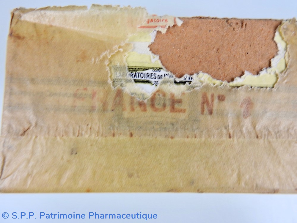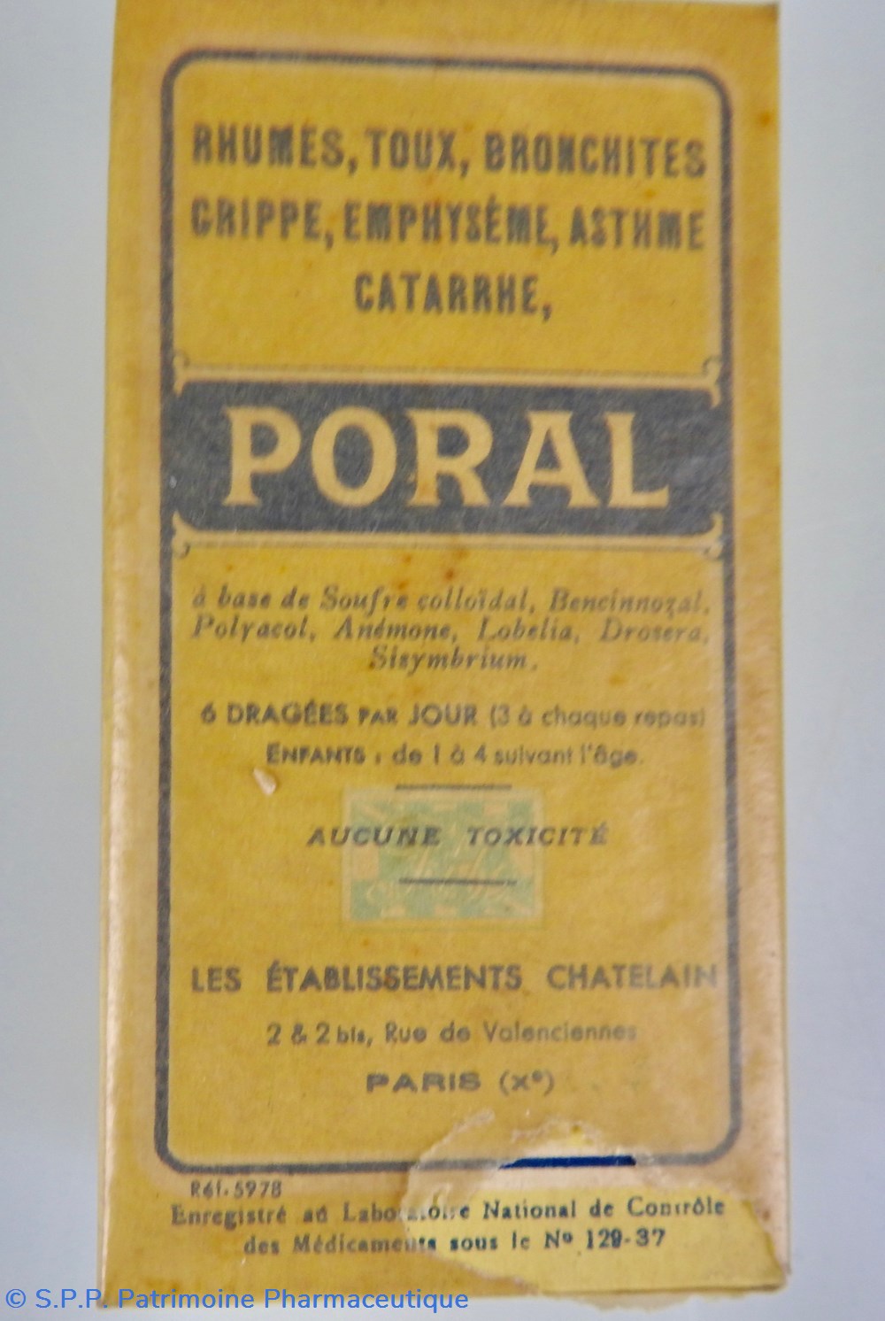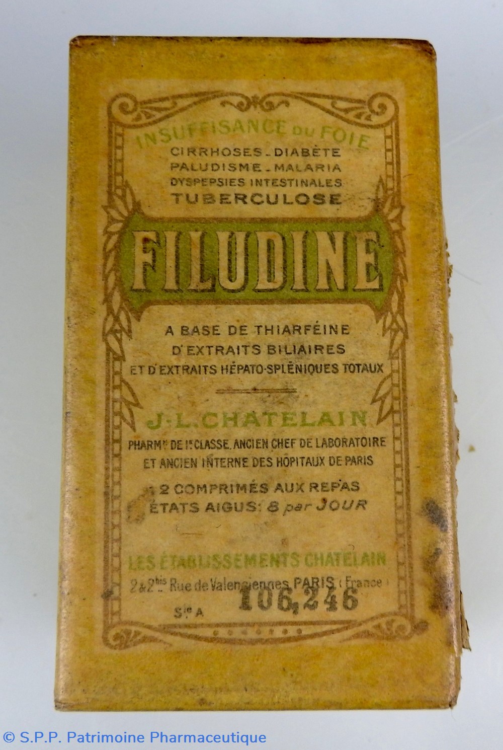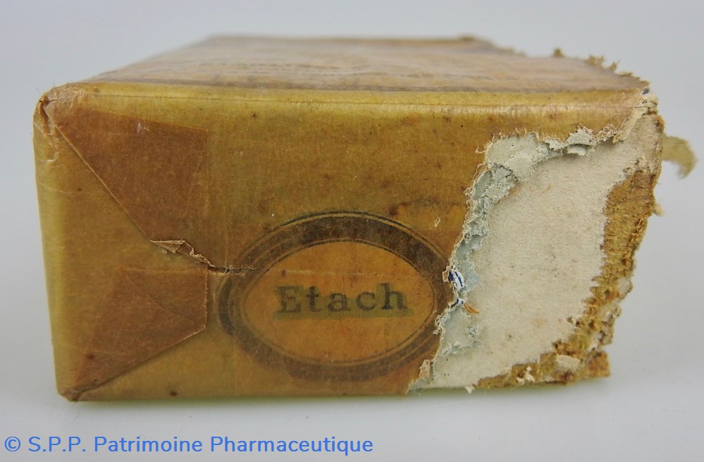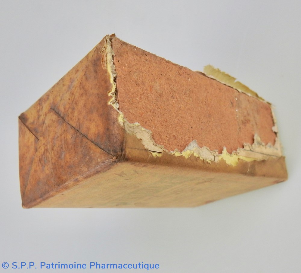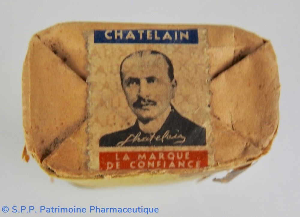 Conditionnement parallélépipédique sous carton recouvert d'un papier transparent jauni. Il contient des comprimés. Le papier transparent est partiellement déchiré sur la face droite. Le conditionnement comporte toutes les indications concernant le contenu : comprimés, composition, effets thérapeutiques, fabricant (Etablissements Châtelain), Une mention à l'avant SieA 106-246.