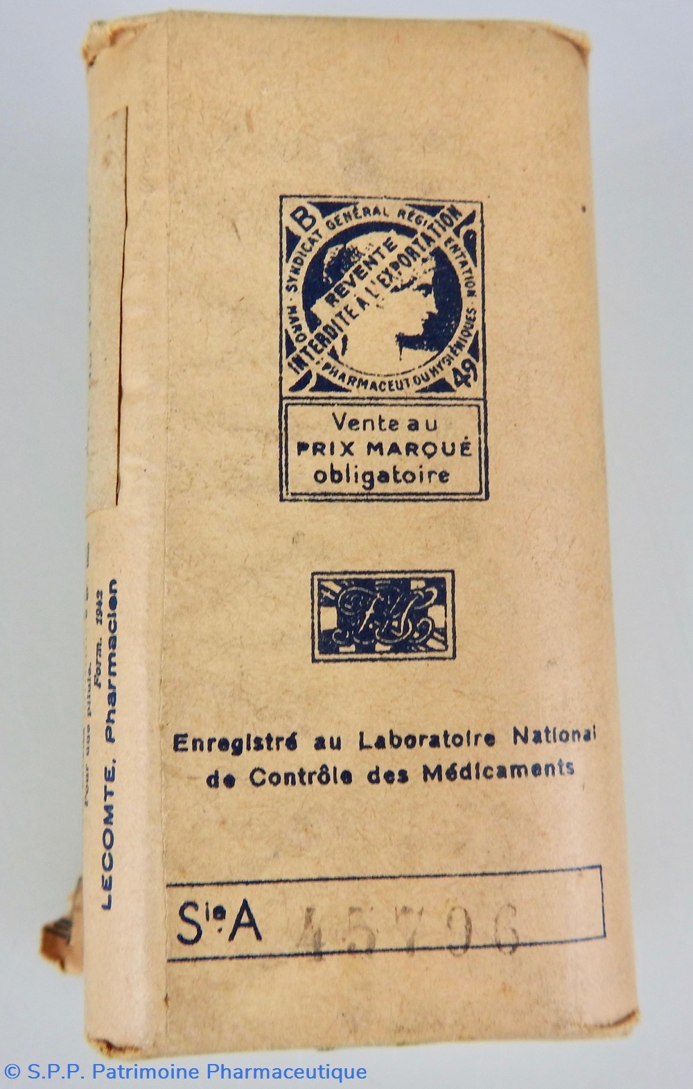 Conditionnement parallélépipédique en carton, recouvert d'un papier transparent jauni, déchiré sur toute la face antérieure. Le conditionnement est clos sur le dessus par un timbre représentant le fabricant JL Châtelain , avec sa signature et la mention : La marque de confiance. Le dessous est fermé par une étiquette ronde représentant une planisphère sur laquelle s'inscrit J.L. Chatelain. La partie droite comporte la formule des pilules et le nom du pharmacien : Lecomte ainsi que le prix sur une étiquette rajoutée : 23 Frs. A l'arrière d'autres mentions : vente à l'exportation interdite, vente au prix marqué, enregistré au laboratoire national de contrôle des médicaments Sie A : 45796