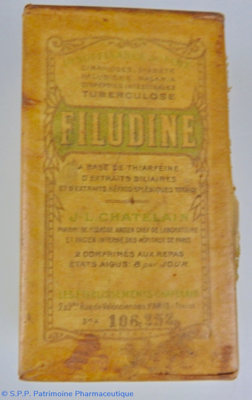 Conditionnement parallélépipédique sous carton recouvert d'un papier transparent jauni. Il contient des comprimés. Le papier transparent est partiellement déchiré sur la face droite. Le conditionnement comporte toutes les indications concernant le contenu : comprimés, composition, effets thérapeutiques, fabricant (Etablissements Châtelain), Une mention à l'avant SieA 106-252.