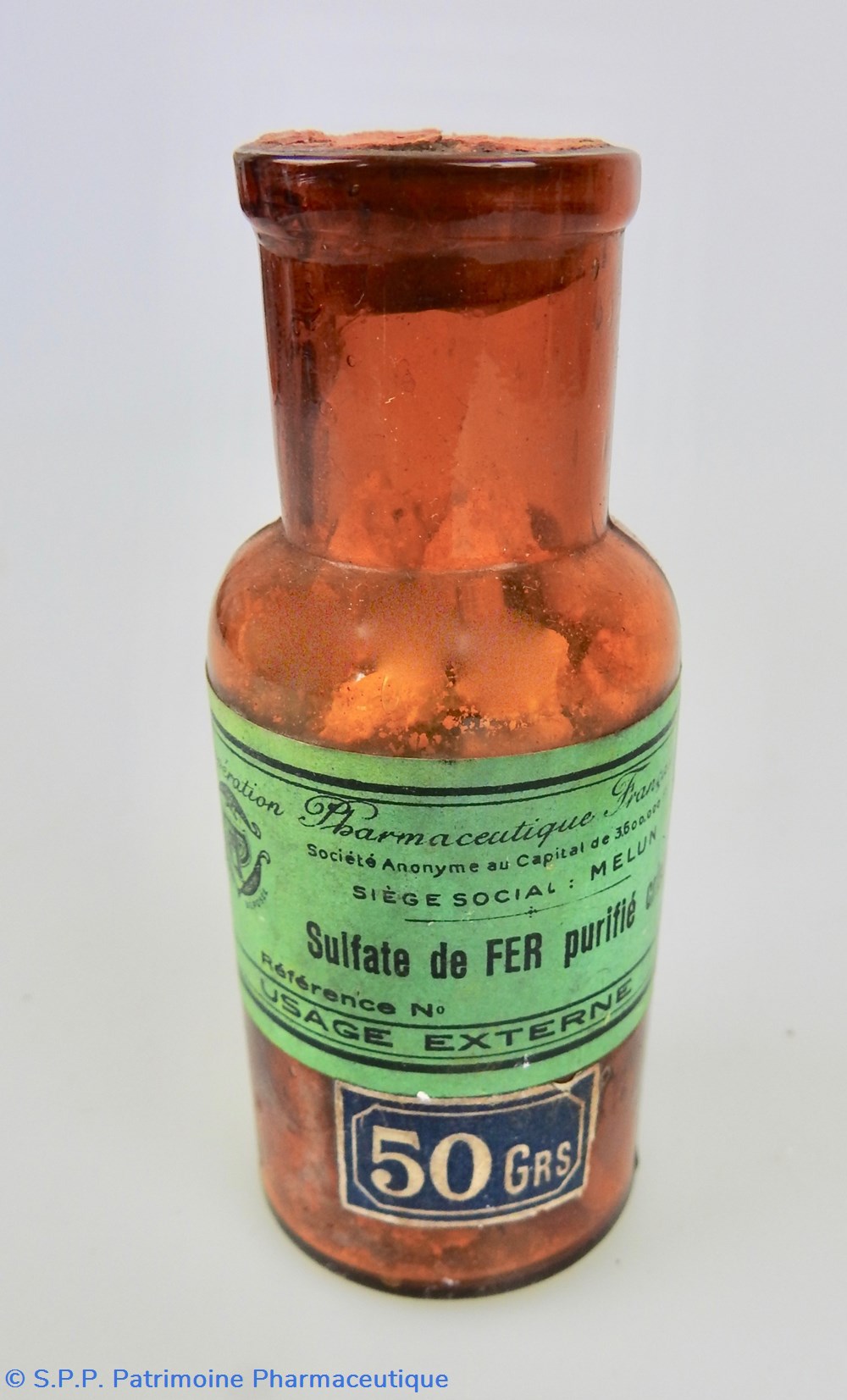 La référence est illisible. La mention : USAGE EXTERNE est au bas de l'étiquette et le fabricant : Coopération Pharmaceutique Française figure en haut avec son logo à gauche. Le poids du contenant est indiqué sur une petite étiquette bleue : 50 Gris. La mention du contenant est également indiquée sur une étiquette ronde au cul du flacon.