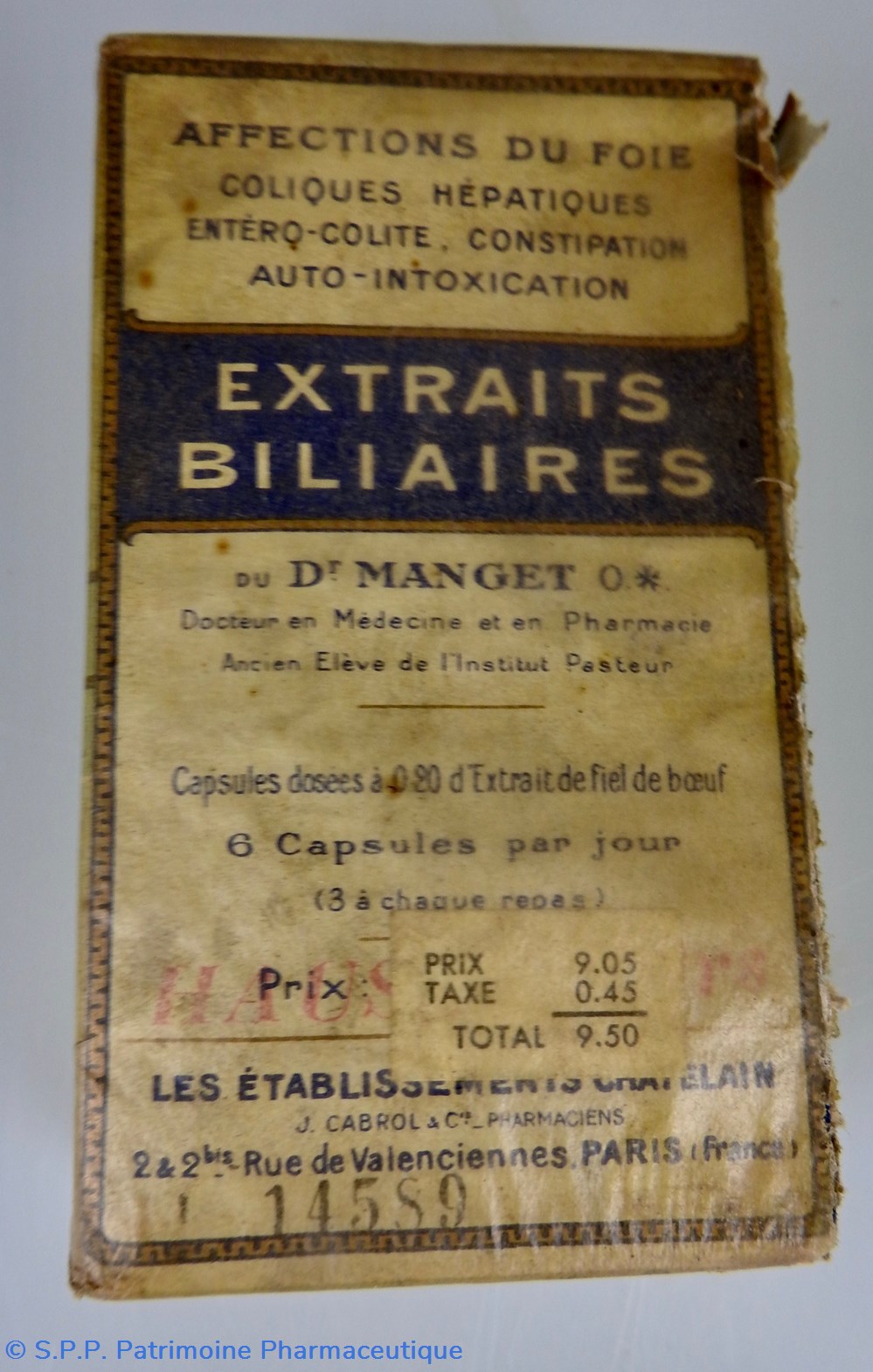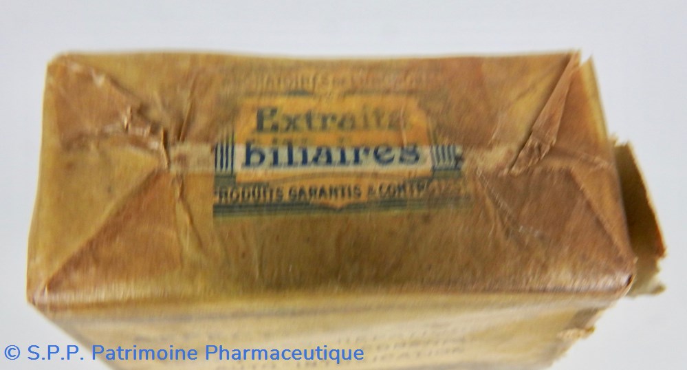 Conditionnement parallélépipédique sous carton recouvert d'un papier transparent jauni, en mauvais état, mais non utilisé. Il contient des Capsules Le papier transparent est partiellement déchiré sur la face droite. Le conditionnement compte toutes les indications concernant le contenu : capsules, composition, effets thérapeutiques, fabricant (Etablissements Châtelain), Une mention à l'avant SieA 145-89. Une étiquette sur le dus portant le nom Extraits Bilaires fait également mention de Laboratoires de l'Urodonal.