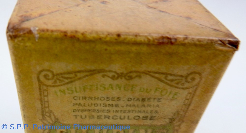 Conditionnement parallélépipédique en carton, recouvert d'un papier transparent jauni. légèrement déchiré à la partie basse droite . Le conditionnement compte toutes les indications concernant le contenu : dragées, composition, effets thérapeutiques, fabricant (Etablissements Châtelain), enregistrement du médicament : 129-37 et le prix rajouté sur une étiquette bleue à l'arrière : Nouveaux prix : 18,10. (Ainsi que le nom du pharmacien responsable: Lecomte). Un mention à l'arrière Sie A 76,890 Sur le dessus de la boite se trouve un genre de timbre représentant J.L. Chatelain, le fabricant.