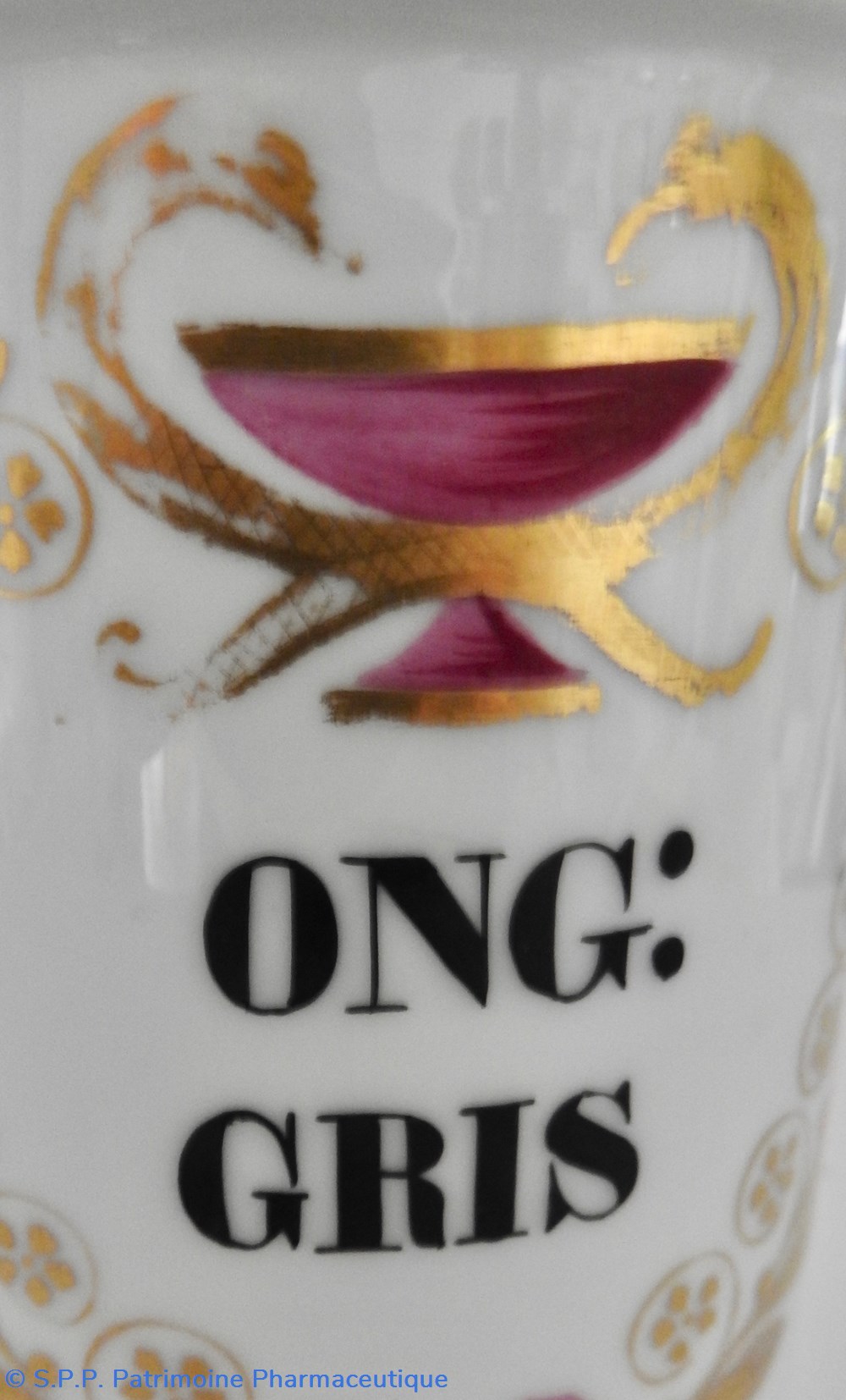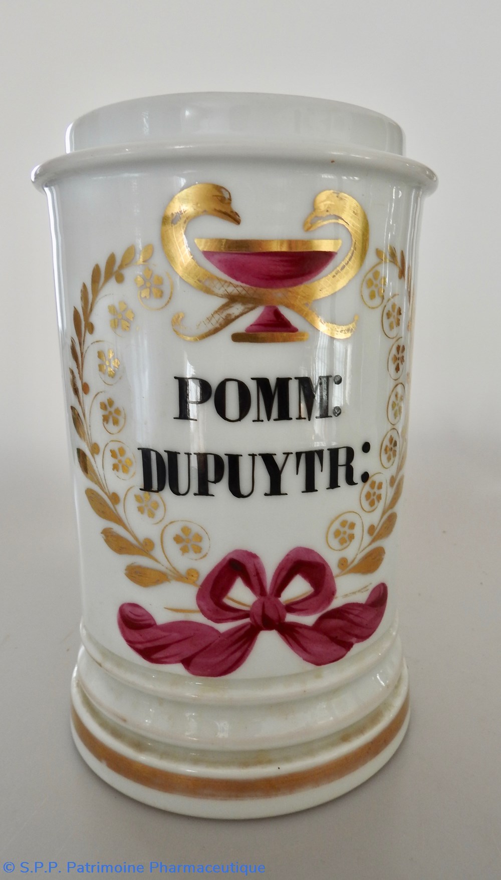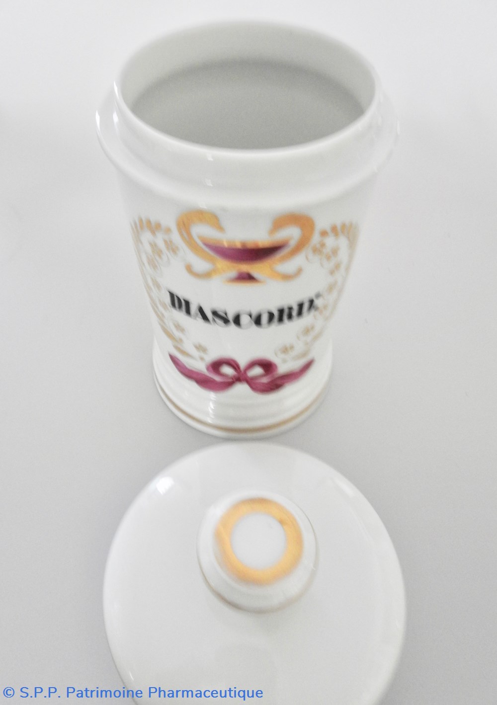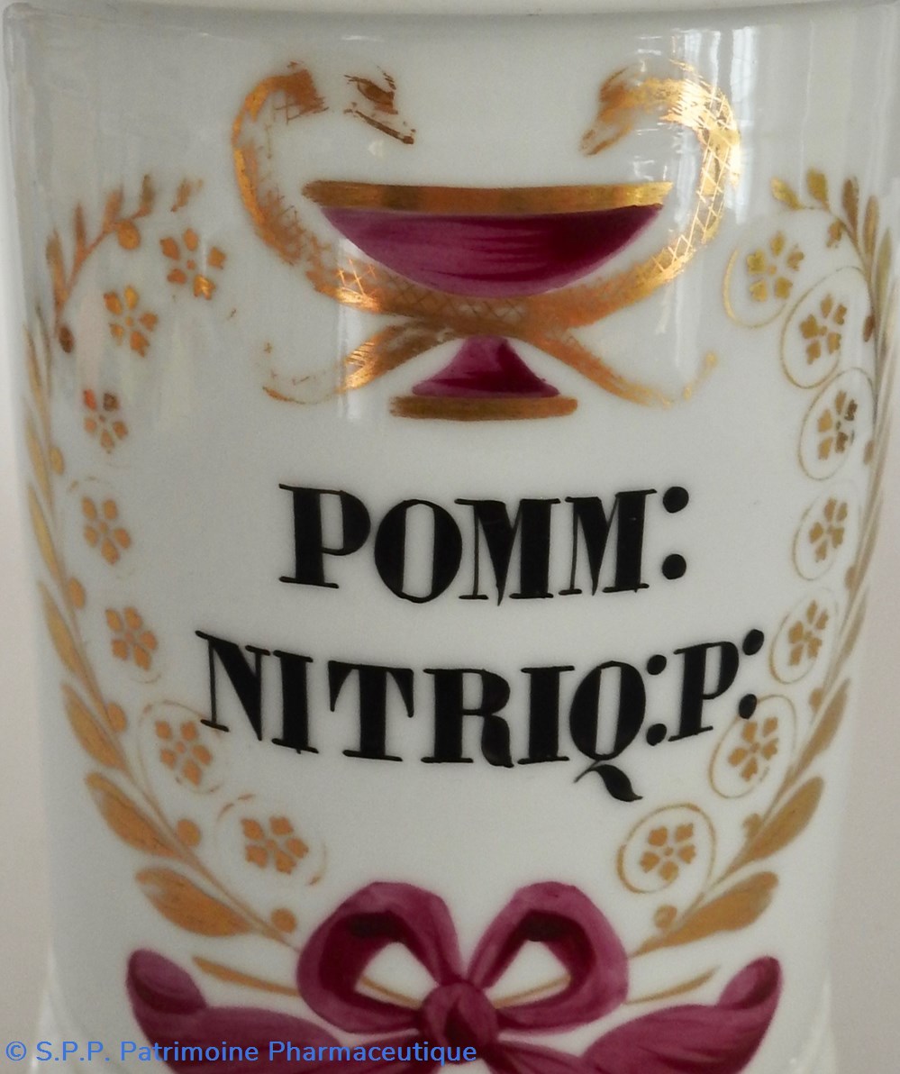 Pot de faïence blanche de bon état général. L'inscription écrite en noir est entourée de couronnes de fleurs et de feuilles dorées. Les dorures ne sont pas endommagées. Ces couronnes se terminent dans la partie supérieure par une coupe d'Hygie rose entourée de serpents dorés de chaque coté. Dans la partie inférieure de l'inscription un grand noeud rose enlace les tiges des feuilles et fleurs.