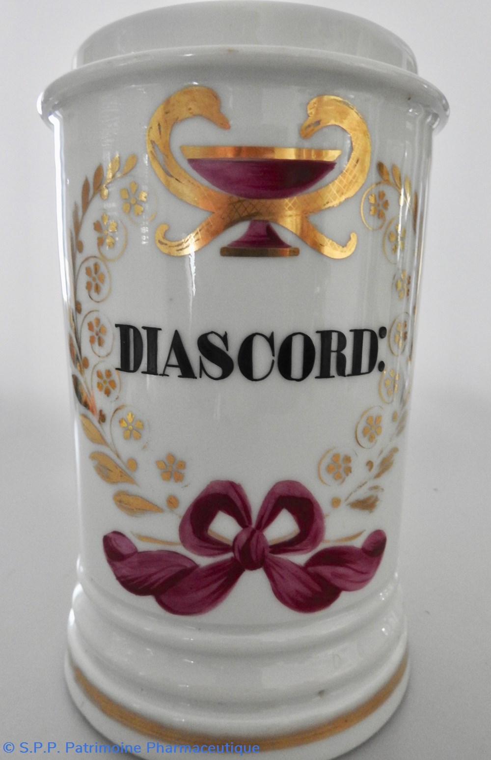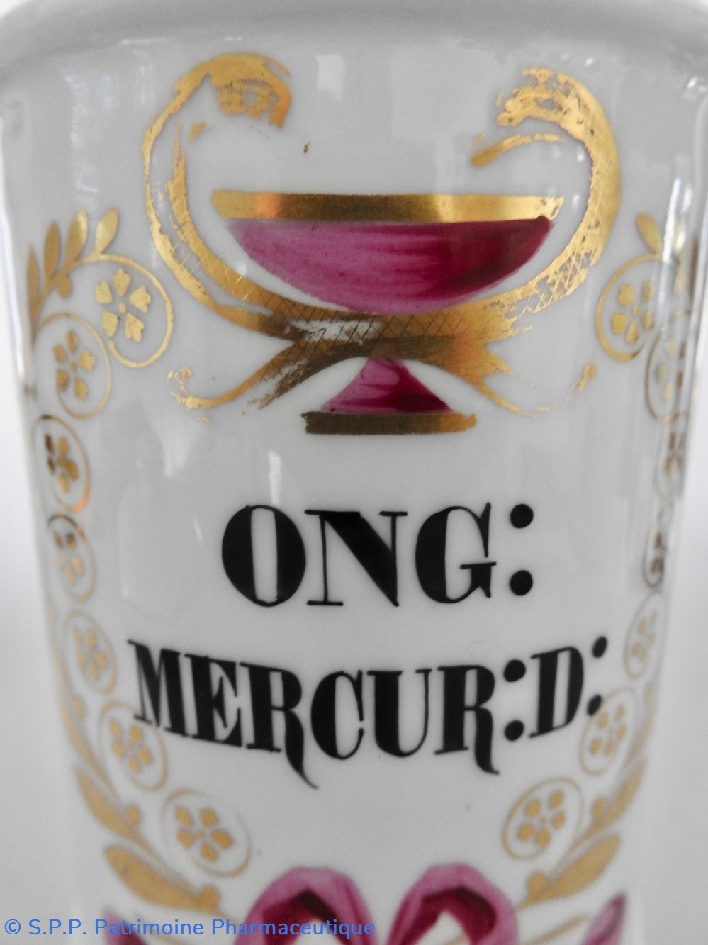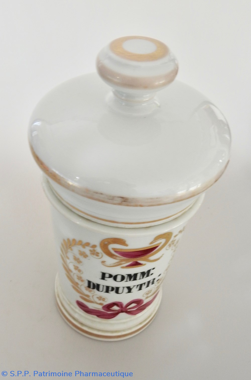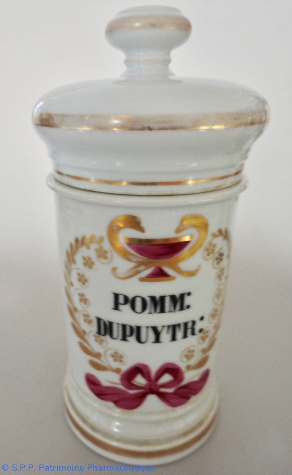 Pot de faïence blanche de bon état général. L'inscription écrite en noir est entourée de couronnes de fleurs et de feuilles dorées. Les dorures ne sont pas endommagées. Ces couronnes se terminent dans la partie supérieure par une coupe d'Hygie rose entourée de serpents dorés de chaque coté. Dans la partie inférieure de l'inscription un grand noeud rose enlace les tiges des feuilles et fleurs.