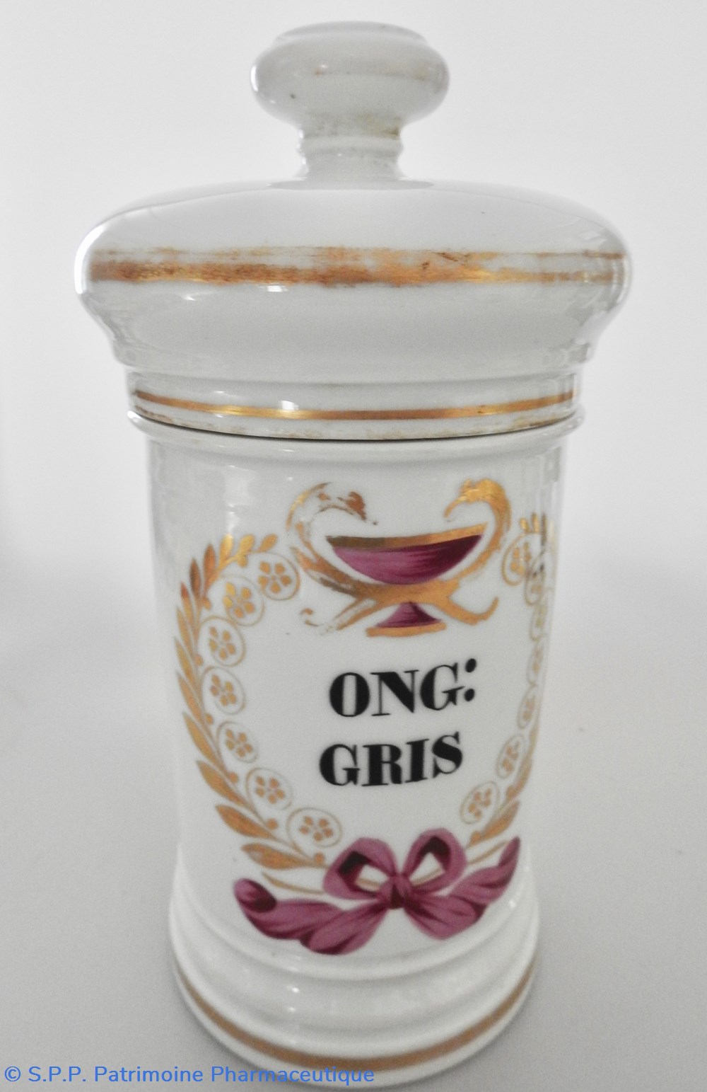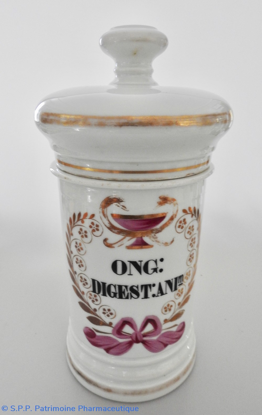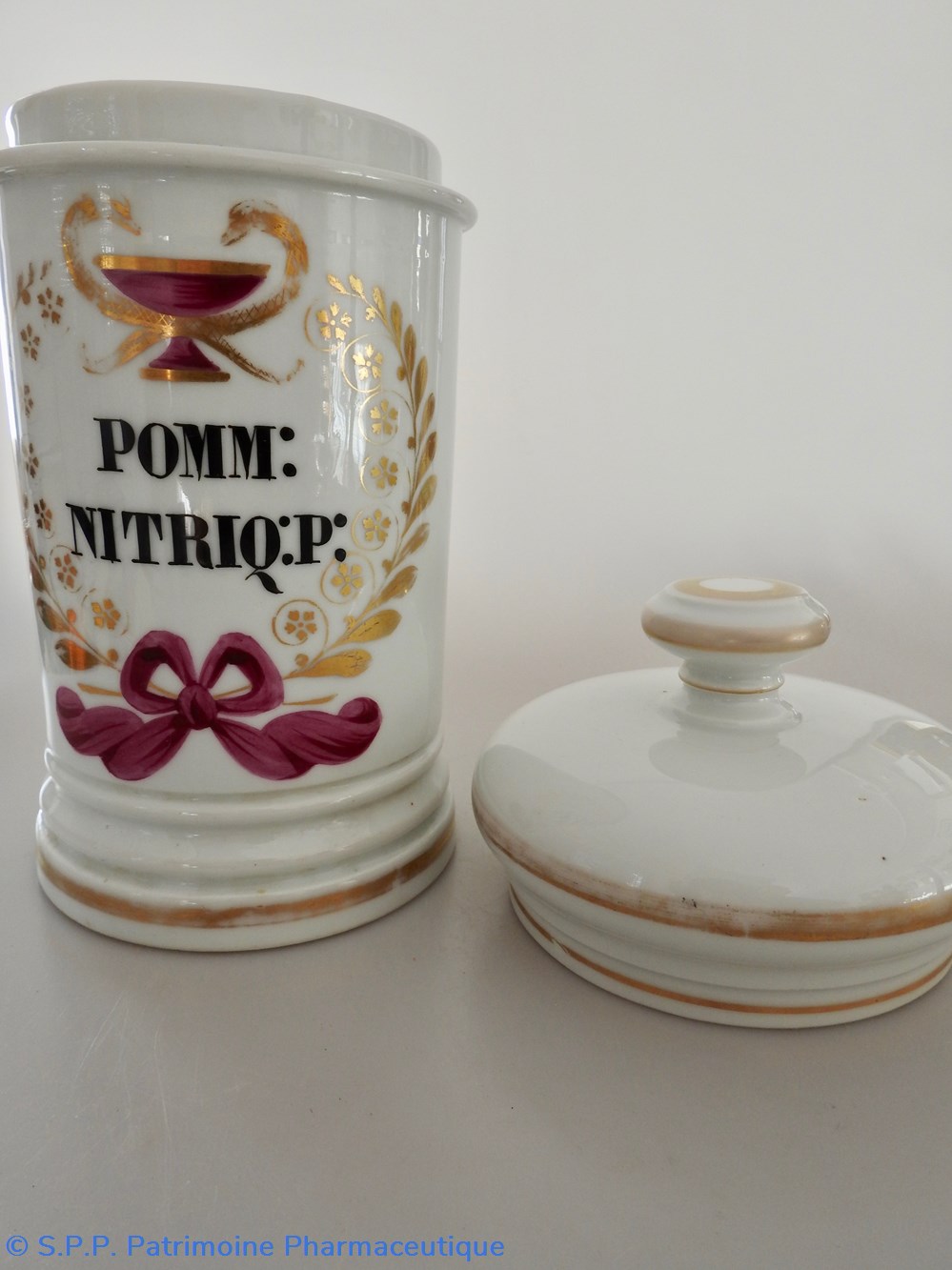 Pot de faïence blanche de bon état général. L'inscription écrite en noir est entourée de couronnes de fleurs et de feuilles dorées. Les dorures ne sont pas endommagées. Ces couronnes se terminent dans la partie supérieure par une coupe d'Hygie rose entourée de serpents dorés de chaque coté. Dans la partie inférieure de l'inscription un grand noeud rose enlace les tiges des feuilles et fleurs. Dorures partiellement effacée sur le couvercle