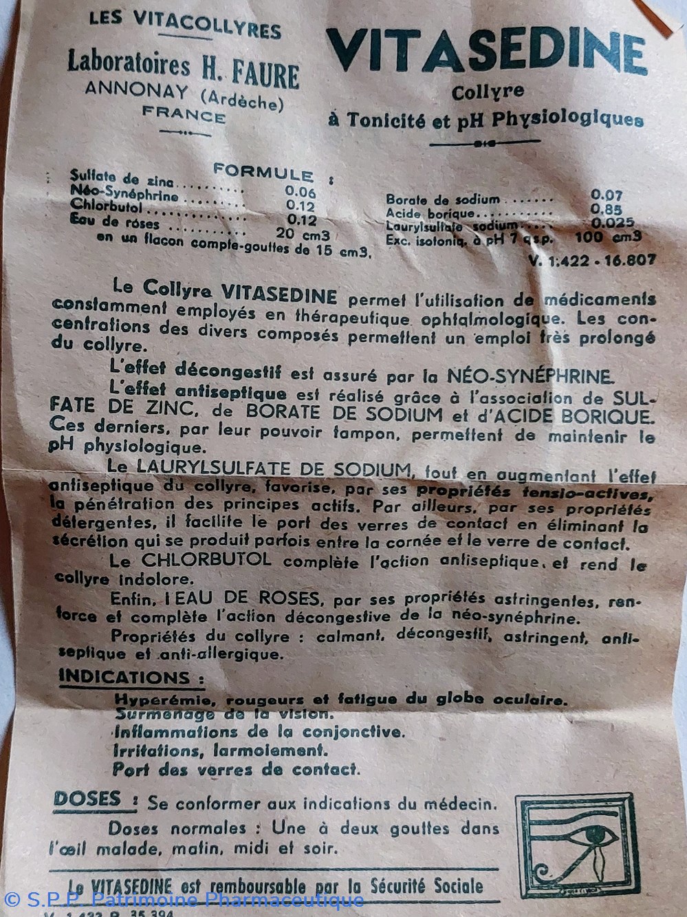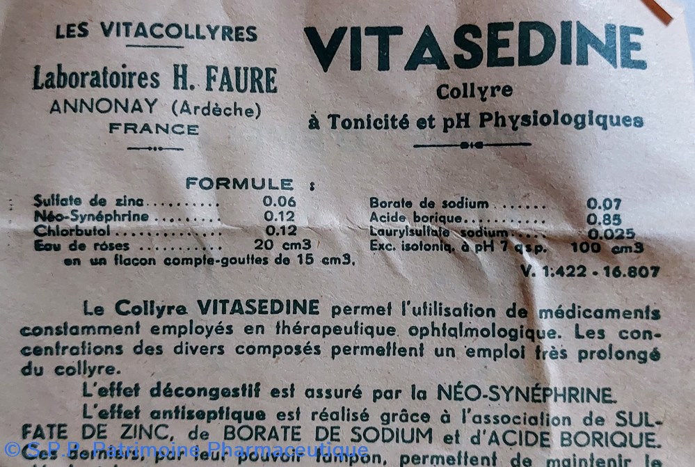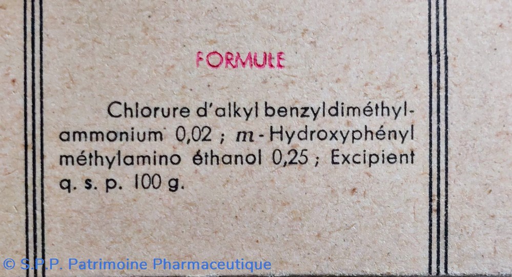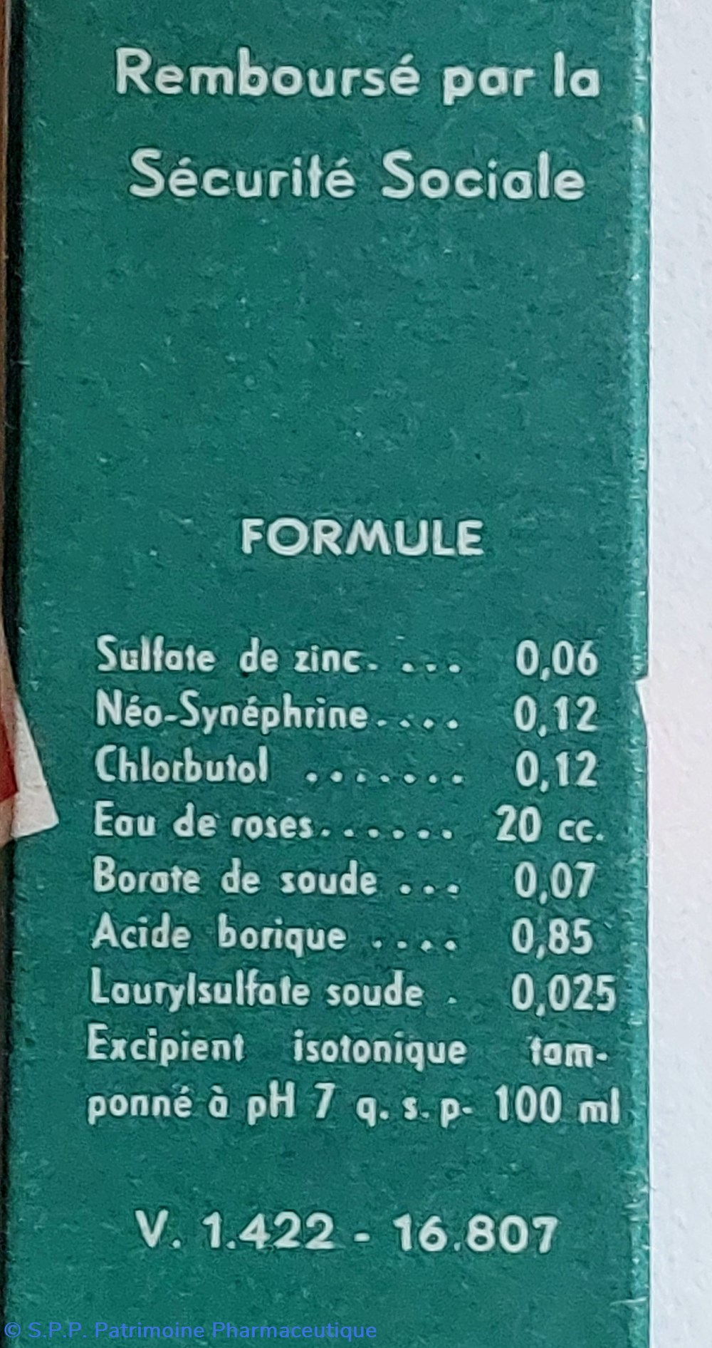 Formule Sulfate de Zinc. Néo - sinephrine. Chlorbutol. Eau de roses. Borate de Soude. Acide borique. Laurylsulfate soude..