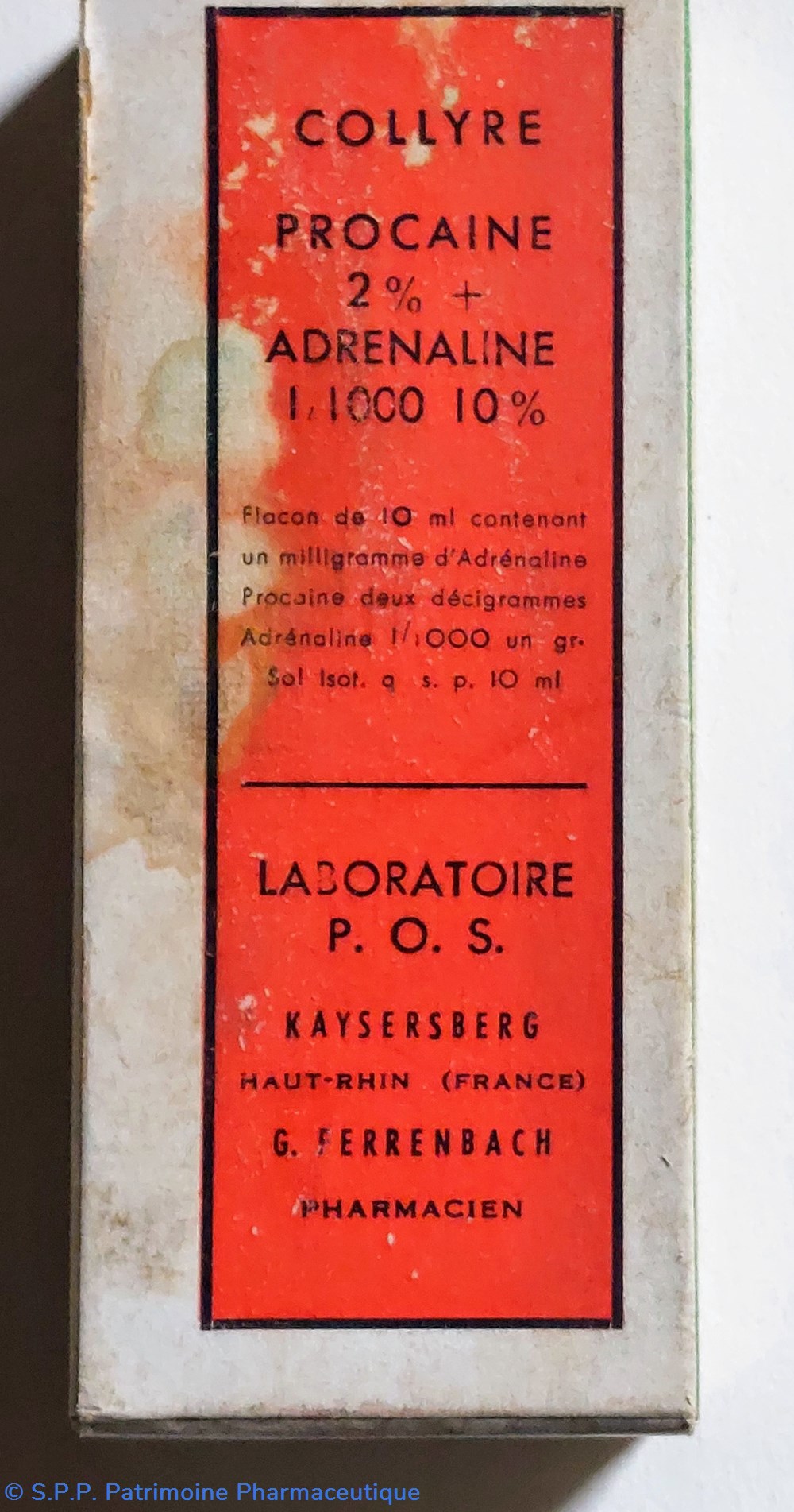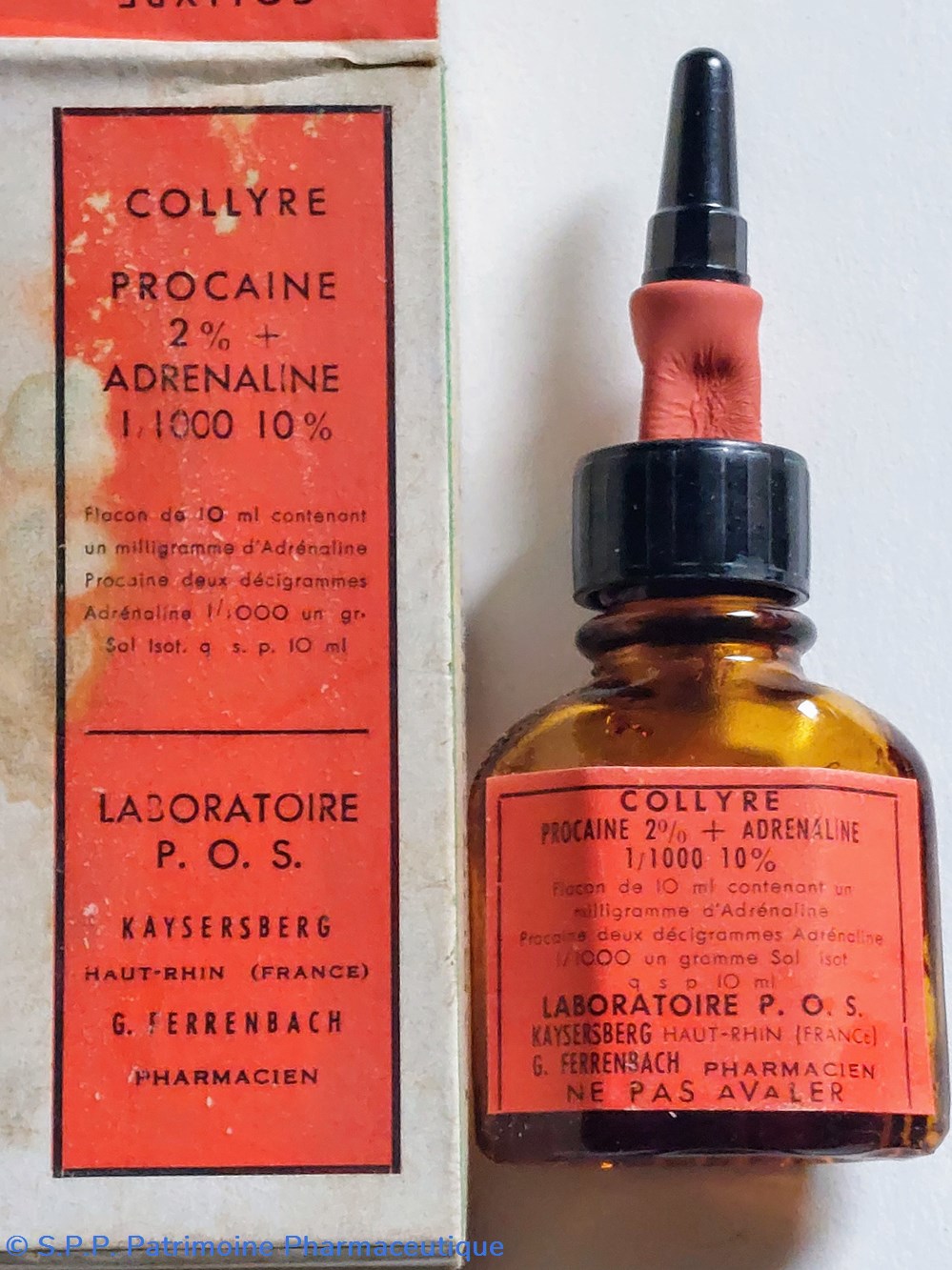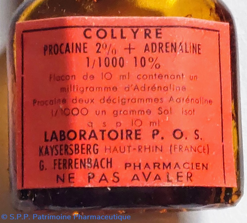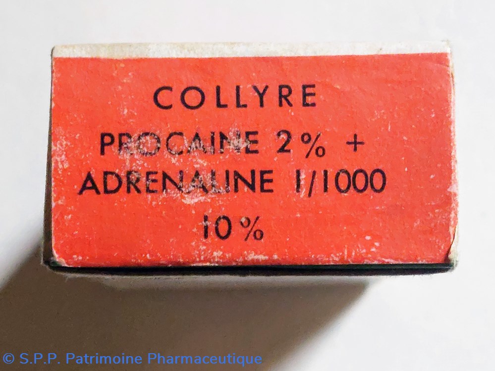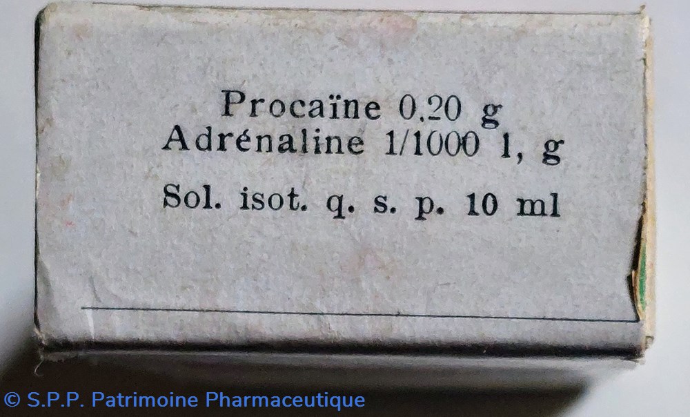 Flacon en verre de 10 ml contenant 1 mg d'adrénaline Procaïne et 2 cg d'adrénaline 1/1000 1 gr.