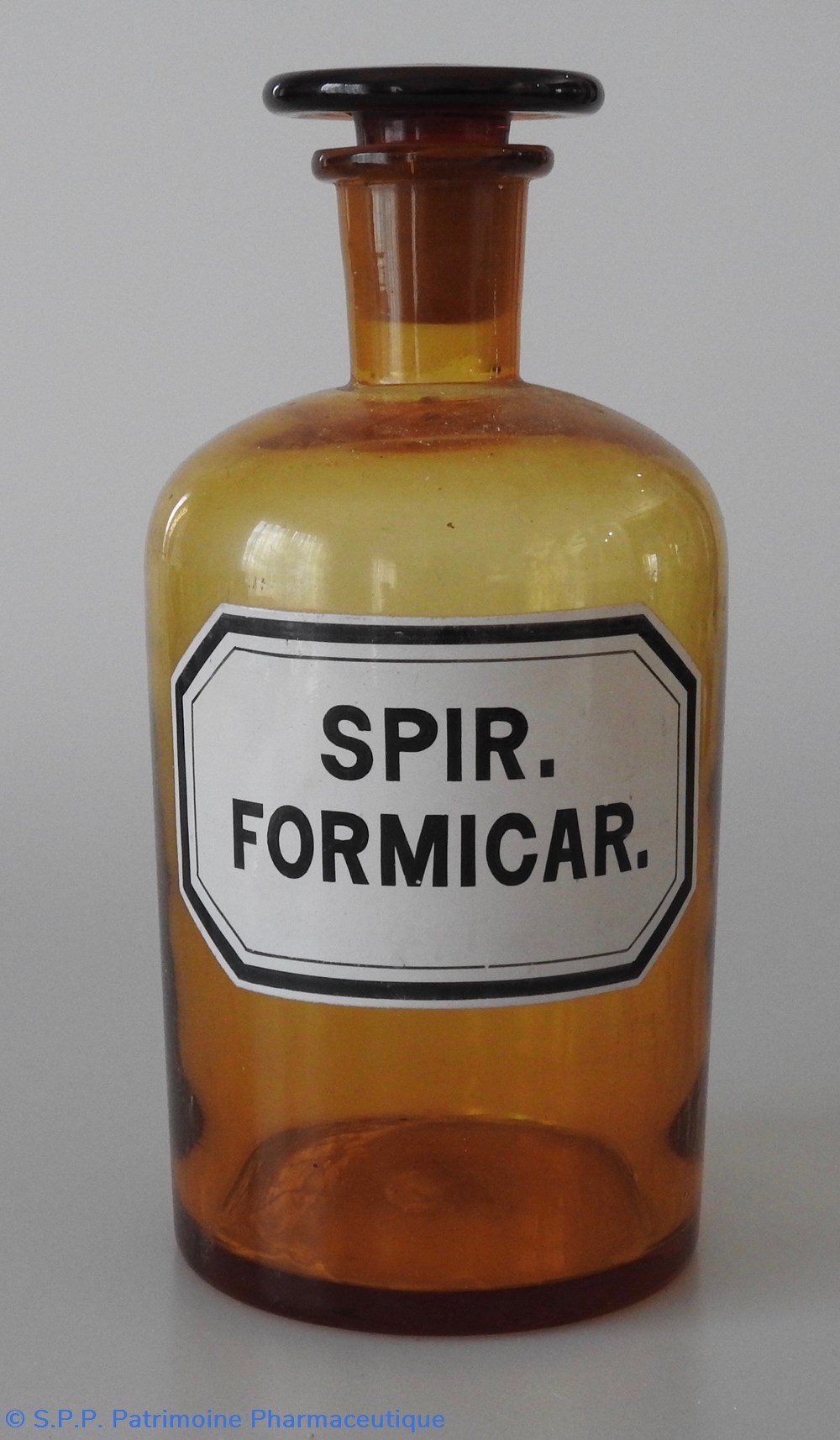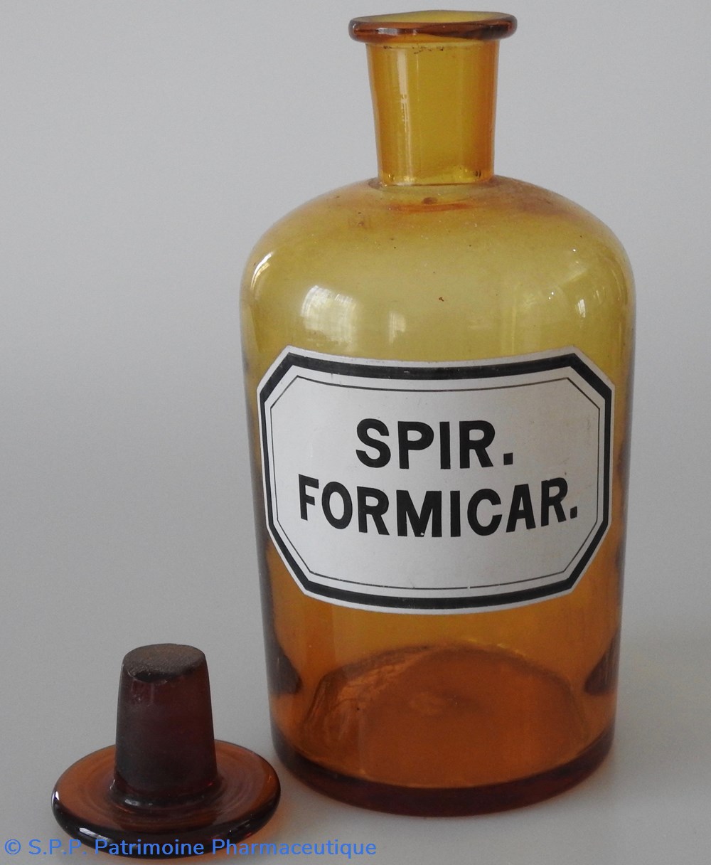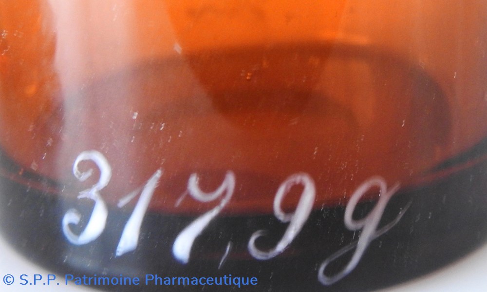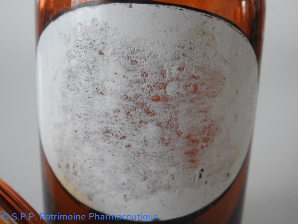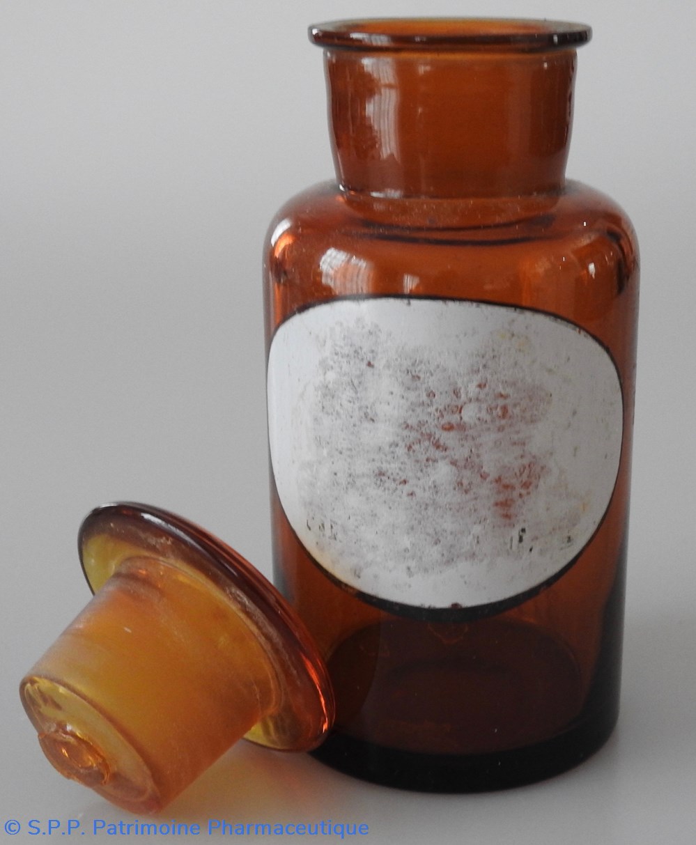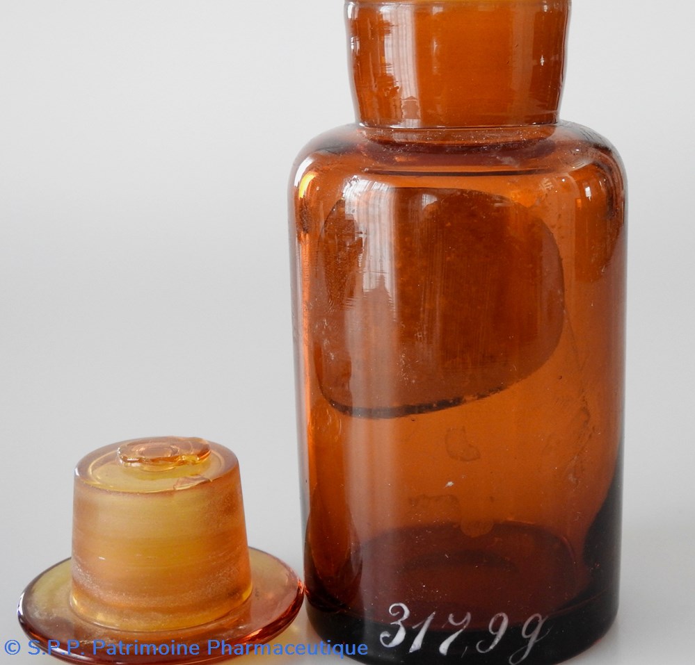 Flacon de pharmacie en verre ambré avec étiquette à lettres noires sur fond blanc. Bouchon fermant à l'émeri