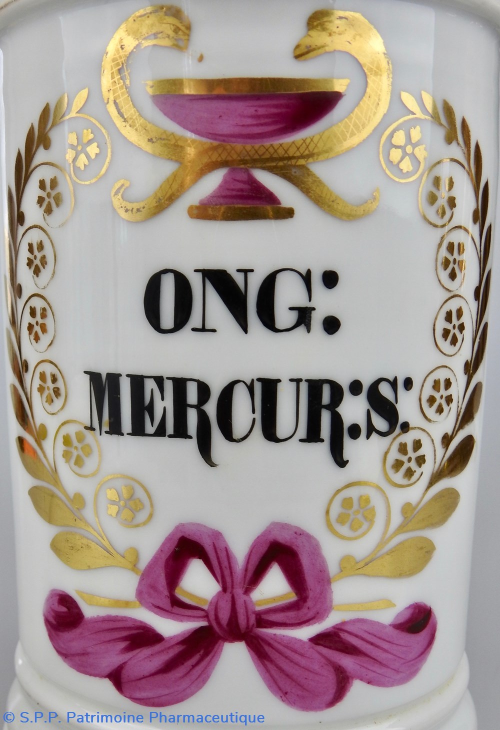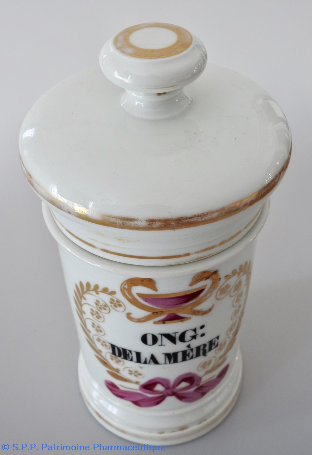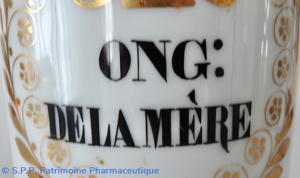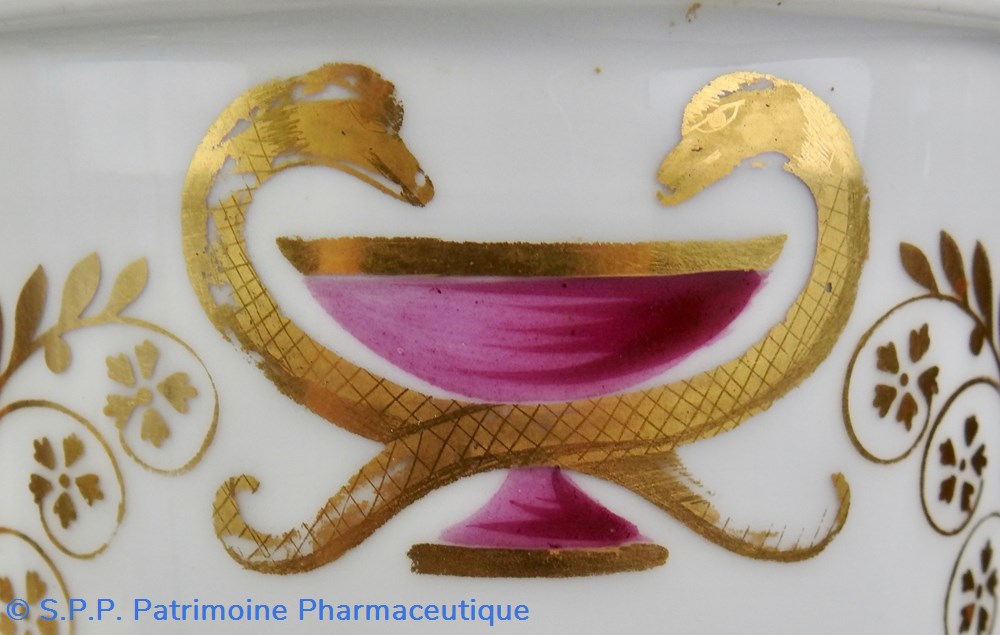 Pot de faïence blanche de très bon état général. L'inscription écrite en noir est entourée de couronnes de fleurs et de feuilles dorées. Les dorures ne sont pas endommagées. Ces couronnes se terminent dans la partie supérieure par une coupe d'Hygie rose entourée de serpents dorés de chaque coté. Dans la partie inférieure de l'inscription un grand noued rose enlace les tiges des feuilles et fleurs.
