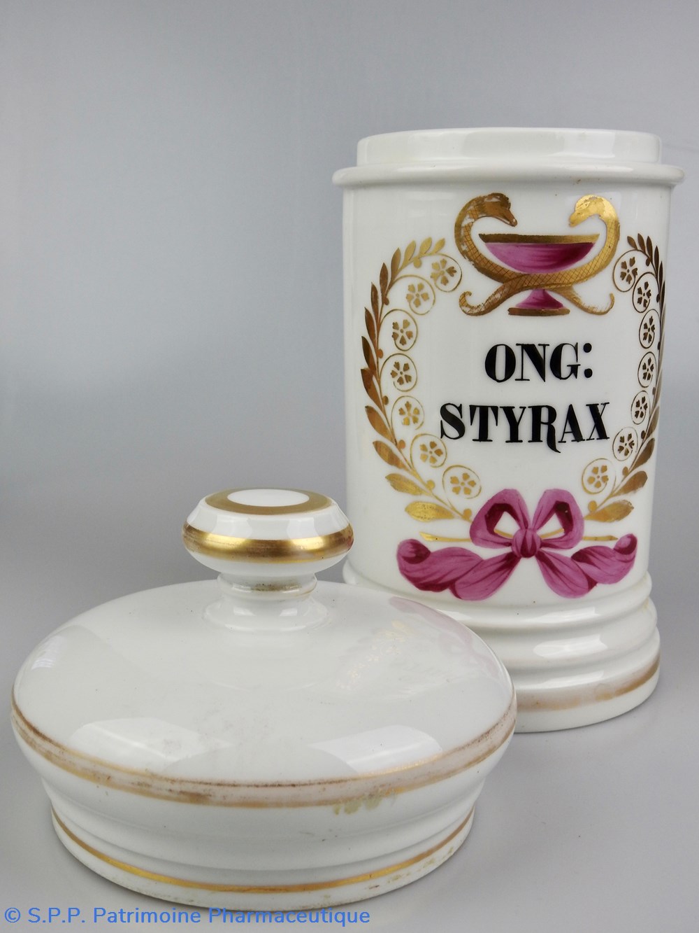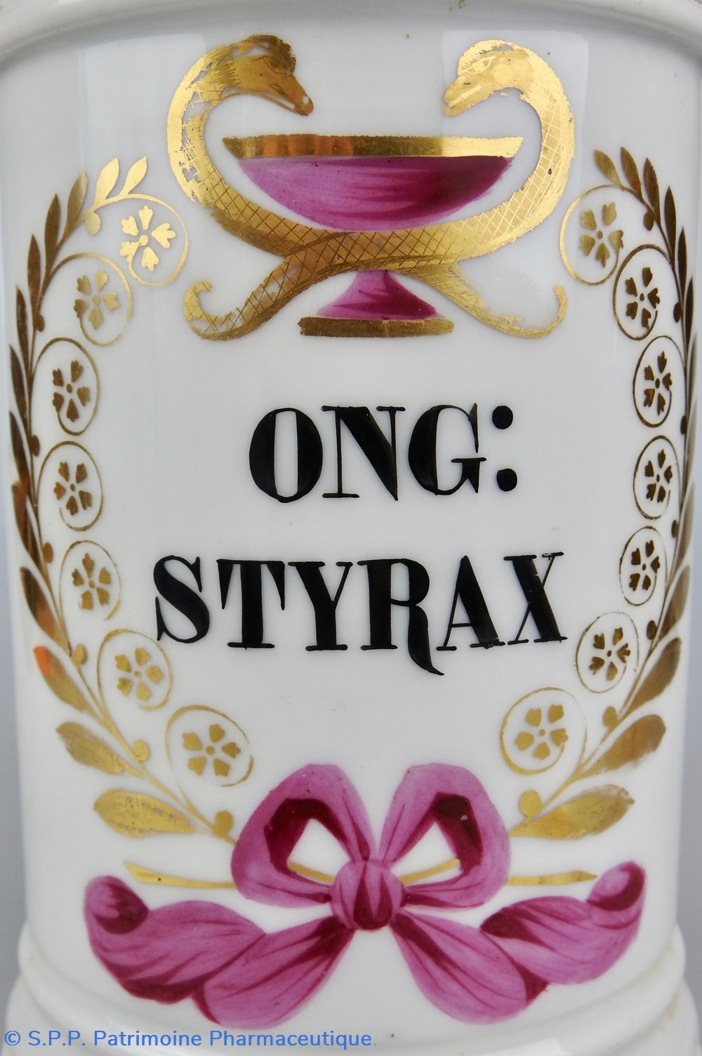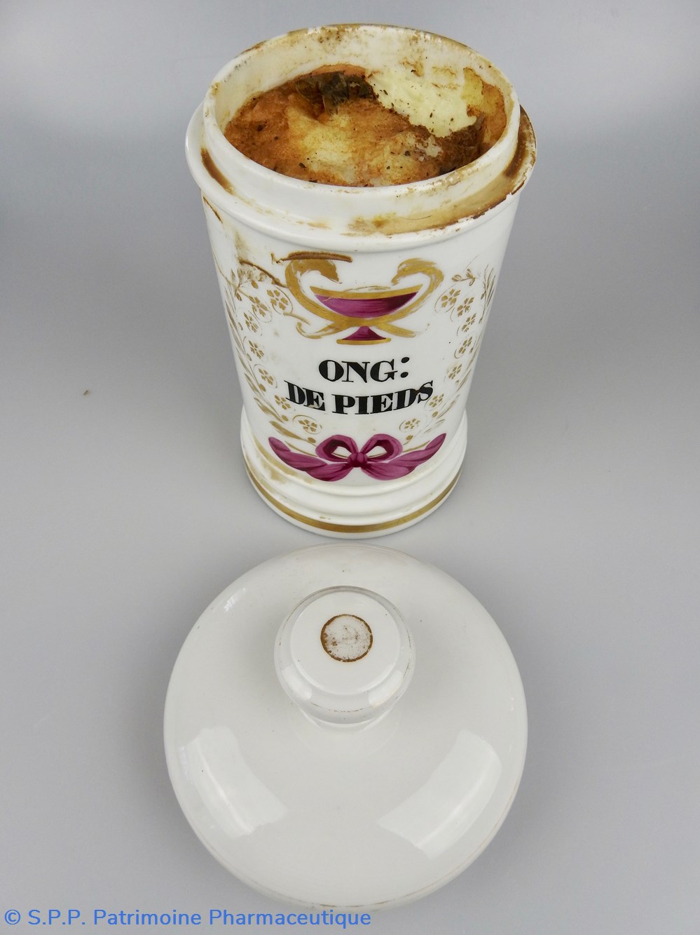Pot de faïence blanche de très bon état général. L'inscription écrite en noir est entourée de couronnes de fleurs et de feuilles dorées. Les dorures ne sont pas endommagées. Ces couronnes se terminent dans la partie supérieure par une coupe d'Hygie rose entourée de serpents dorés de chaque coté. Dans la partie inférieure de l'inscription un grand noued rose enlace les tiges des feuilles et fleurs.