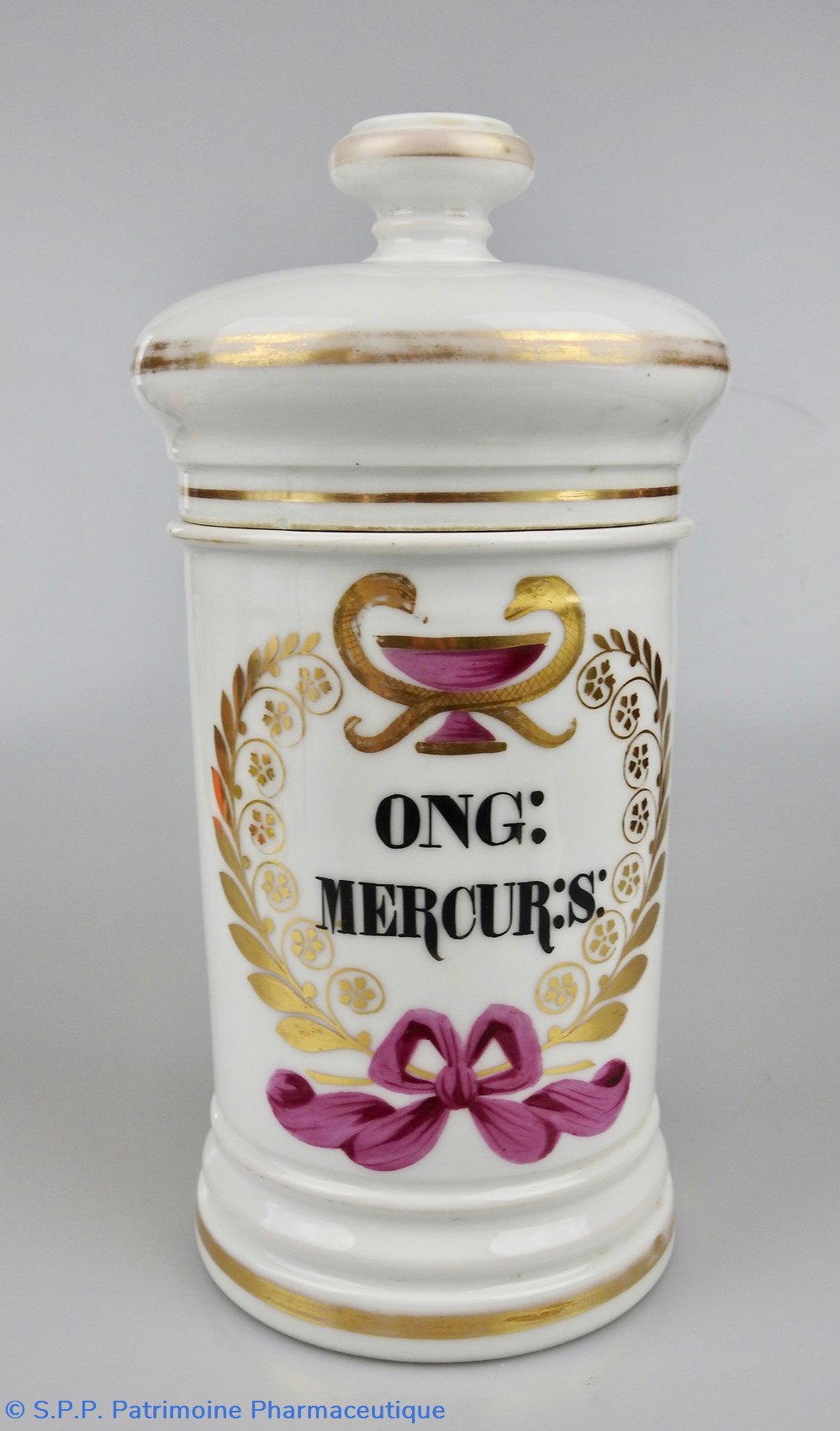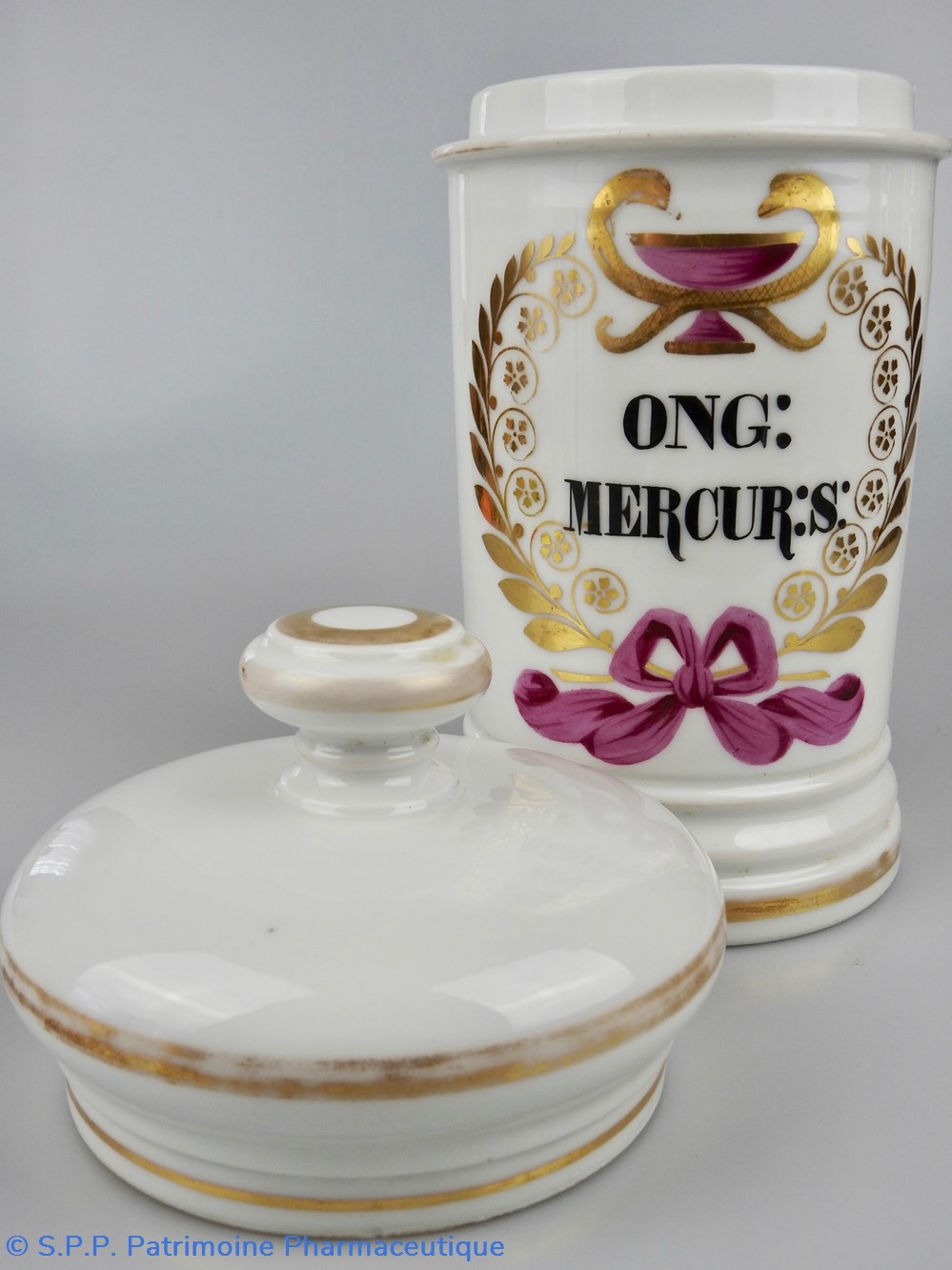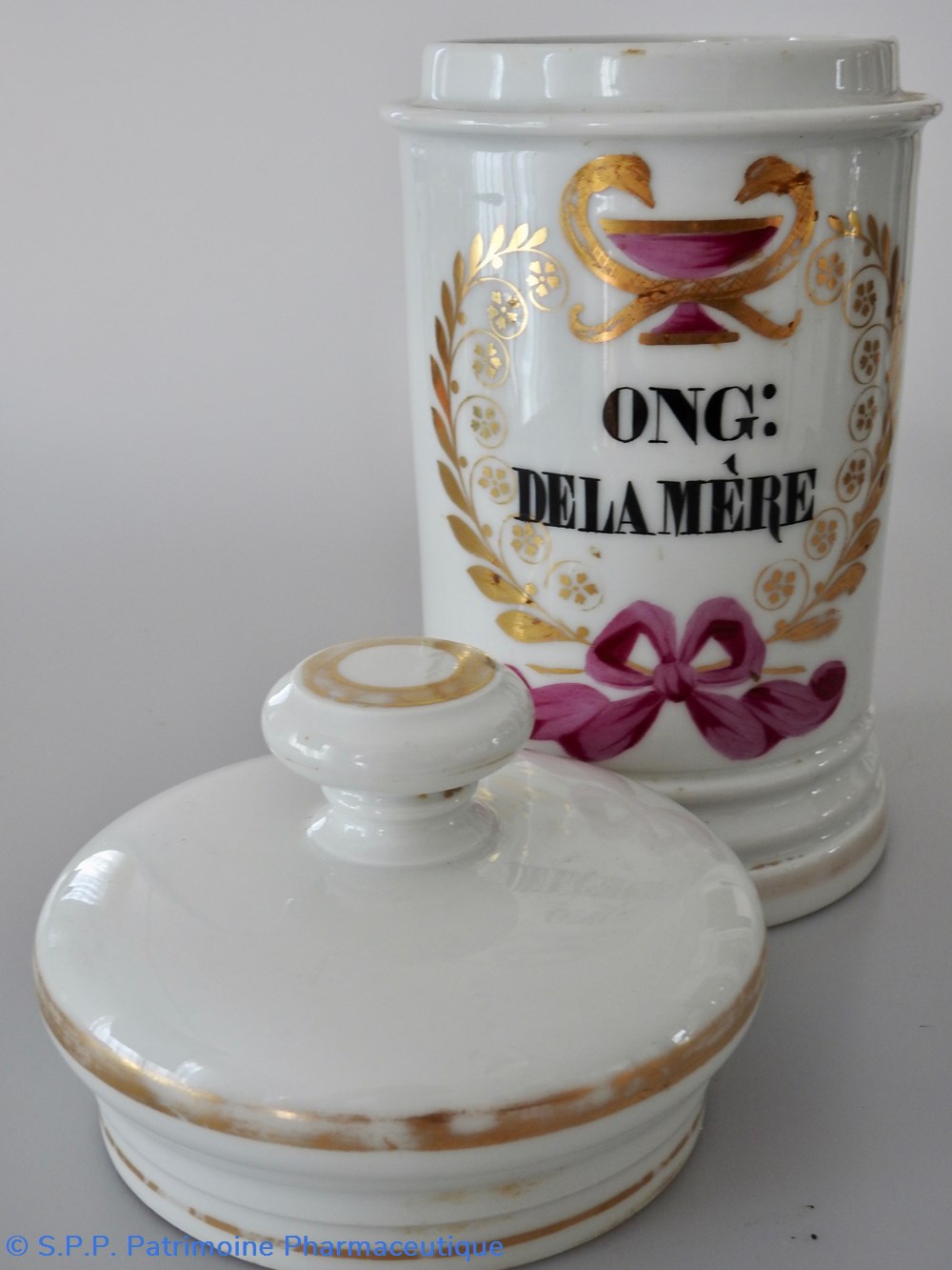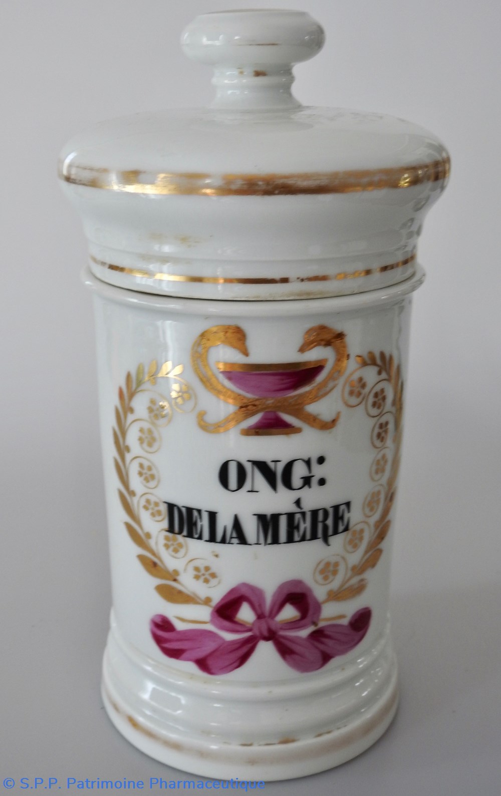Pot de faïence blanche de très bon état général. L'inscription écrite en noir est entourée de couronnes de fleurs et de feuilles dorées. Les dorures ne sont pas endommagées. Ces couronnes se terminent dans la partie supérieure par une coupe d'Hygie rose entourée de serpents dorés de chaque coté. Dans la partie inférieure de l'inscription un grand noeud rose enlace les tiges des feuilles et fleurs.