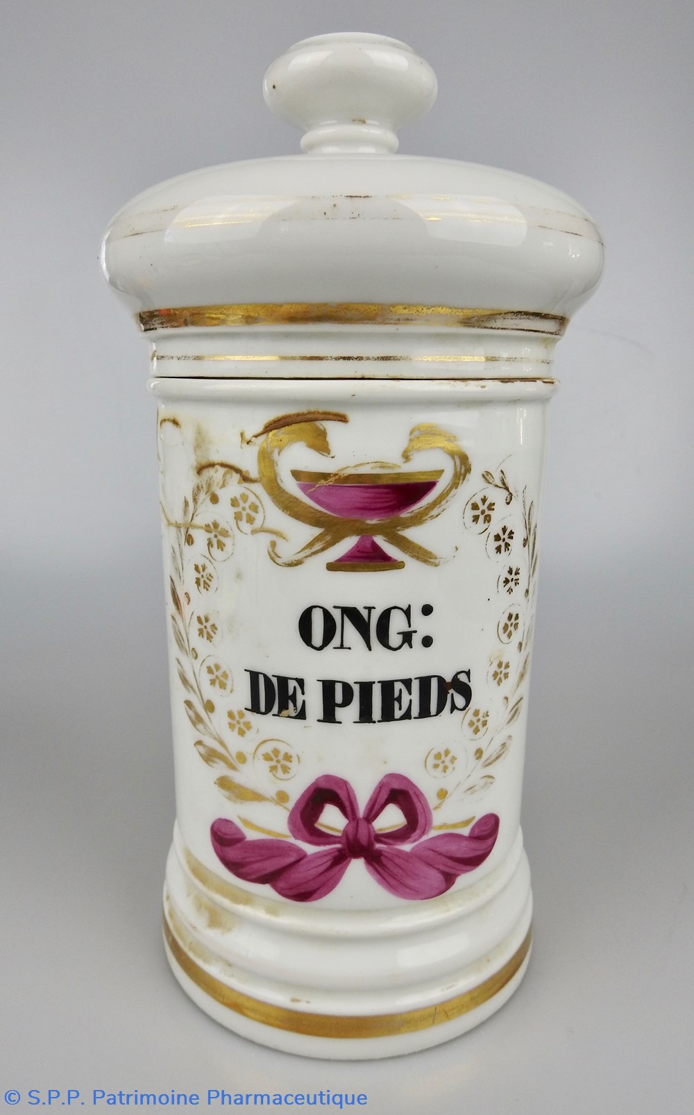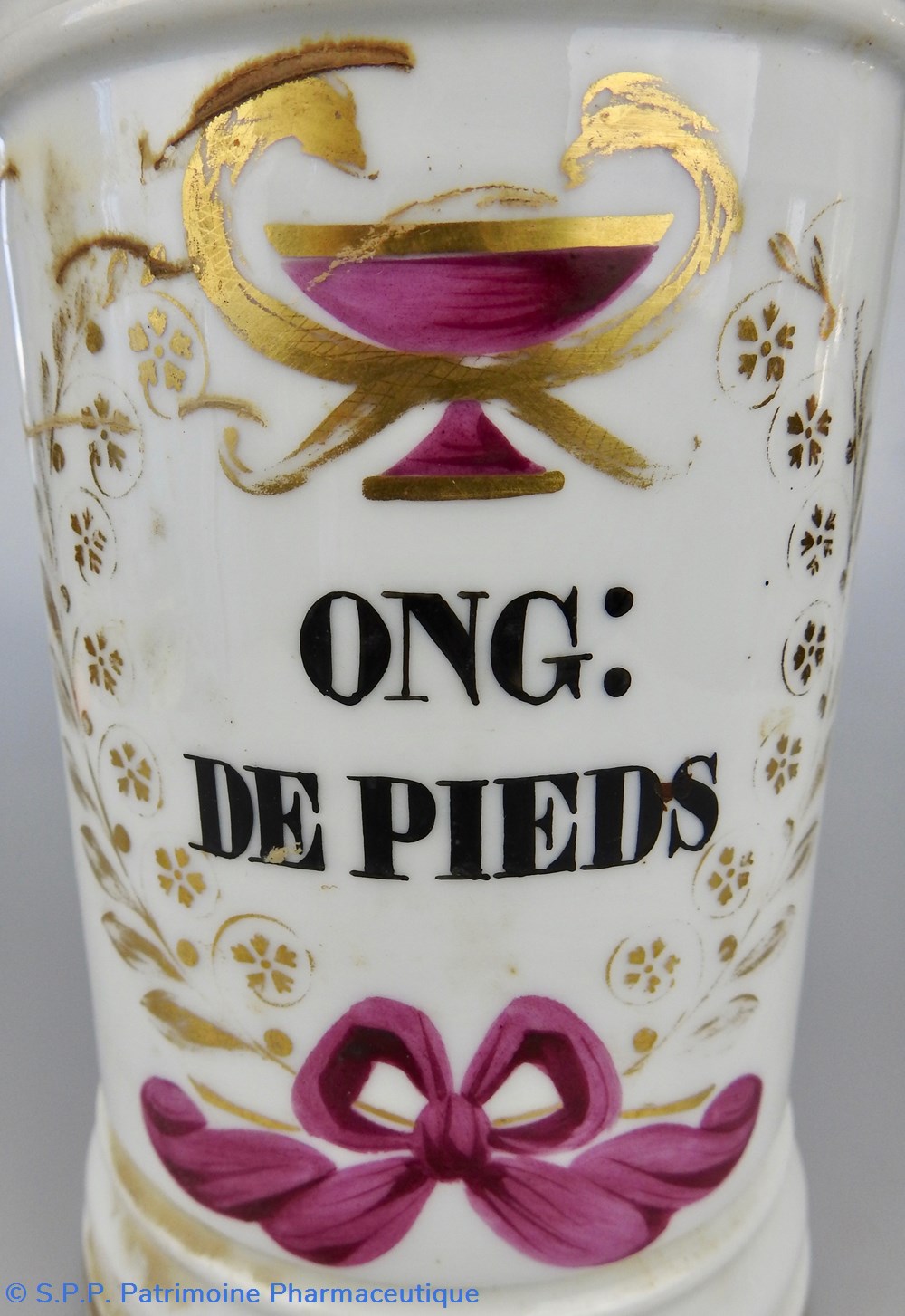 Pot de faïence blanche de très bon état général. L'inscription écrite en noir est entourée de couronnes de fleurs et de feuilles dorées. Les dorures ne sont pas endommagées. Ces couronnes se terminent dans la partie supérieure par une coupe d'Hygie rose entourée de serpents dorés de chaque coté. Dans la partie inférieure de l'inscription un grand noeud rose enlace les tiges des feuilles et fleurs. Dorures partiellement effacée vers la base