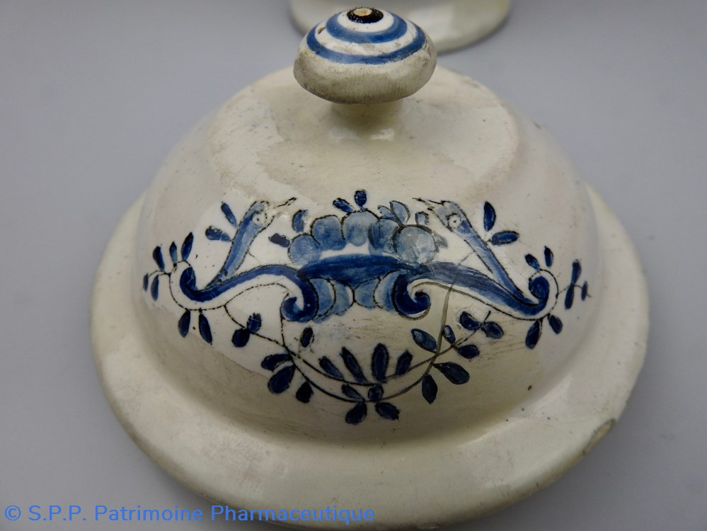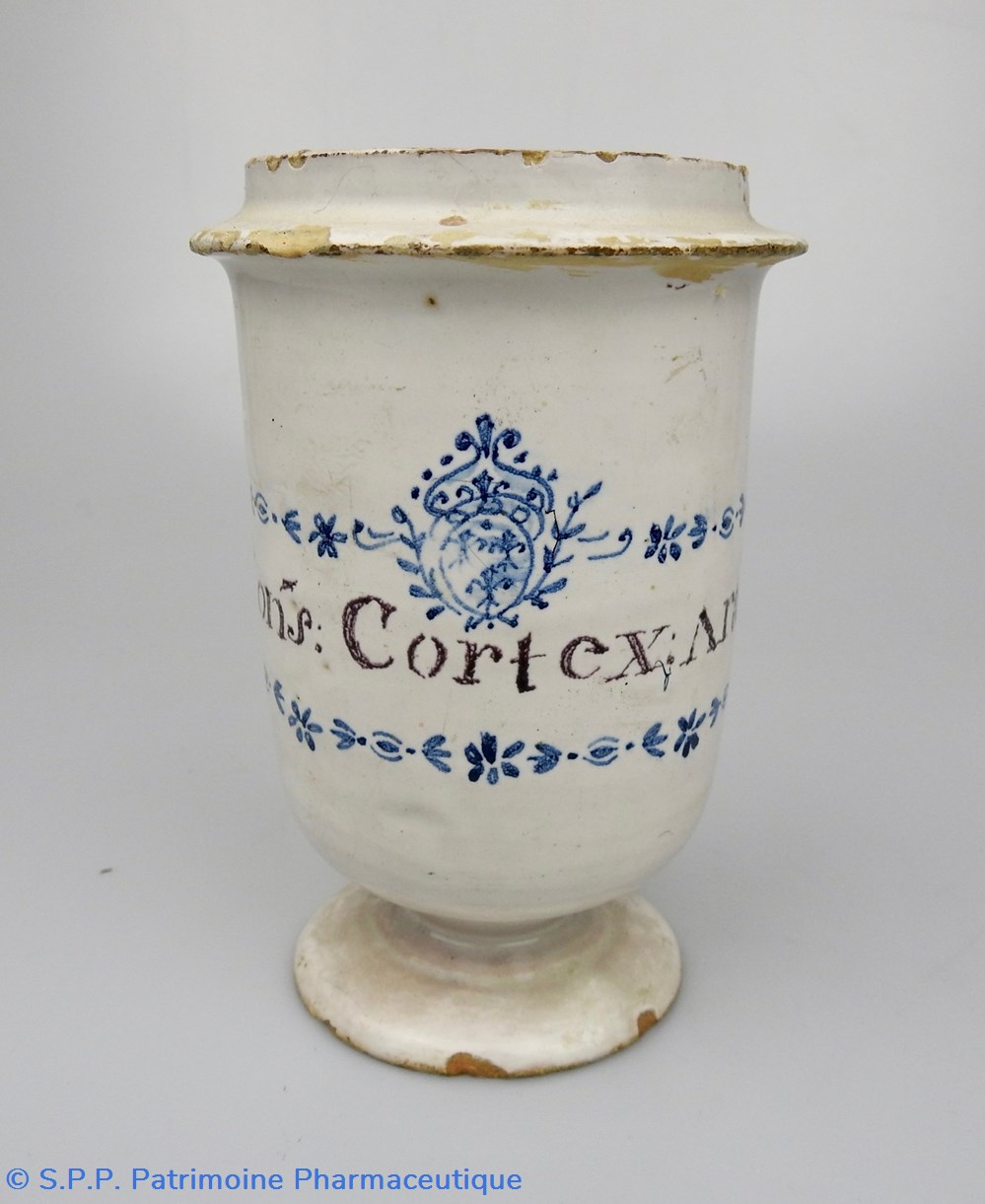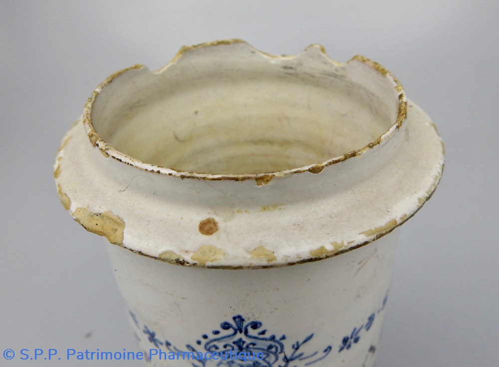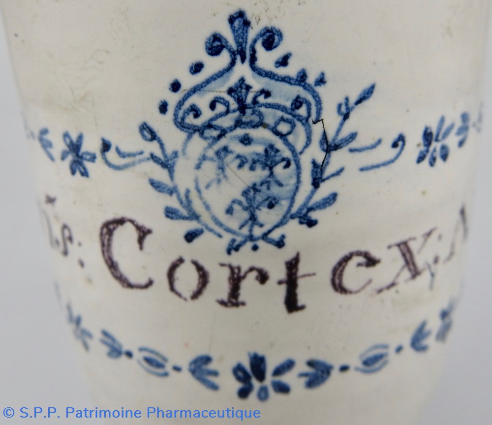 Pot-Canon de pharmacie à décor bleu. L'inscription manganèse : "Cons. Cortex.Aran." (Conserva.Cortex.Arantiorum) est à l'intérieur d'un rectangle composé de petites feuilles et fleurs en guirlande. Elle est surmontée d'un blason aux armes Royales de Royaume de France (3 Fleurs de Lys) lui-même rehaussé d'une fleur de lys. XVIIIème siècle. Ce pot devait être muni d'un couvercle relié au corps principal par des attaches en fer dont on voit les trous au dos du pot à la base de la rainure qui supportait le couvercle. Des accidents sont visibles sur la partie supérieur où se logeait le couvercle et quelques éclats sur la base du piédouche. Hauteur 14 cm. Diamètre à la base : 7,5 cm. Diamètre de l'ouverture : 7,5 cm.